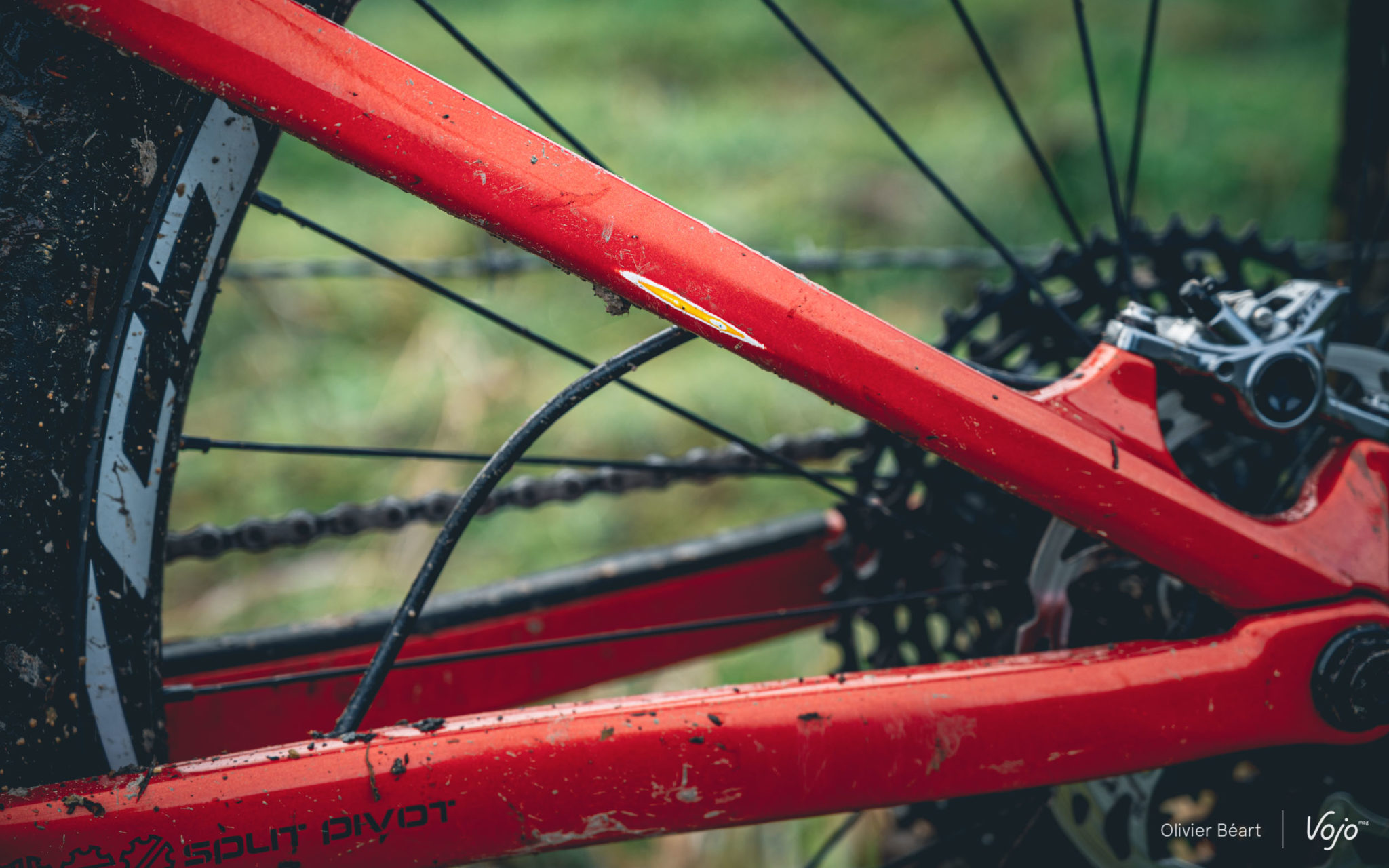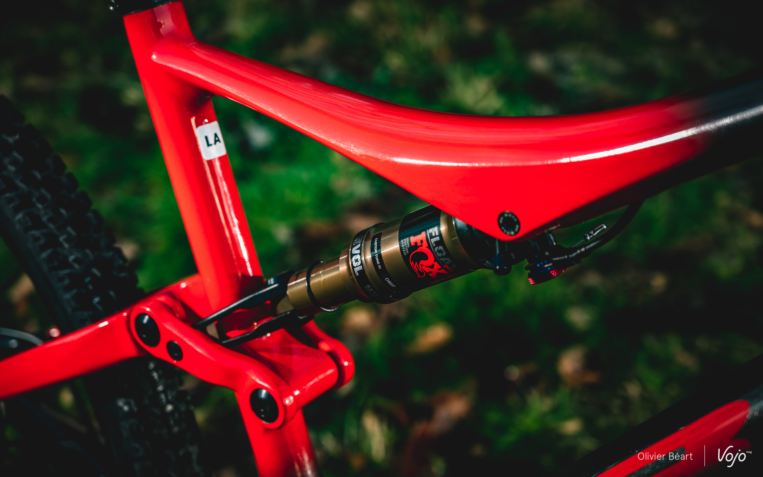 Moins évident, on remarque que le point de pivot principal a été déplacé vers l’avant. Il ne semble pas avoir été rehaussé, ce qui pourrait conduire à une cinématique avec un peu moins d’anti-squat (voir notre lexique), mais sans plus d’informations, difficile de tirer de véritables conclusions.