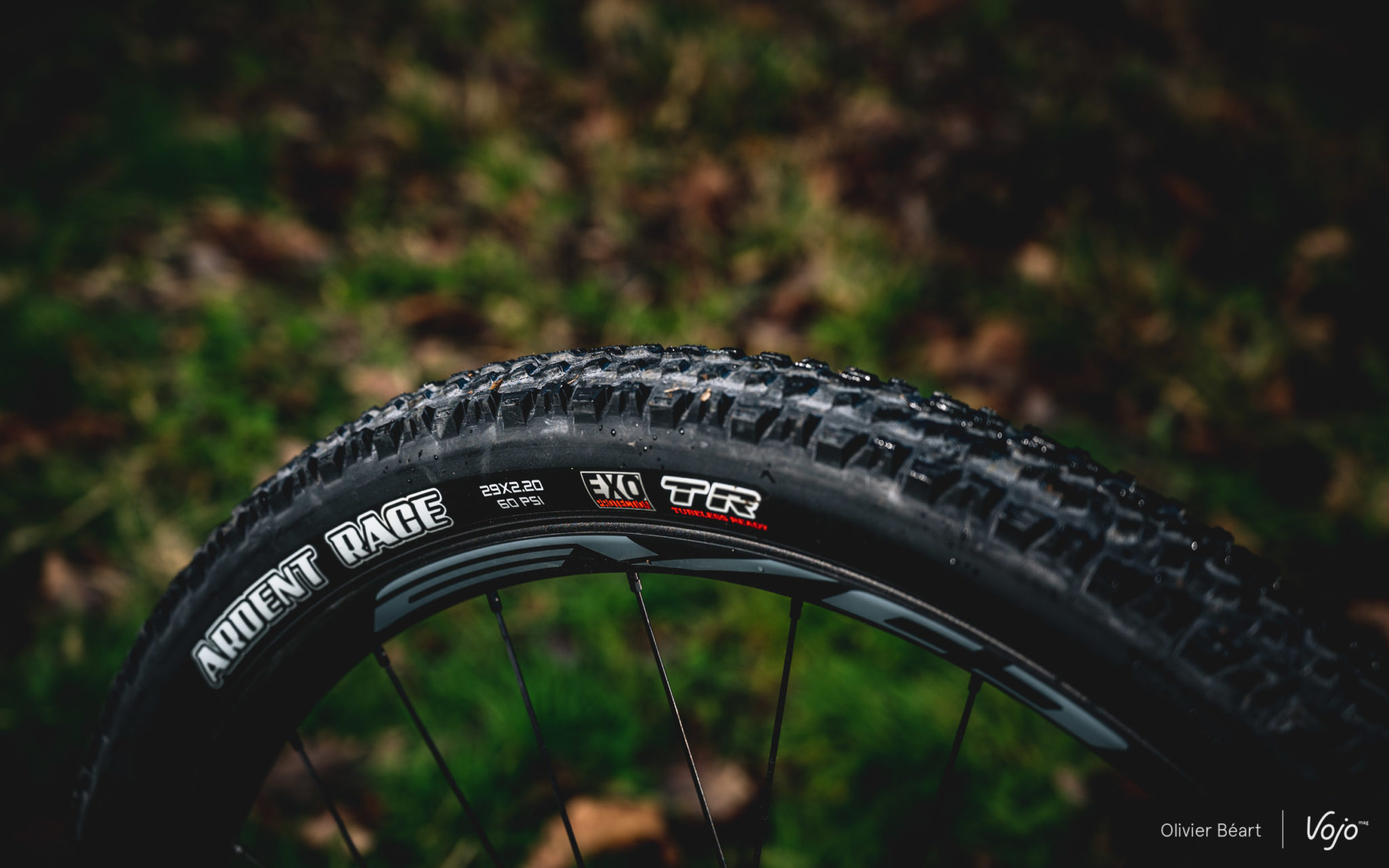 Du côté du BH Lynx Race Evo LT 9.0, la marque a fait le choix d’un montage plus classique. On trouve des jantes alu pour rester dans un budget plus maîtrisé, mais surtout, elles sont en 25mm de large et chaussées de pneus en 2.25″ de largeur. Un choix qui peut surprendre car on rencontre habituellement des pneus de plus forte section sur les modèles à plus grand débattement, mais BH explique son choix par une volonté de rendre son modèle LT plus polyvalent et « grand public » que les versions les plus haut de gamme du modèle XC, pensées pour être des répliques des vélos utilisés par leurs coureurs sponsorisés sur les compétitions mondiales. Par contre, si la section des pneus est plus faible sur le modèle LT, on est sur un profil Maxxis Ardent Race plus cramponné et accrocheur.