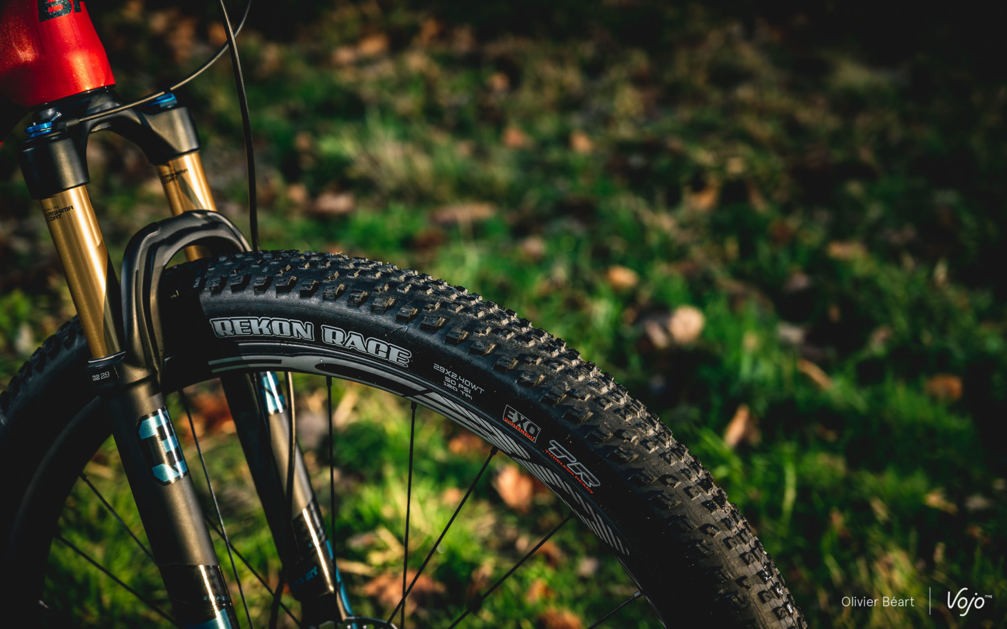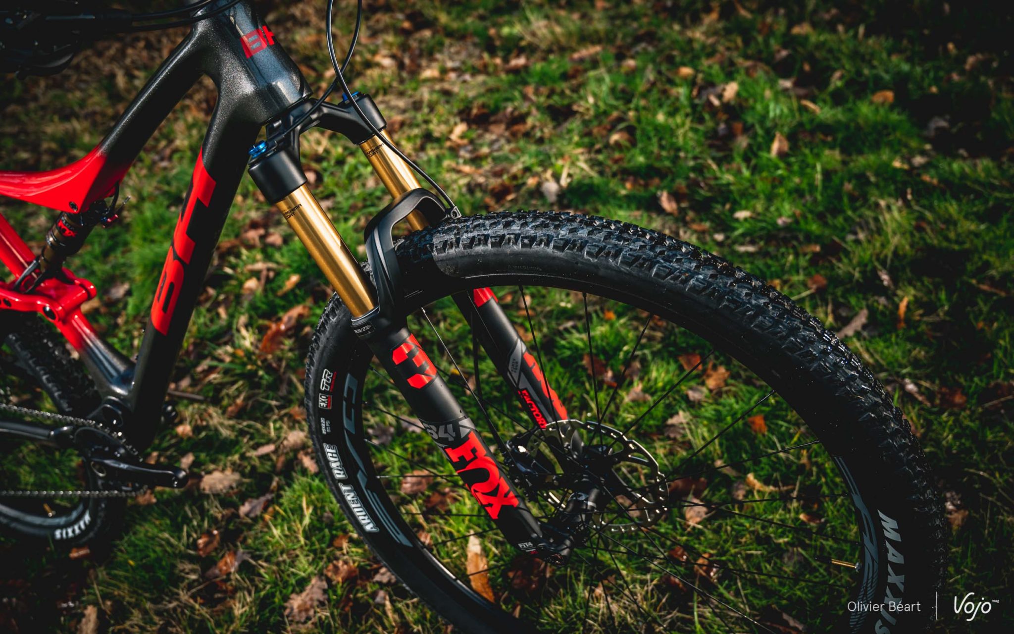 Une vraie différence de taille se remarque par contre au niveau des roues. Sur le BH Lynx Race Evo 9.5, elles sont en carbone, conçues par BH et sont chaussées de pneus Maxxis Rekon Race en carcasse Exo. On note que la marque a fait un choix assez radical pour le train roulant, avec des jantes en 30 mm de largeur interne et des pneus en section de 2,4″. Un montage qu’on a plus l’habitude de voir en trail / enduro mais qui a aussi du sens en XC, avec des crampons à profil bas. C’est un choix prisé par de plus en plus de compétiteurs de haut niveau en XC pour favoriser la vitesse de franchissement et le passage de la puissance au sol. Le grand ballon apporte du confort sur les circuits très durs et rapides alors que la résistance au roulement est meilleure qu’avec un montage plus petit (25 mm et 2.25″ par exemple). Cependant, ce montage n’a pas que des avantages comme nous le verrons sur le terrain…