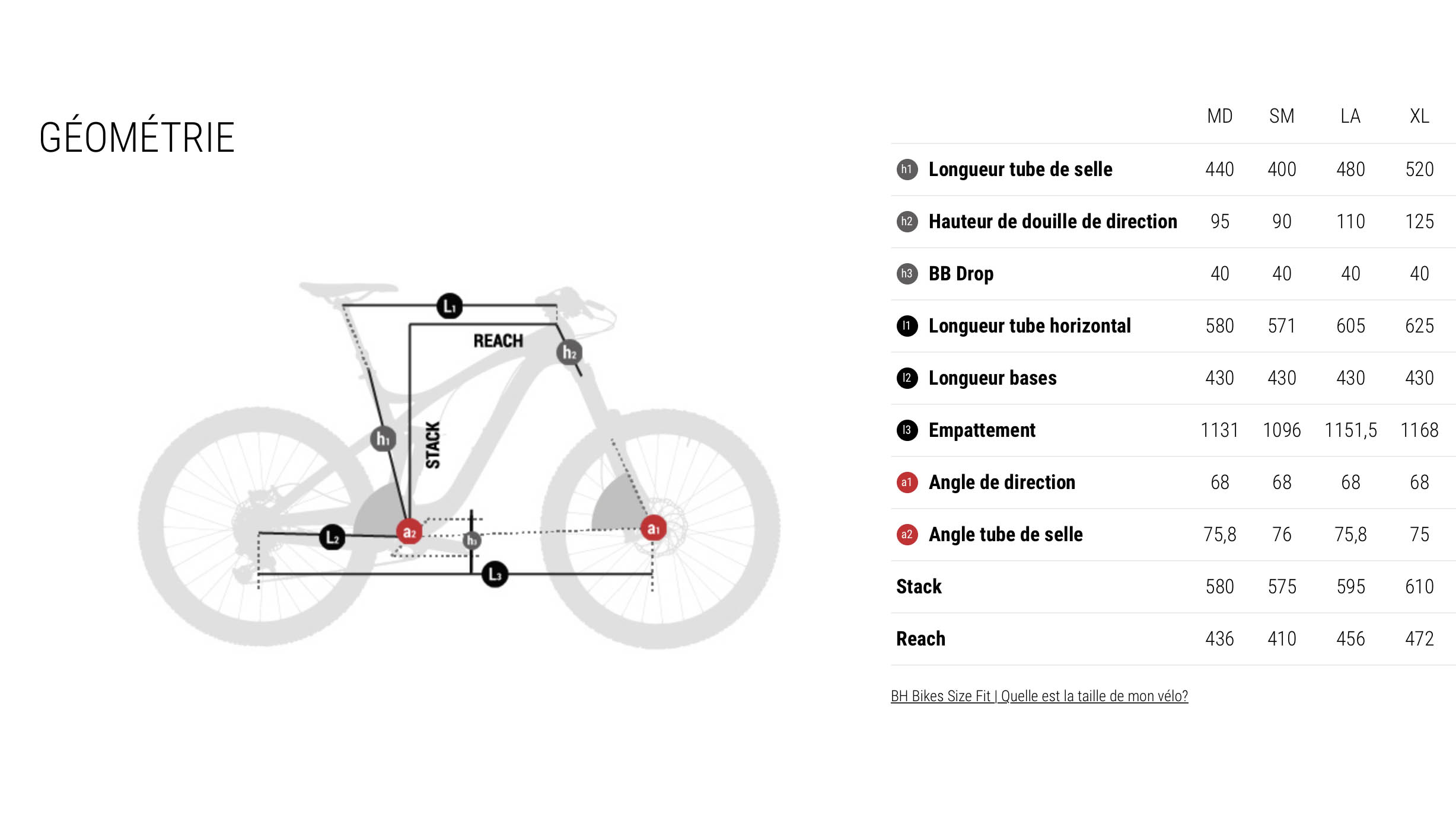 Côté géométrie, c’est à nouveau une histoire de beaucoup et de très peu. En effet, l’angle du tube de selle se redresse sensiblement (+1,5 à 2,5° selon la taille) et le reach s’allonge assez généreusement (+12 à 14 mm), mais les autres cotes évoluent beaucoup moins : -0,5° pour l’angle de direction (68°), + 5 mm pour les bases (430 mm). BH a vraisemblablement voulu conserver l’équilibre de sa plateforme, déjà très performante dans le technique et en descente, en corrigeant simplement quelques points relatifs à la position du pilote.