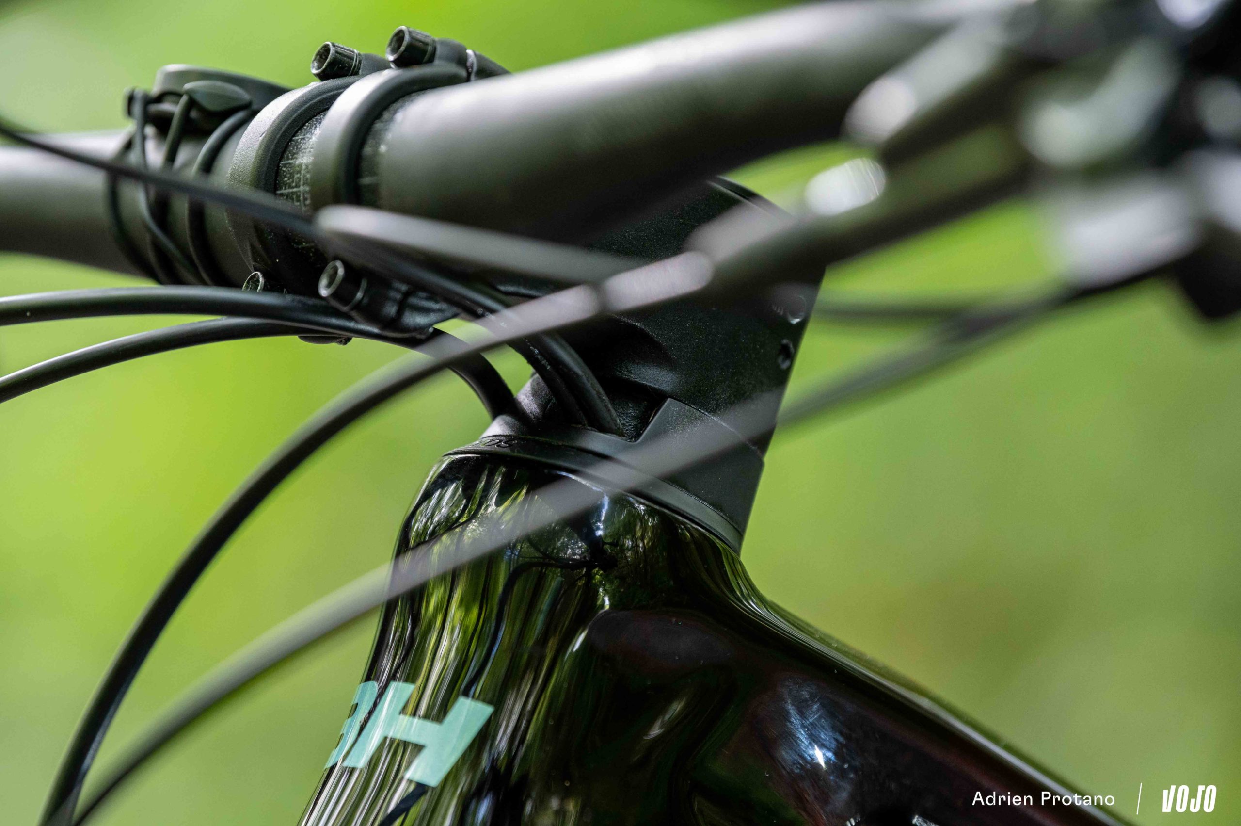 Pas de changement à noter du côté du passage interne des gaines. L’entrée s’effectue toujours au niveau du jeu de direction Acros BlockLock avec butées, tandis que les gaines ne sont pas guidées à l’intérieur du cadre mais simplement protégées par des fourreaux en mousse comme cela est souvent le cas sur les modèles de cross-country. Pour rappel, ce jeu de direction avec butées bloque la rotation du cintre à 150° (75° de chaque côté) pour éviter d’endommager les gaines ou le cadre en cas de chute.