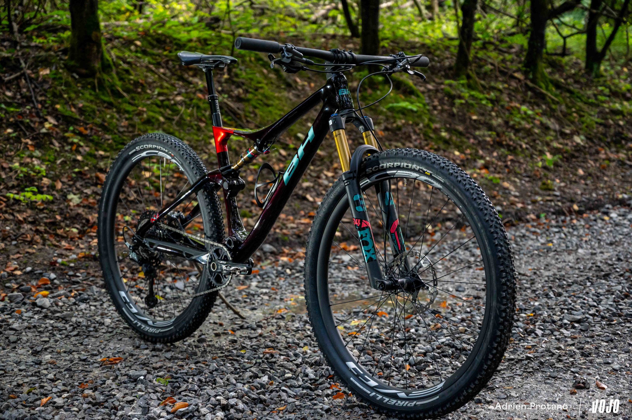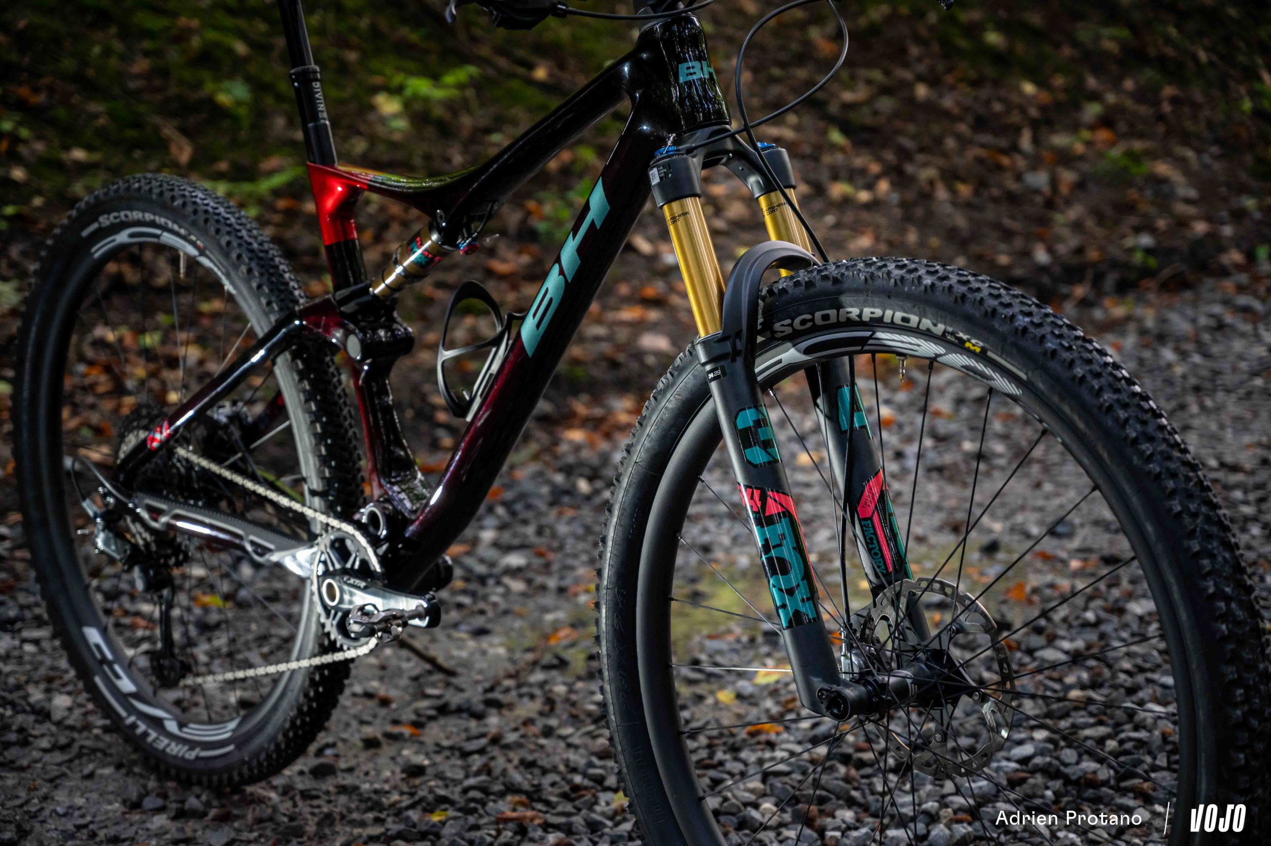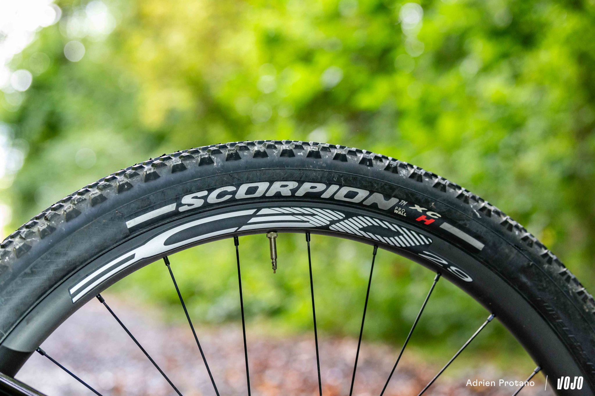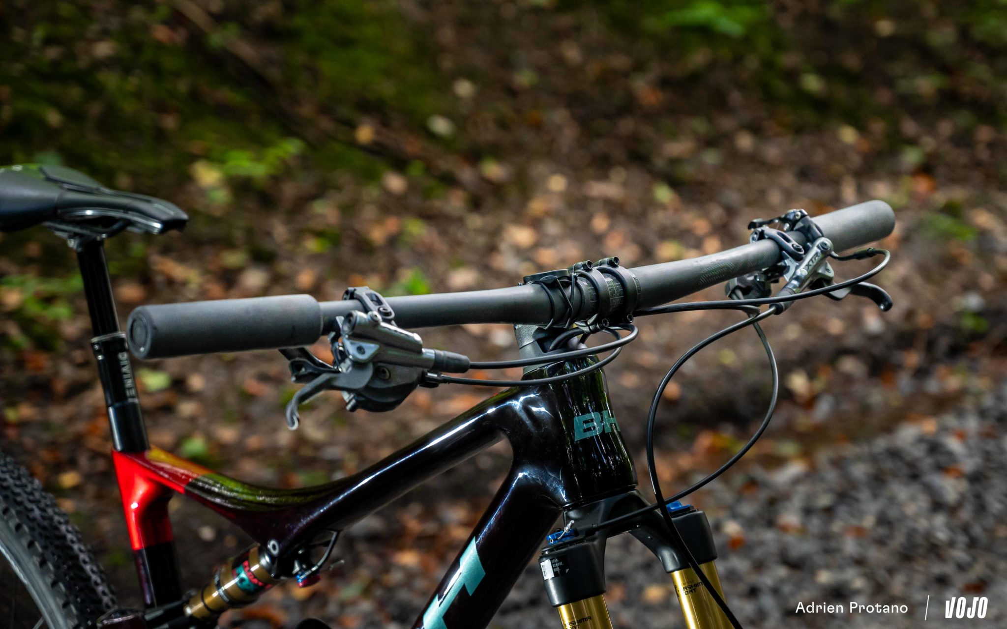 Le train roulant est composé de roues carbone de 30 mm de largeur interne, propres à la marque, à savoir les BH Evo carbone. Par le passé, nous avons pu critiquer les roues BH, mais force est de reconnaître que les dernières générations sont tout à fait agréables à rouler, même s’il existe encore plus réactif, plus léger et/ou plus tolérant sur le marché. Ces roues sont chaussées de pneus Pirelli Scorpion XC M et XC H en 2.4 de section, plus polyvalents que les XC RC. Ils nous ont très agréablement surpris lors de ce test !