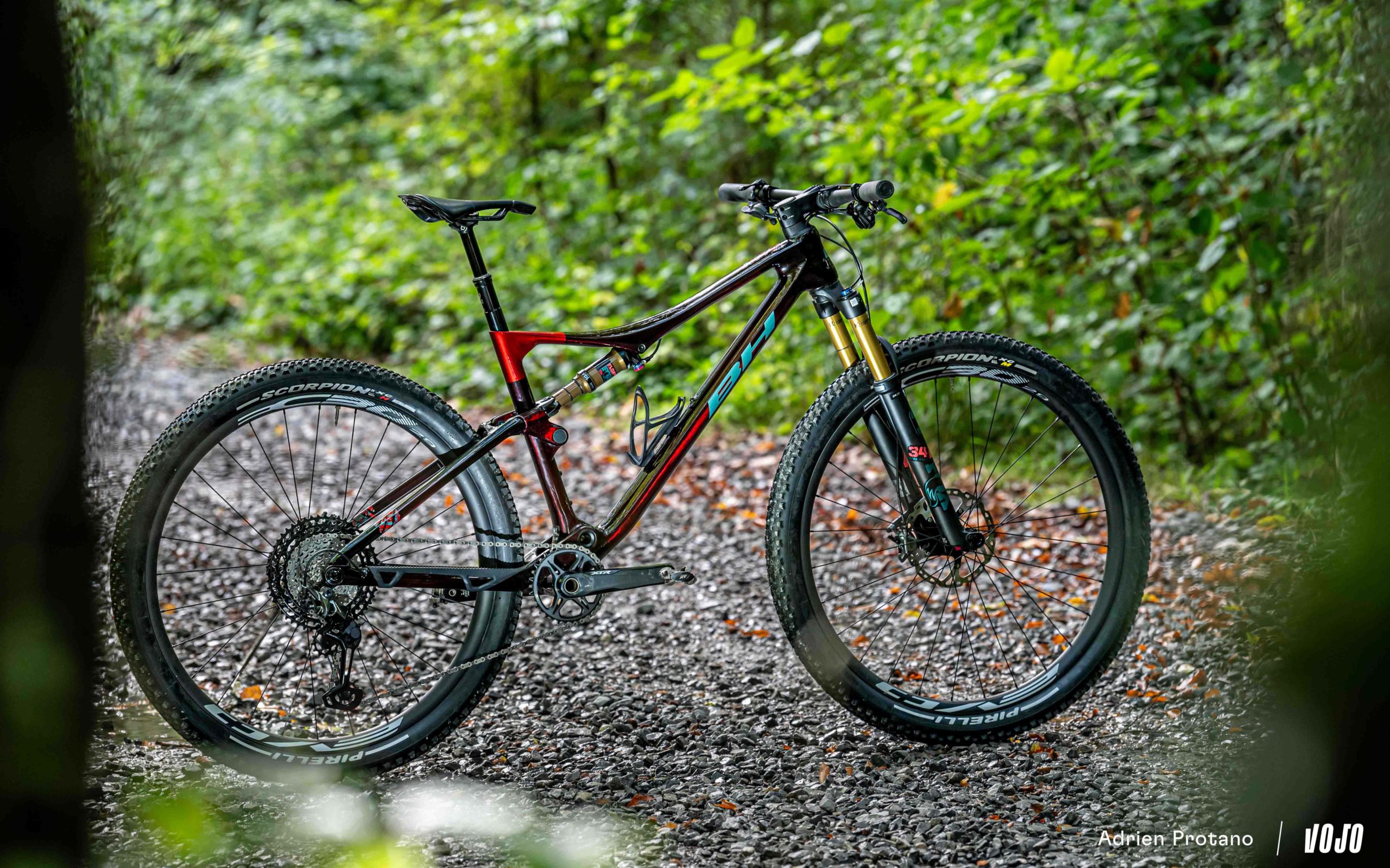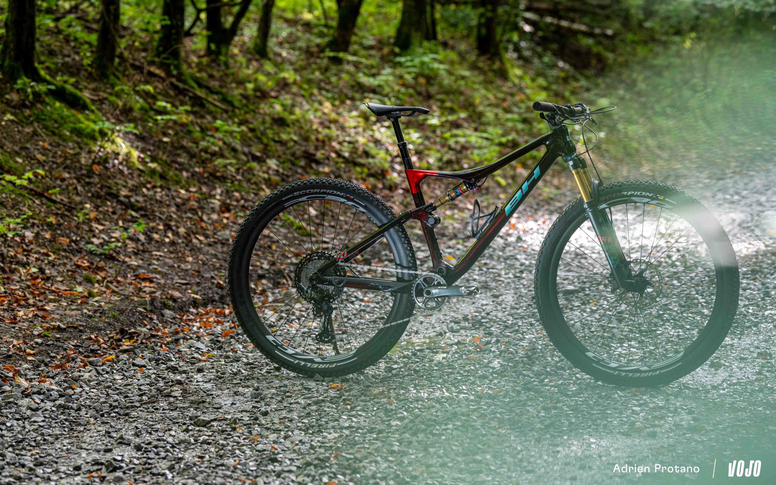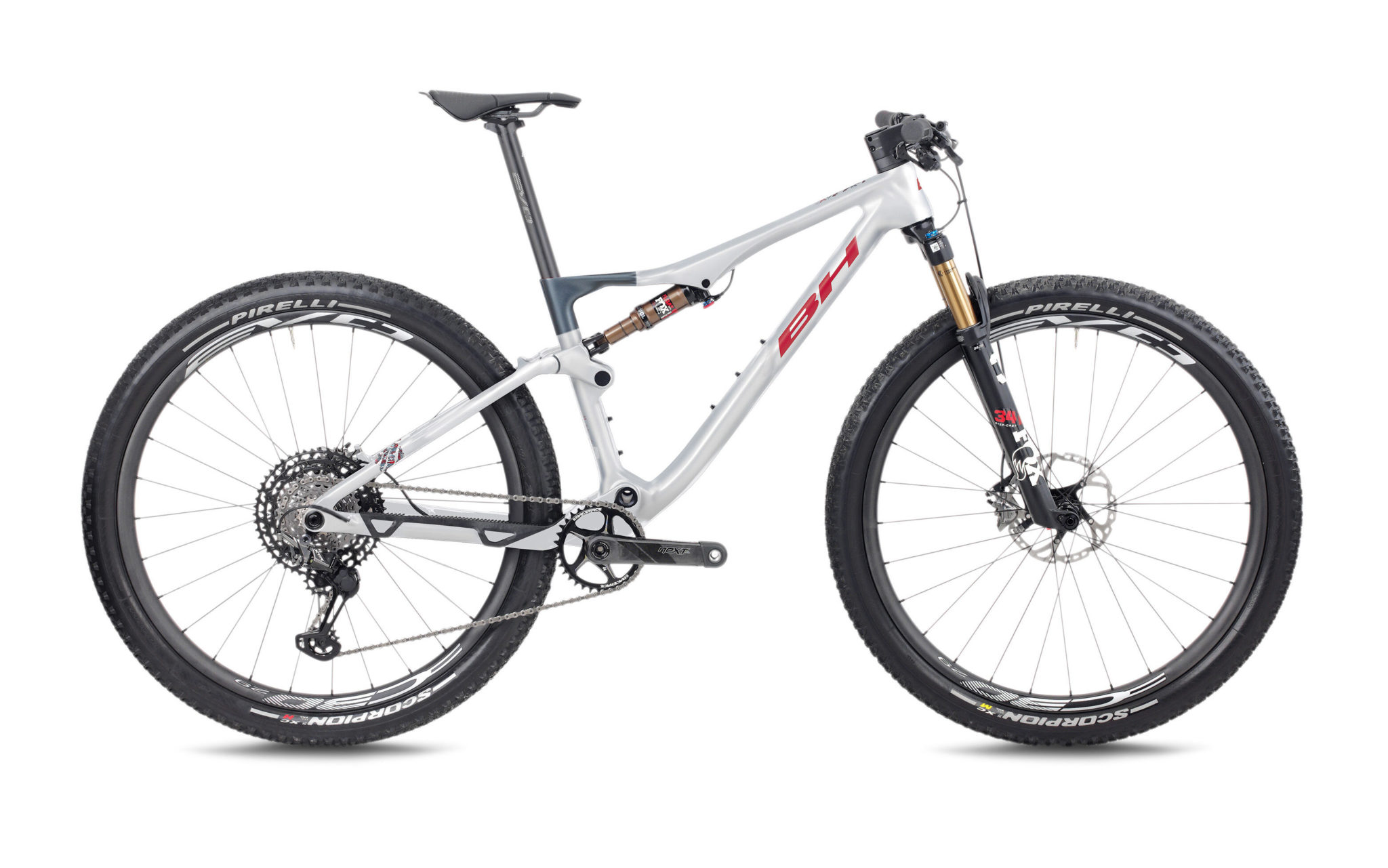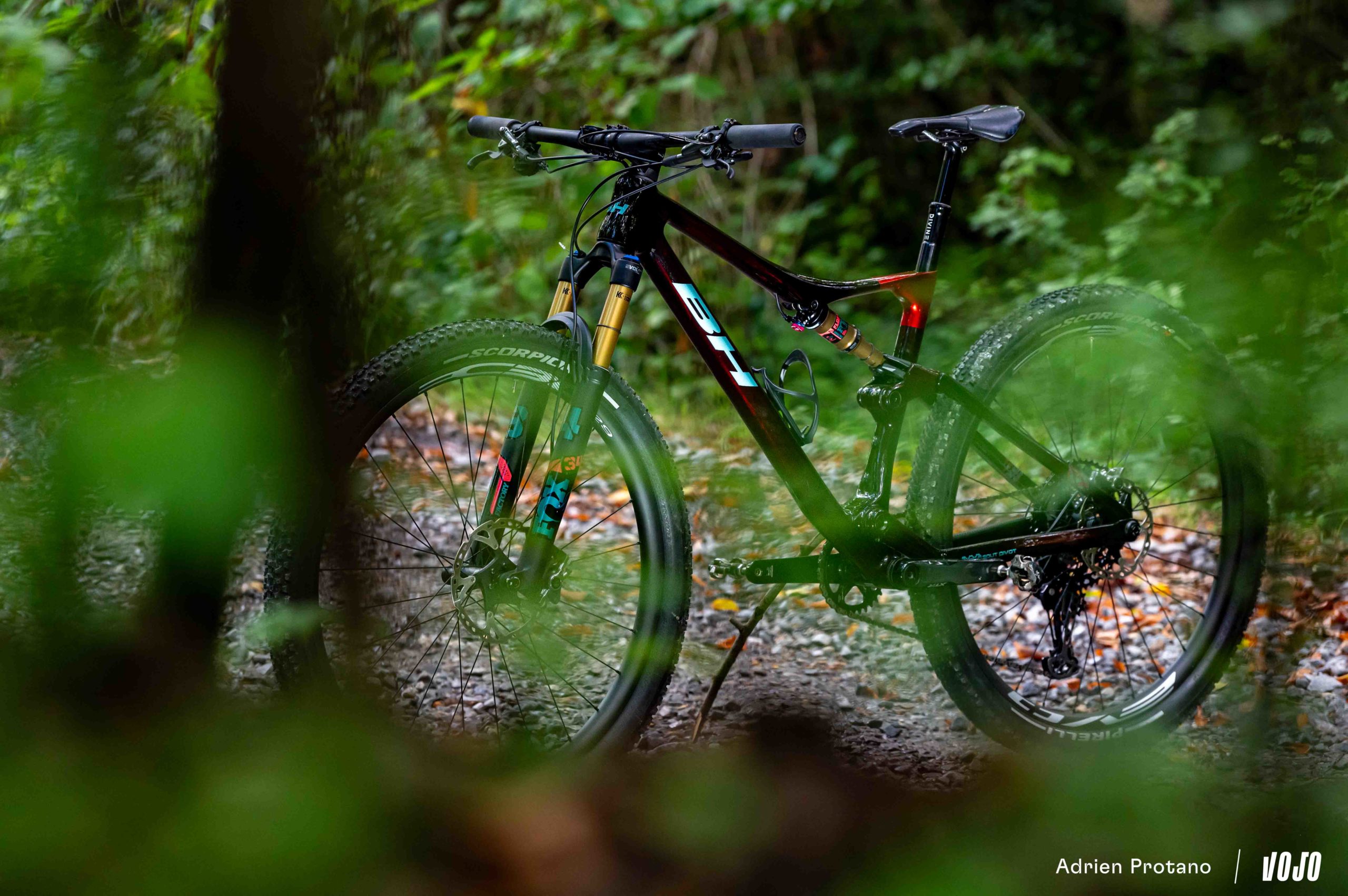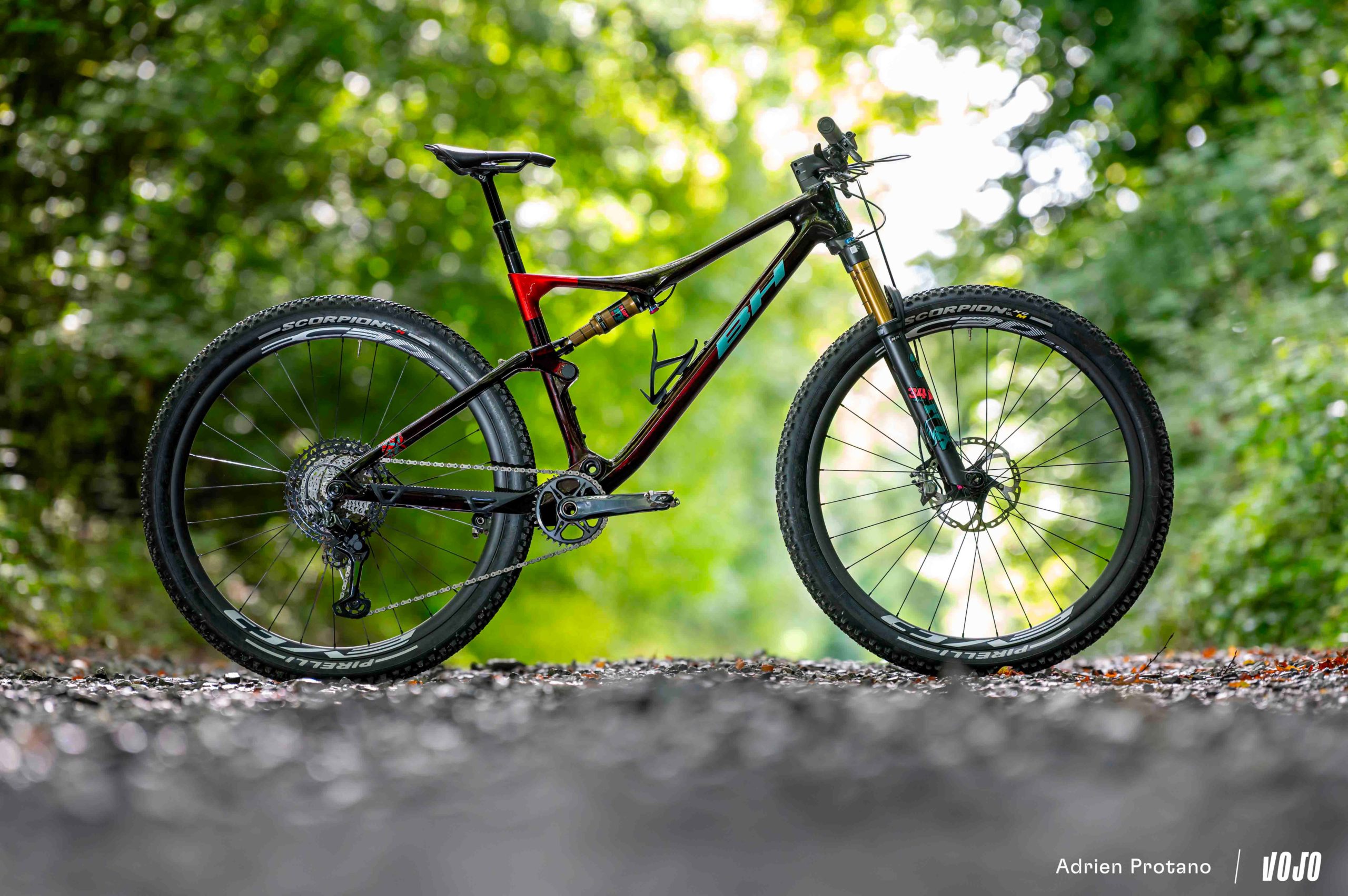 Le train roulant est composé de roues carbone de 30 mm de largeur interne, propres à la marque, à savoir les BH Evo carbone. Par le passé, nous avons pu critiquer les roues BH, mais force est de reconnaître que les dernières générations sont tout à fait agréables à rouler, même s’il existe encore plus réactif, plus léger et/ou plus tolérant sur le marché. Ces roues sont chaussées de pneus Pirelli Scorpion XC M et XC H en 2.4 de section, plus polyvalents que les XC RC. Ils nous ont très agréablement surpris lors de ce test !