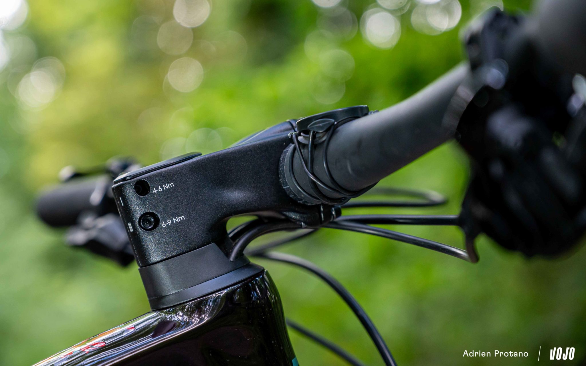 Pas de changement à noter du côté du passage interne des gaines. L’entrée s’effectue toujours au niveau du jeu de direction Acros BlockLock avec butées, tandis que les gaines ne sont pas guidées à l’intérieur du cadre mais simplement protégées par des fourreaux en mousse comme cela est souvent le cas sur les modèles de cross-country. Pour rappel, ce jeu de direction avec butées bloque la rotation du cintre à 150° (75° de chaque côté) pour éviter d’endommager les gaines ou le cadre en cas de chute.