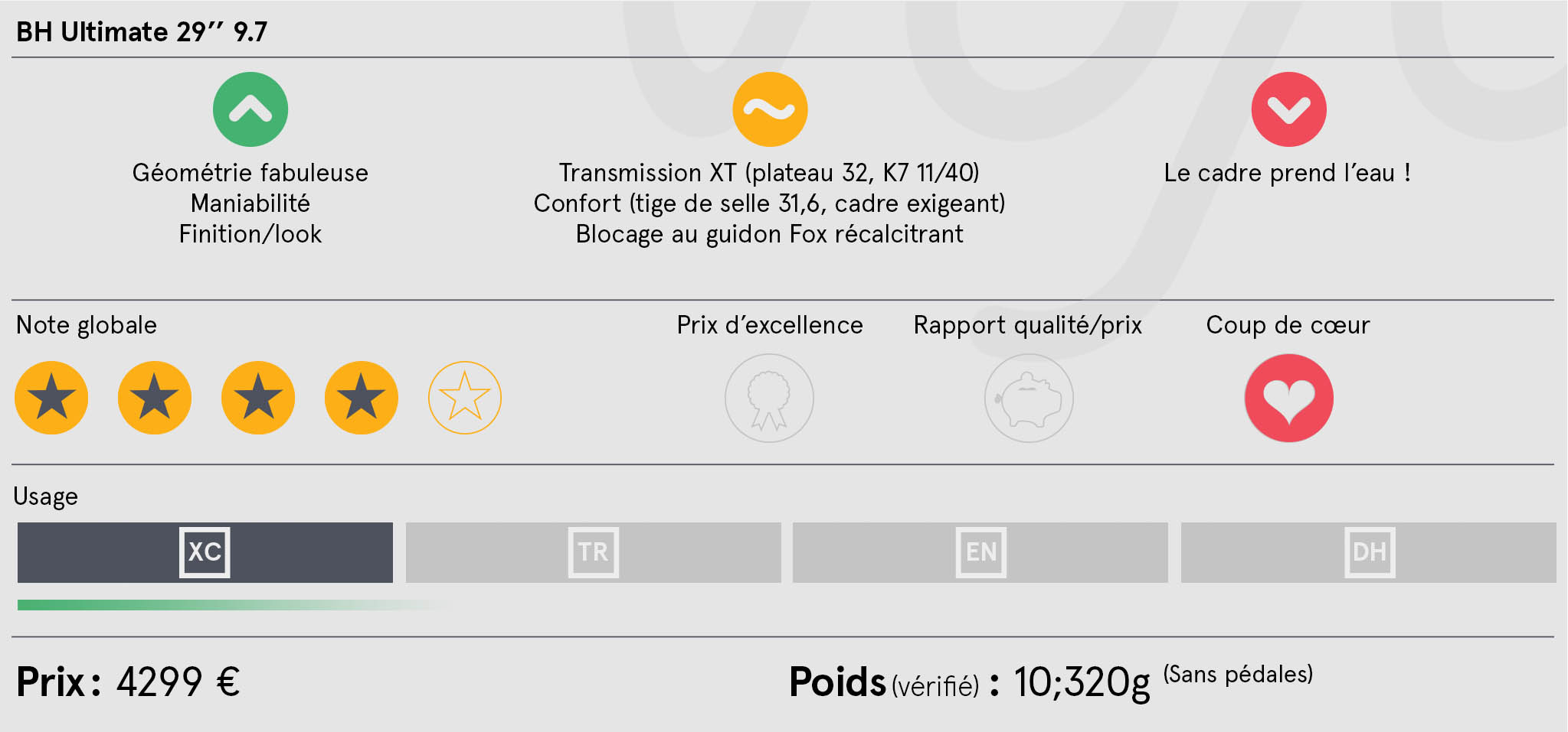 A 4299€, le BH Ultimate 9.7 testé ici est un tout petit peu en dessous de la moyenne de ses concurrents au niveau des équipements. Certains ajoutent tantôt un dérailleur XTR, tantôt une fourche RS-1 ou des périphériques carbone. Mais, dans l’ensemble, soyons beaux joueurs, il n’y a rien à jeter sur ce BH et on peut l’emmener directement partout, y compris en compétition, sans rien changer. Même si des pistes d’évolutions existent.