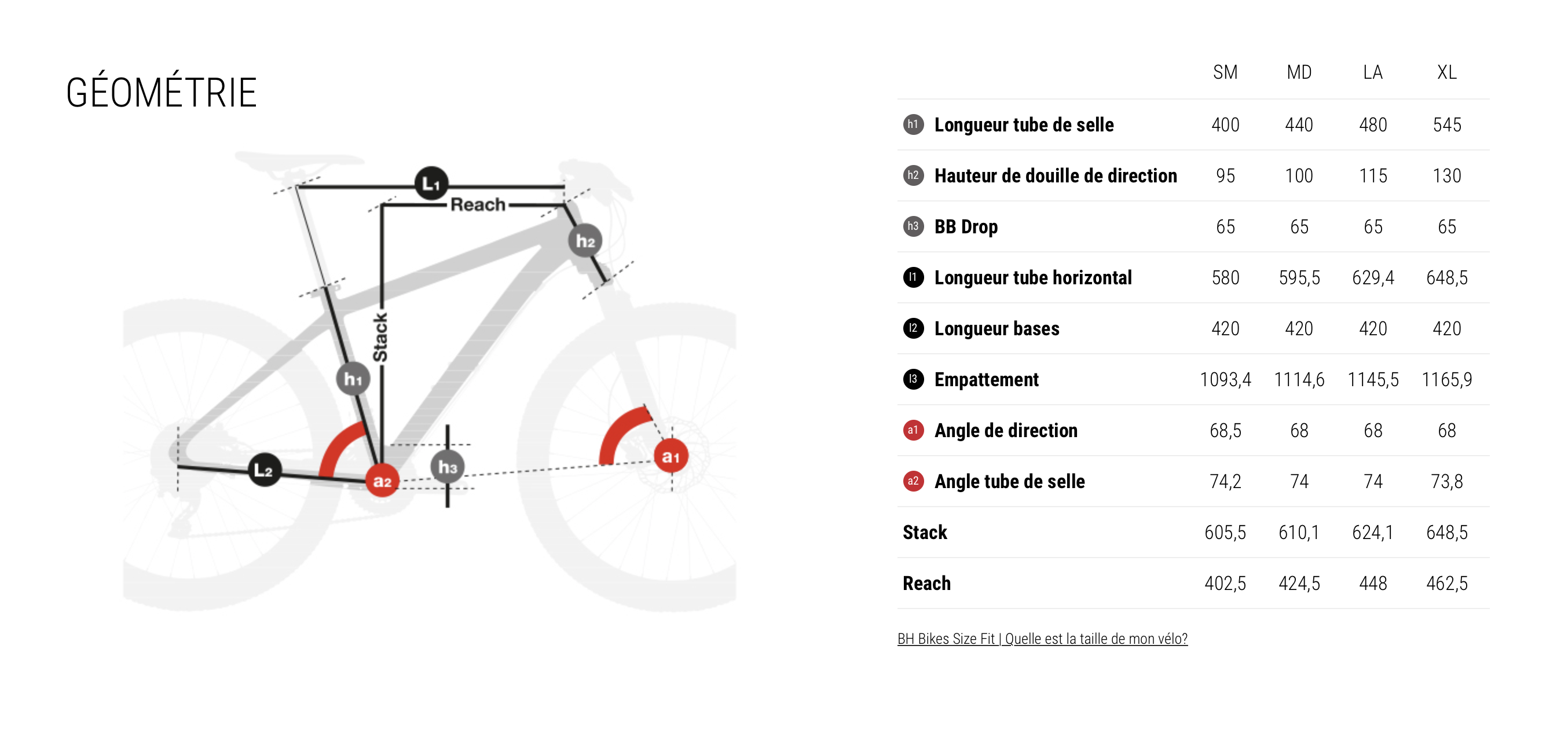BH est connu pour proposer depuis plusieurs années des géométries très contemporaines et même avant-gardistes à certains égards. Le modèle précédent nous avait déjà beaucoup plu pour cela. Et c’est donc assez logiquement que le nouveau BH Ultimate Evo continue dans la même voie et n’a pas eu besoin de subir de gros bouleversements. Le reach est tout de même augmenté de 10 à 20mm selon les tailles et l’angle de direction passe de 69 à 68° dans le but de donner encore plus confiance en descente et d’améliorer l’efficacité. Quant aux bases, elles sont hyper courtes, avec seulement 420mm ! Bref, on est à la pointe des tendances actuelles.