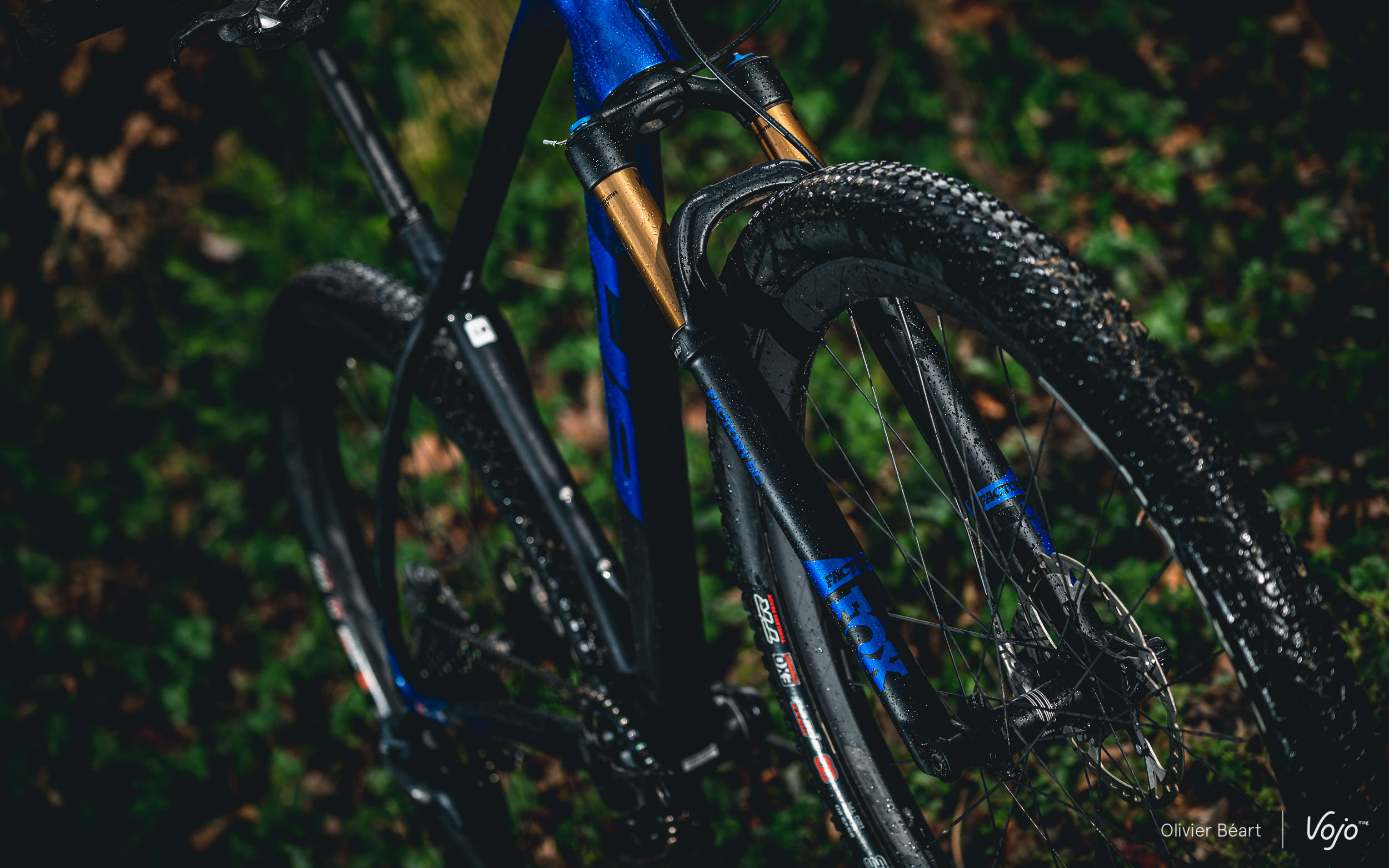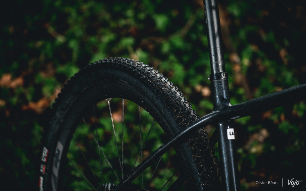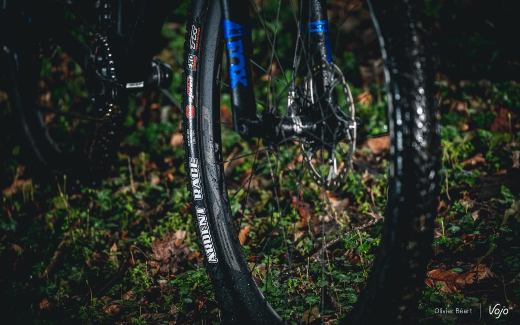 Cette monte de pneus s’avère bien choisie. Le Maxxis Ikon n’a pas sa place à l’avant selon nous, mais à l’arrière il offre un bon compromis rendement/traction, ainsi qu’une belle polyvalence. A l’avant, l’Ardent Race offre un bon grip latéral malgré ses crampons bas. Il es redoutable sur sols secs, y compris meubles, et s’il n’est pas au mieux dans la boue, il a au moins le mérite de ne pas y être traître.