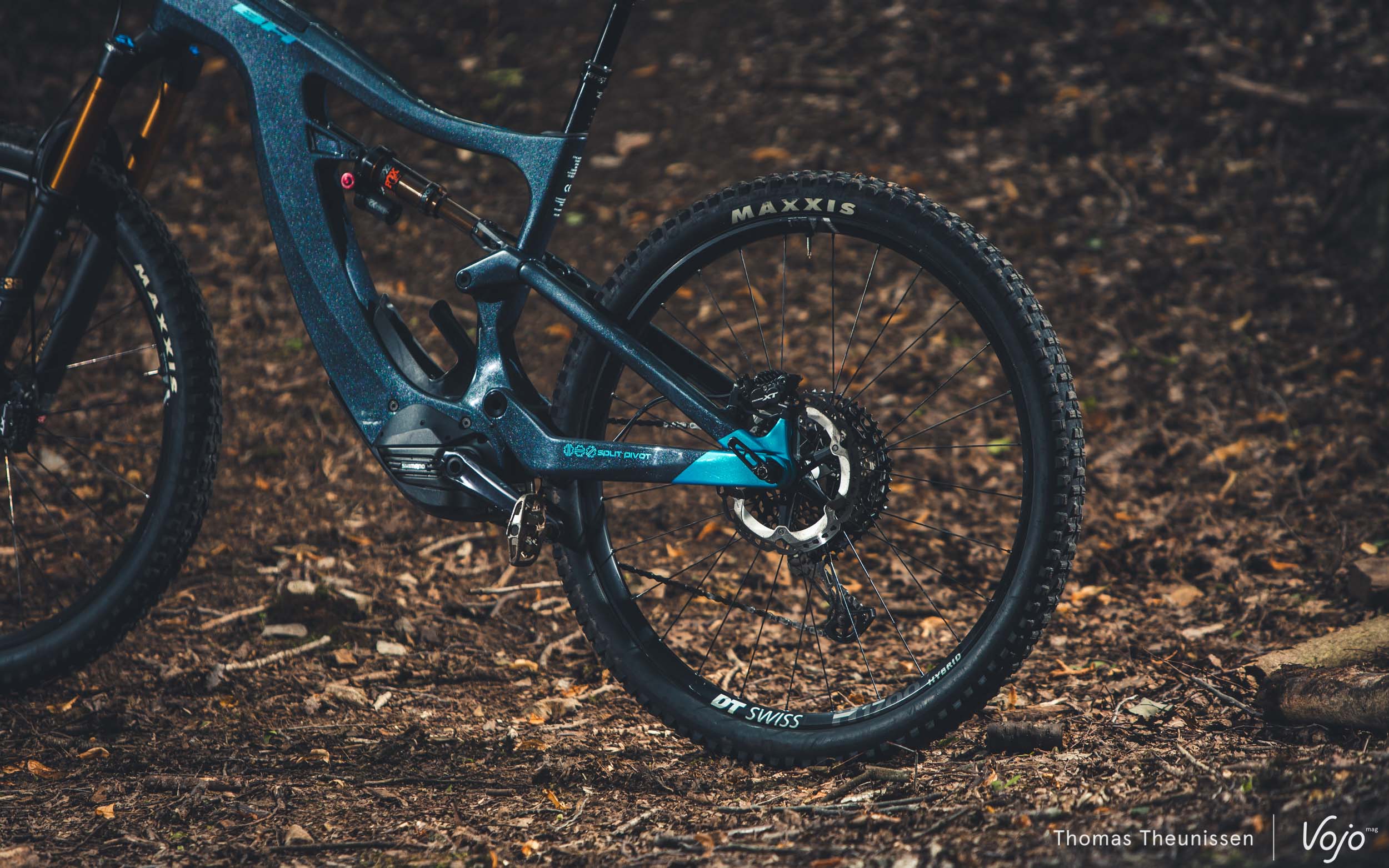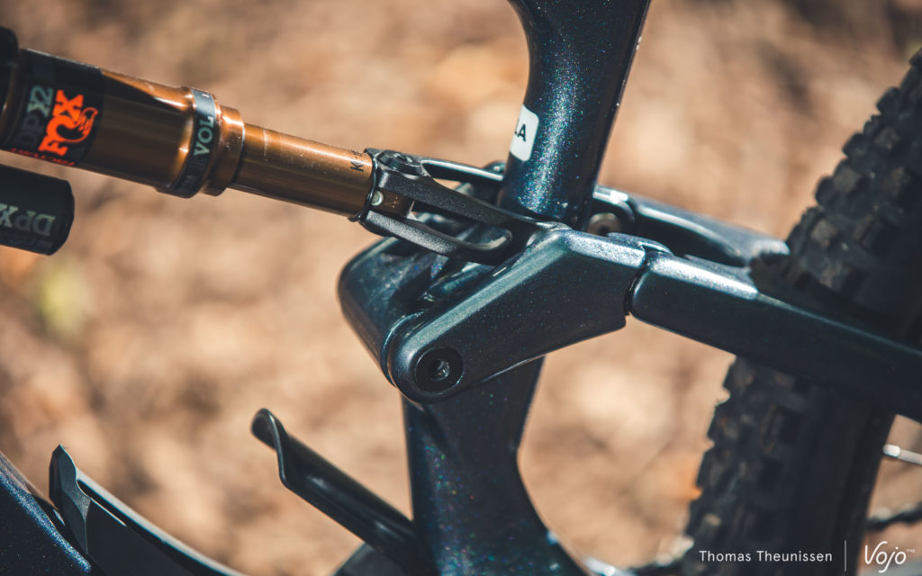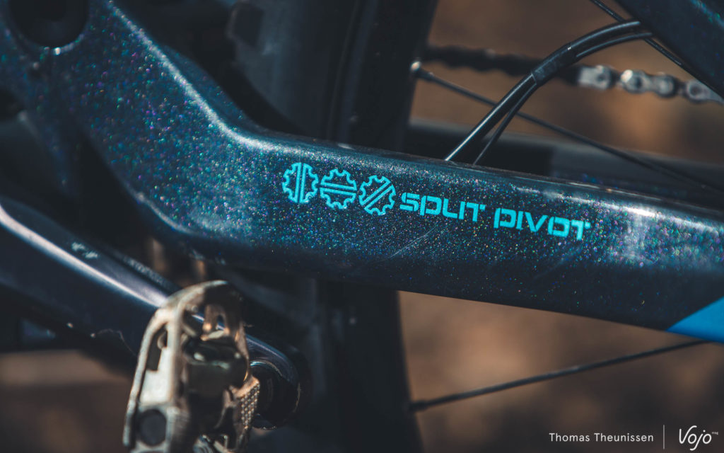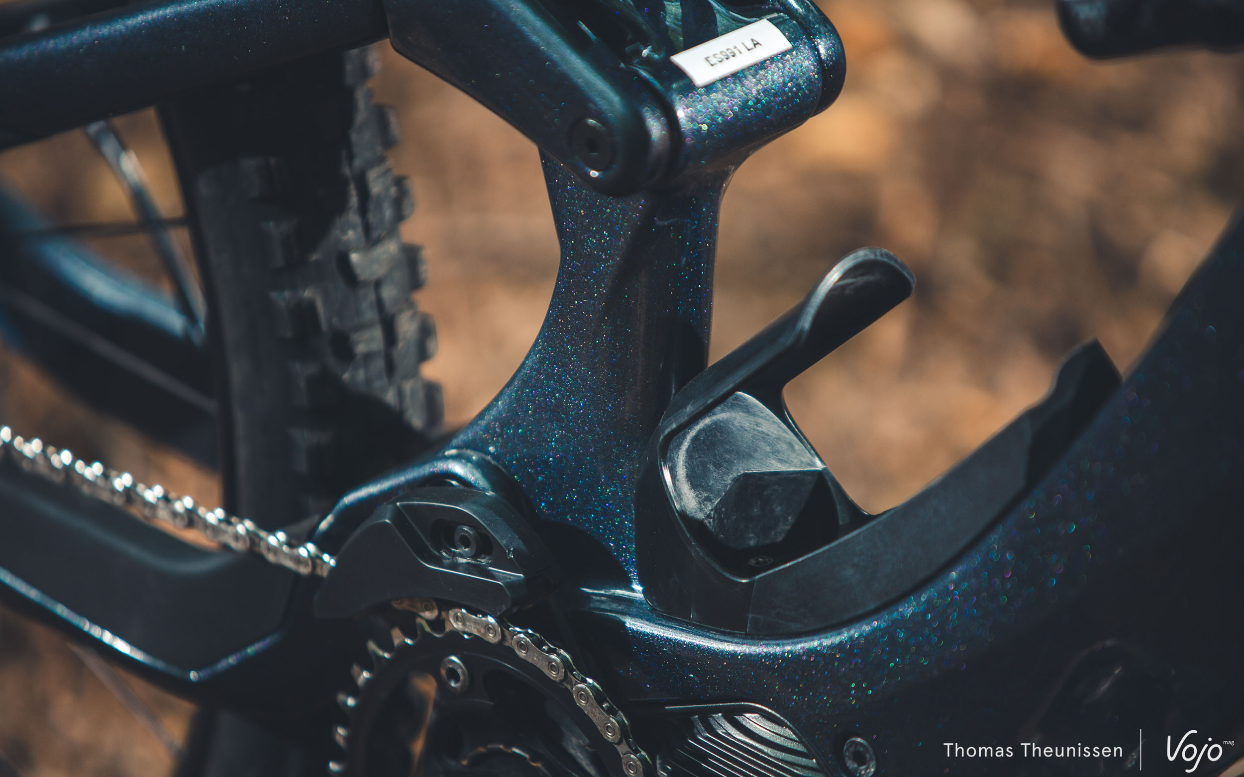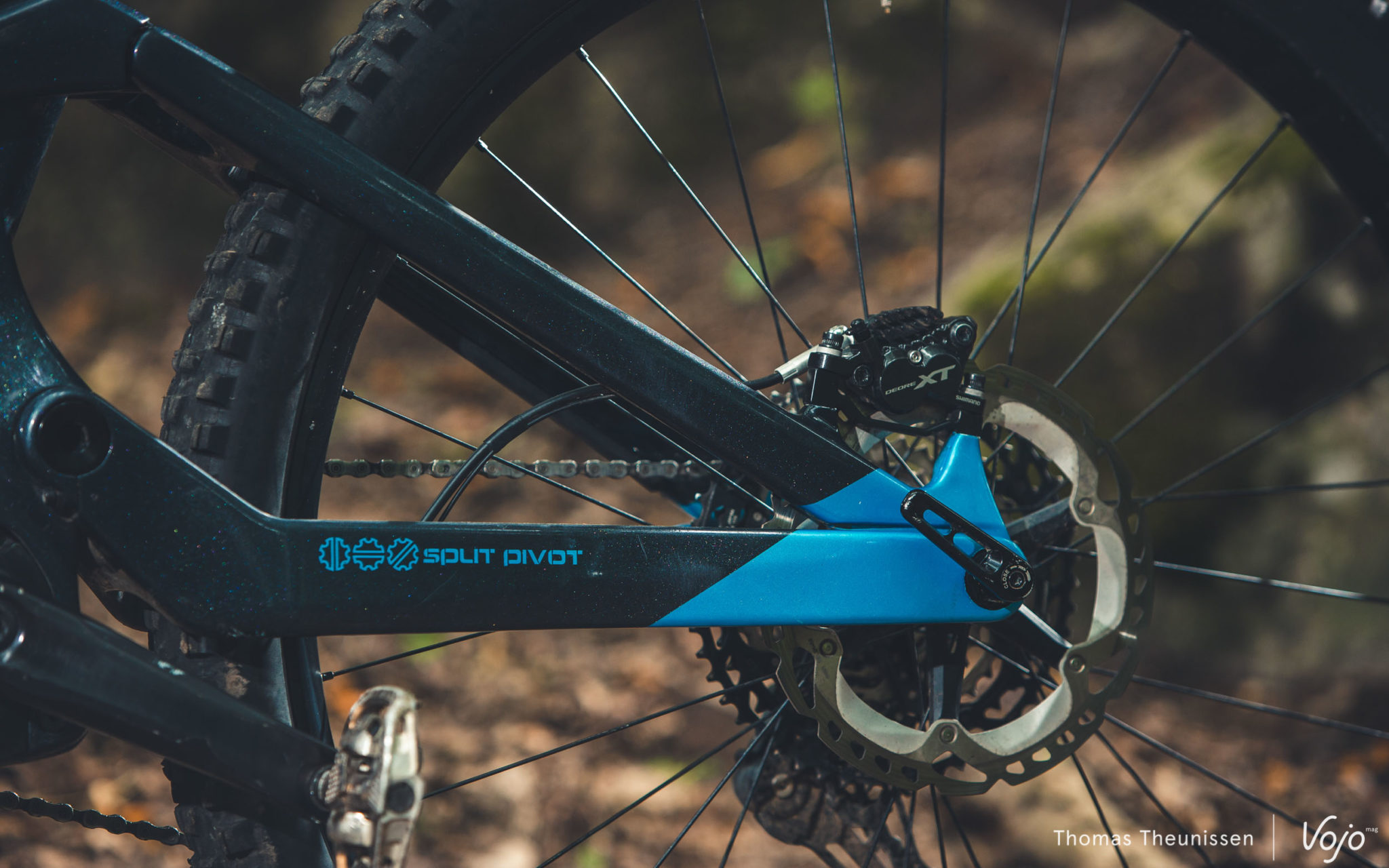 La spécificité de cette cinématique Split Pivot est de disposer d’un point de pivot arrière concentrique à l’axe de roue. Elle a l’habitude de se distinguer par sa grande sensibilité qui permet de bien coller la roue au sol, tout en étant assez neutre au pédalage. Le point de pivot principal est ici surdimensionné pour assurer une bonne rigidité et la biellette supérieure est entièrement en carbone. Elle dissimule bien la jonction avec les haubans pour donner au vélo des lignes raffinées.