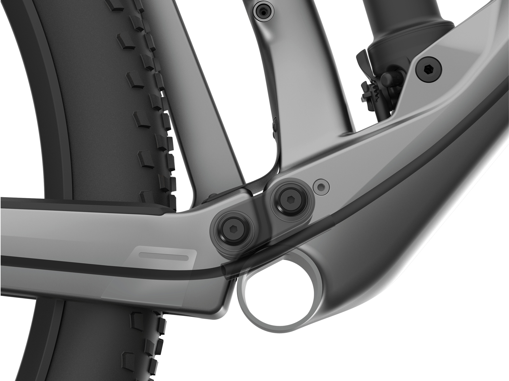 La suspension APS, c’est un triangle arrière d’une pièce, relié à l’avant par deux biellettes ; une près du pédalier et l’autre plus haut pour comprimer l’amortisseur. Toutes deux ont été rigidifiées et allégées (on parle de plus de 100g) par rapport à la génération précédente. Il s’agit d’une cinématique propre à BMC, qu’on retrouve sur l’ensemble de la gamme suspendue et qui développe ici 100mm de débattement. Au-delà de l’anti-pompage, un gros travail a été fait sur le grip, car il est synonyme d’efficacité si on peut pédaler sereinement, y compris quand le relief du sol est tourmenté.