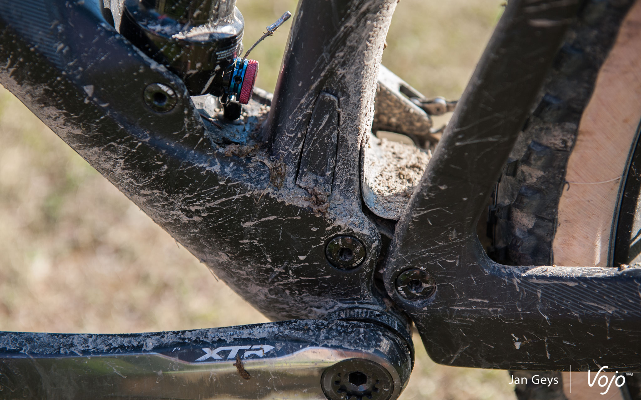 Nous parlerons plus loin de sa suspension, qui ne fait pas l’économie de points de pivots pour gratter quelques grammes, mais on pense par exemple au passage des câbles et gaines, entièrement guidé à l’intérieur pour faciliter les opérations de maintenance. Un point sur lequel on voit qu’il n’y a pas que les pilotes du team qui ont été écoutés lors de la conception, mais aussi les mécanos. Nous avons eu l’occasion de tester un changement de câble et gaine de dérailleur et, en effet, l’opération se passe sans prise de tête.
