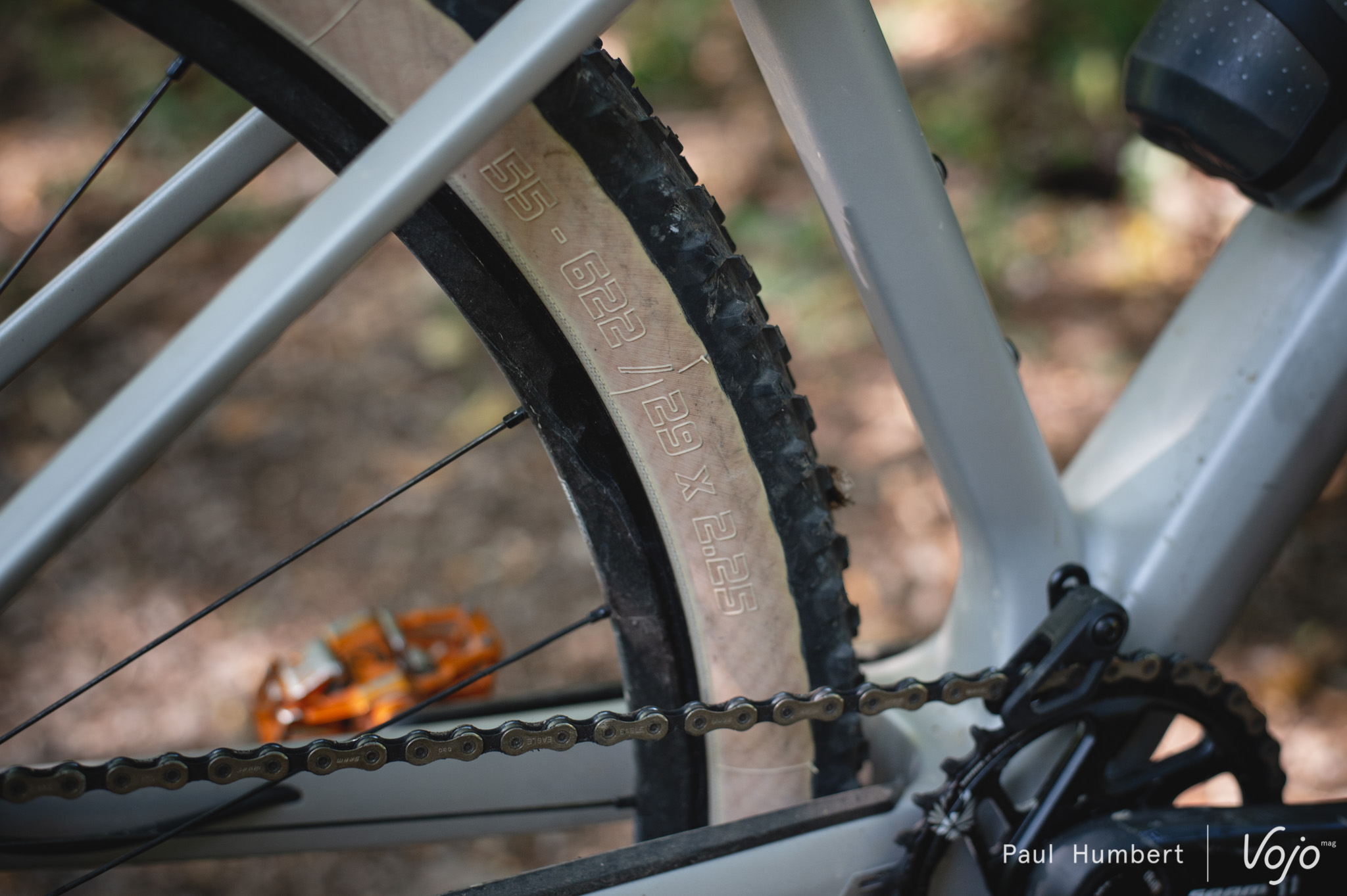 Une autre remarque concerne le train roulant et plus précisément les pneus Vittoria. Ce n’est pas le choix de la gomme ou du dessin qui nous a posé problème mais plutôt celui de la carcasse. Cette version TLR XC-Race est très jolie avec ses flancs beige, mais avec sa carcasse très souple (120 tpi) sans aucun renfort, elle impose d’être assez prudent avec les pressions. Nous avons ainsi dû faire face à une crevaison par pincement à l’arrière alors que nous étions gonflé à 1,5 bar pour 66 kg, une pression qui n’a rien d’extrêmement faible. Par la suite, cela ne s’est pas reproduit même en descendant à 1,3-1,4 bar (avant/arrière) mais la version TNT XC-Trail, en flancs gris et toujours en 120 tpi mais avec renforts latéraux, serait sûrement plus pertinente vu le faible surpoids (20 g par pneu).