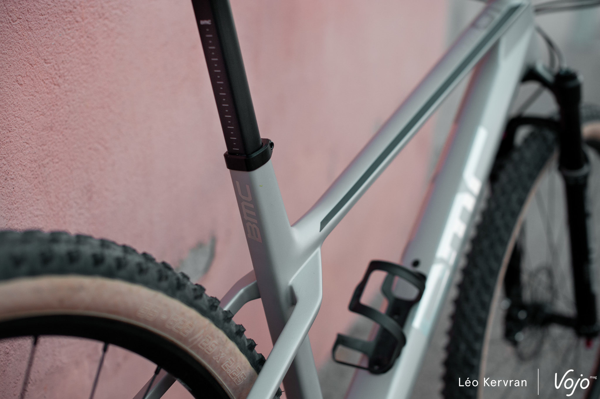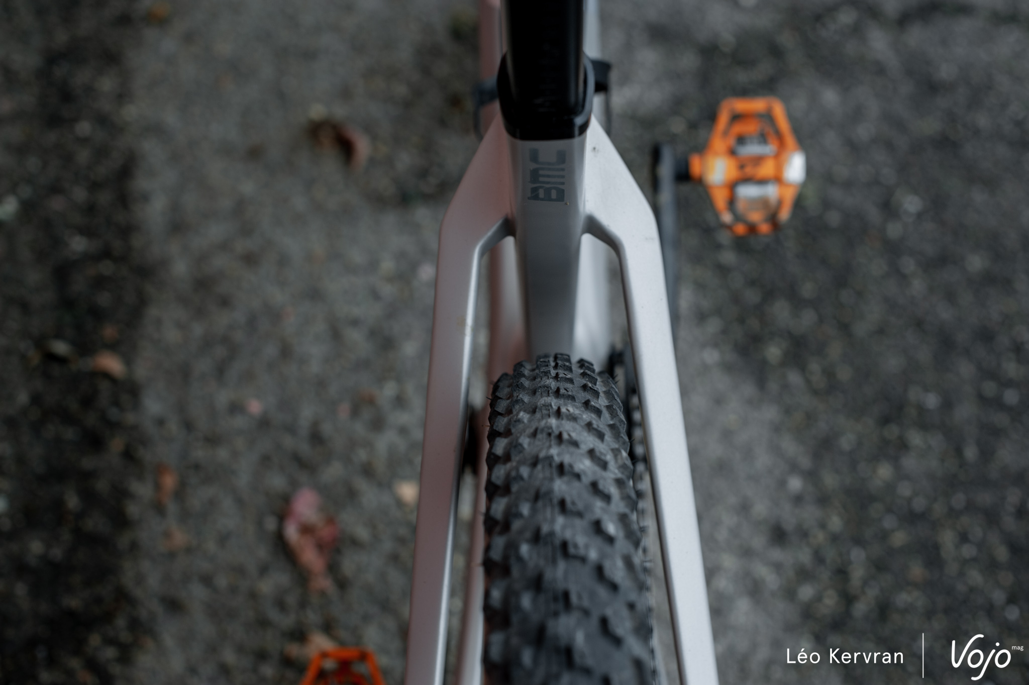 Enfin, le dernier composant de ce tryptique du confort, c’est la possibilité de monter des pneus larges. Les sections de 2.3 et 2.4 sont de plus en plus populaires en XC pour leur filtration des chocs et leur rendement meilleur qu’un pneu en 2.1, BMC s’est donc assuré de laisser assez de dégagement pour monter des pneus jusqu’à 58 mm de ballon. Comme vous pouvez le constater, avec les Vittoria de notre modèle d’essai en 55 mm, il y a encore de la place.