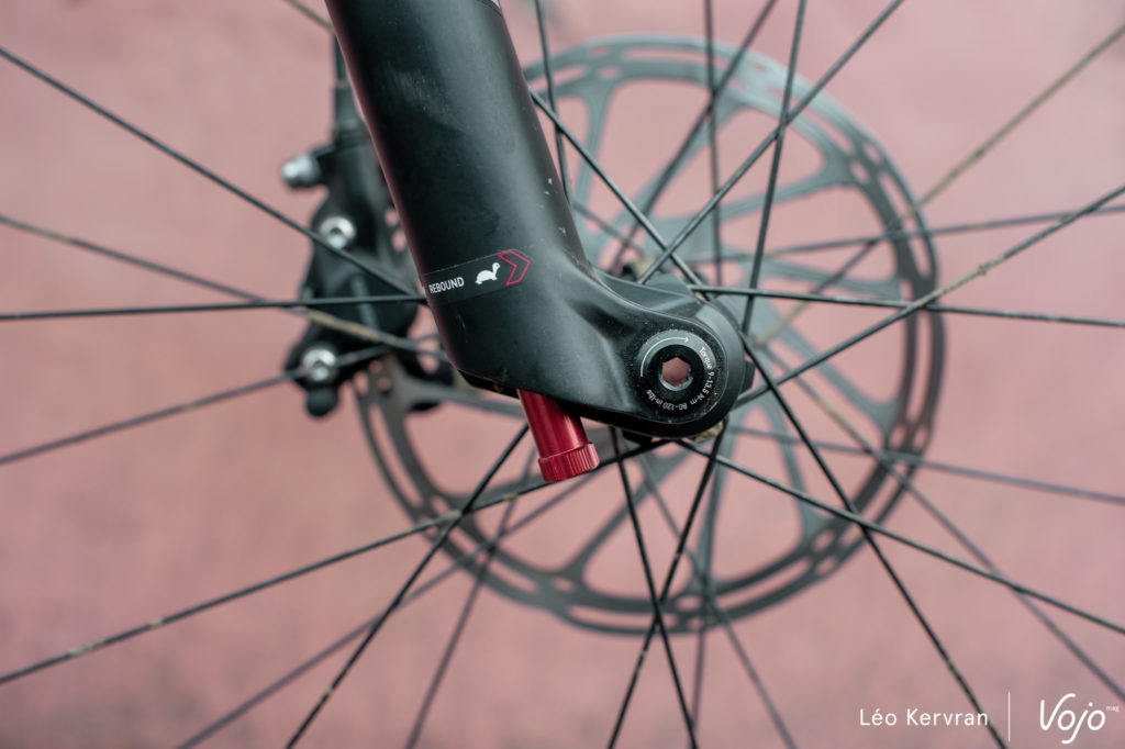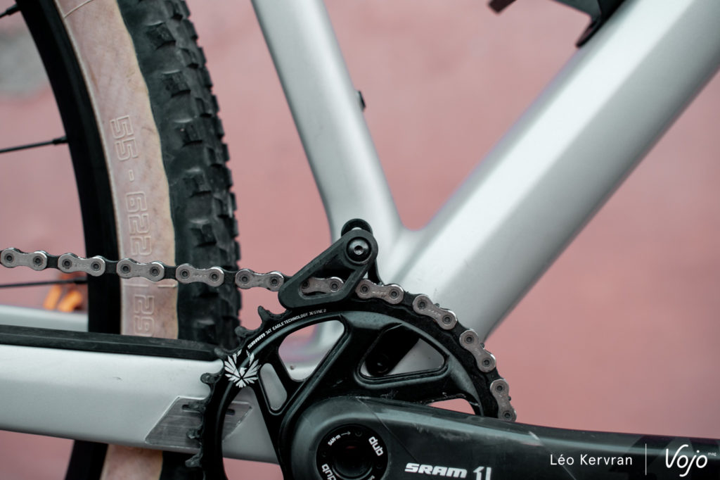 Cela dit, on reste sur un vélo de XC et si on peut gagner facilement quelques grammes, on ne va pas s’en priver : les axes de roues n’ont pas de levier et le protège-base est réduit à sa plus simple expression.
