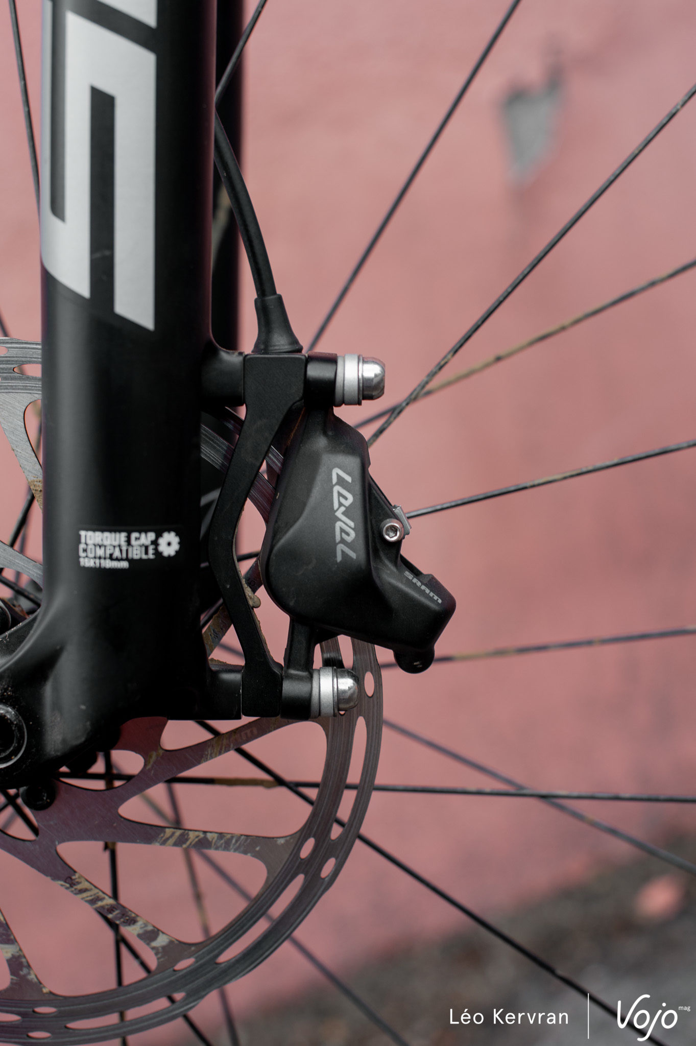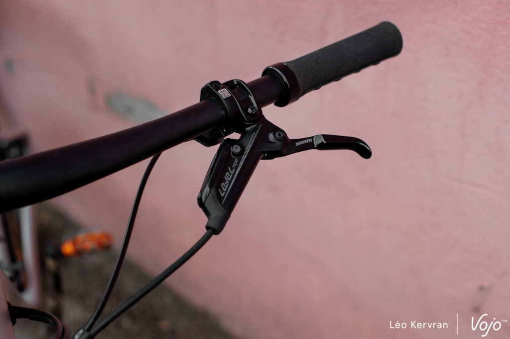 Le freinage vient également de Sram, avec des Level TLM. Détail intéressant, BMC a choisi de monter des disques de freins différents suivant la taille du vélo. On retrouve ainsi du 160/160 en S et en M mais du 180/160 en L et XL.