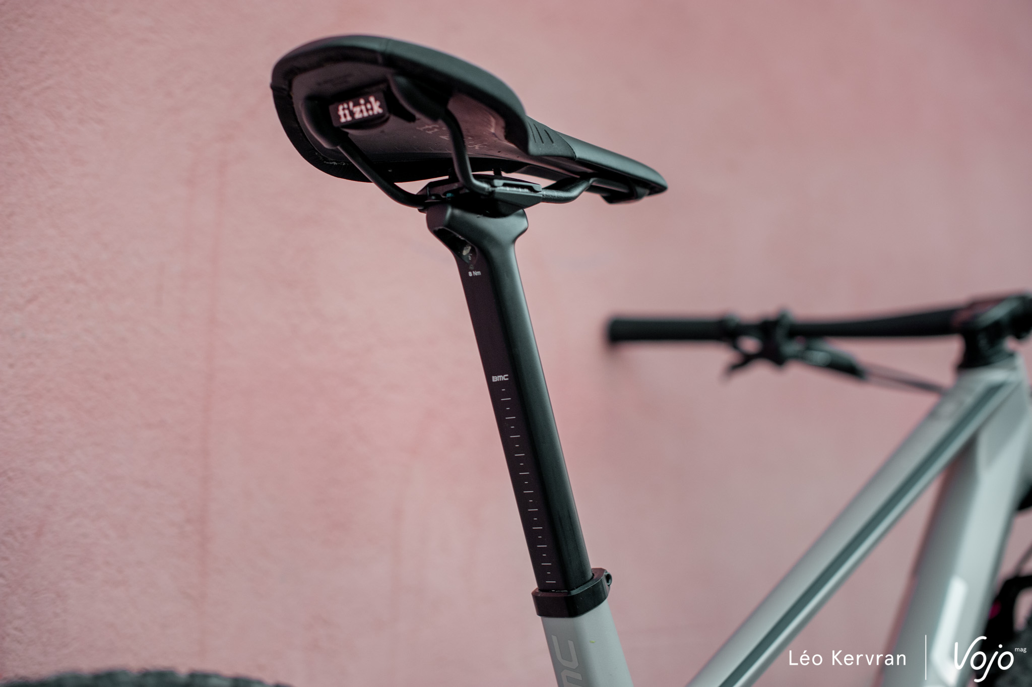 A cela, il faut ajouter le tube et la tige de selle en forme de « D », de forme circulaire devant et plate derrière. Issue de la route, cette conception offre à ces deux éléments une certaine souplesse ce qui, combiné aux haubans flexibles, doit offrir un minimum de confort au pilote. C’est ce que BMC appelle le TCC, pour Tuned Compliance Concept. En revanche, cela ne fonctionne que sur le carbone et on retrouvera un tube de selle rond (tige en 31,6 mm) sur les versions en aluminium.