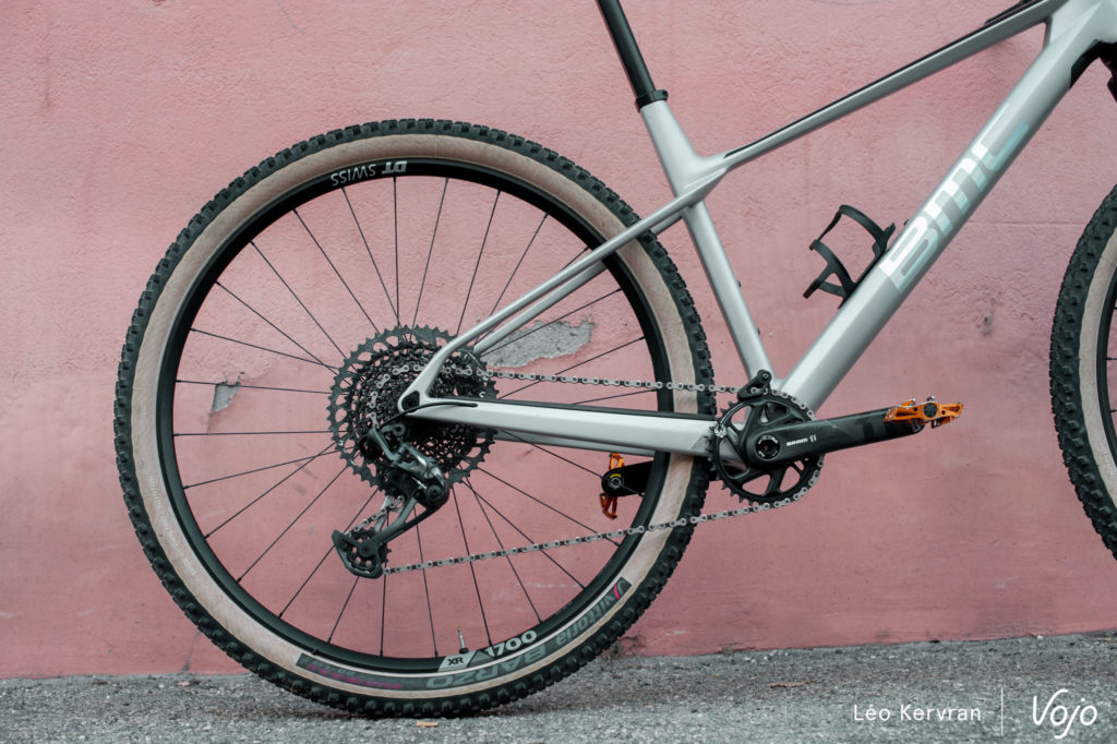 Sur le train roulant on retrouve une valeur sûre avec les roues DT Swiss XR 1700 en 25 mm de largeur interne. Elles sont associées à des pneus Vittoria Barzo généreusement cramponnés et en section de 2.25, ce qui correspond à un ballon 55 mm (vérifié par nos soins). Ils sont ici en version TLR, la carcasse la plus légère de la gamme, et ne disposent d’aucun renfort particulier. Un Mezcal à l’arrière serait peut-être un peu plus dans l’esprit « XC compétition », mais rien de dramatique et on préfère nettement ce choix à un montage en pneus de salon.
