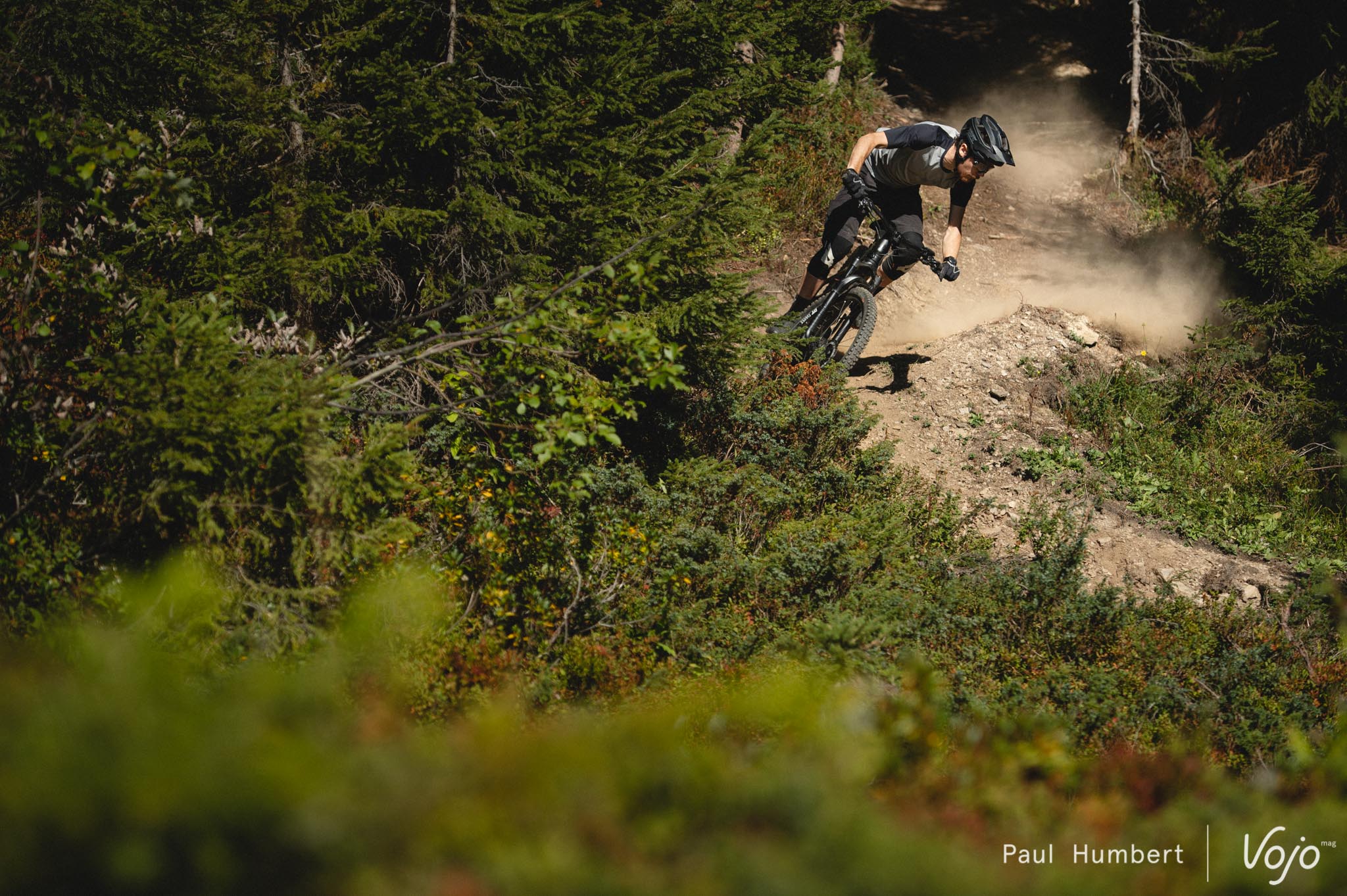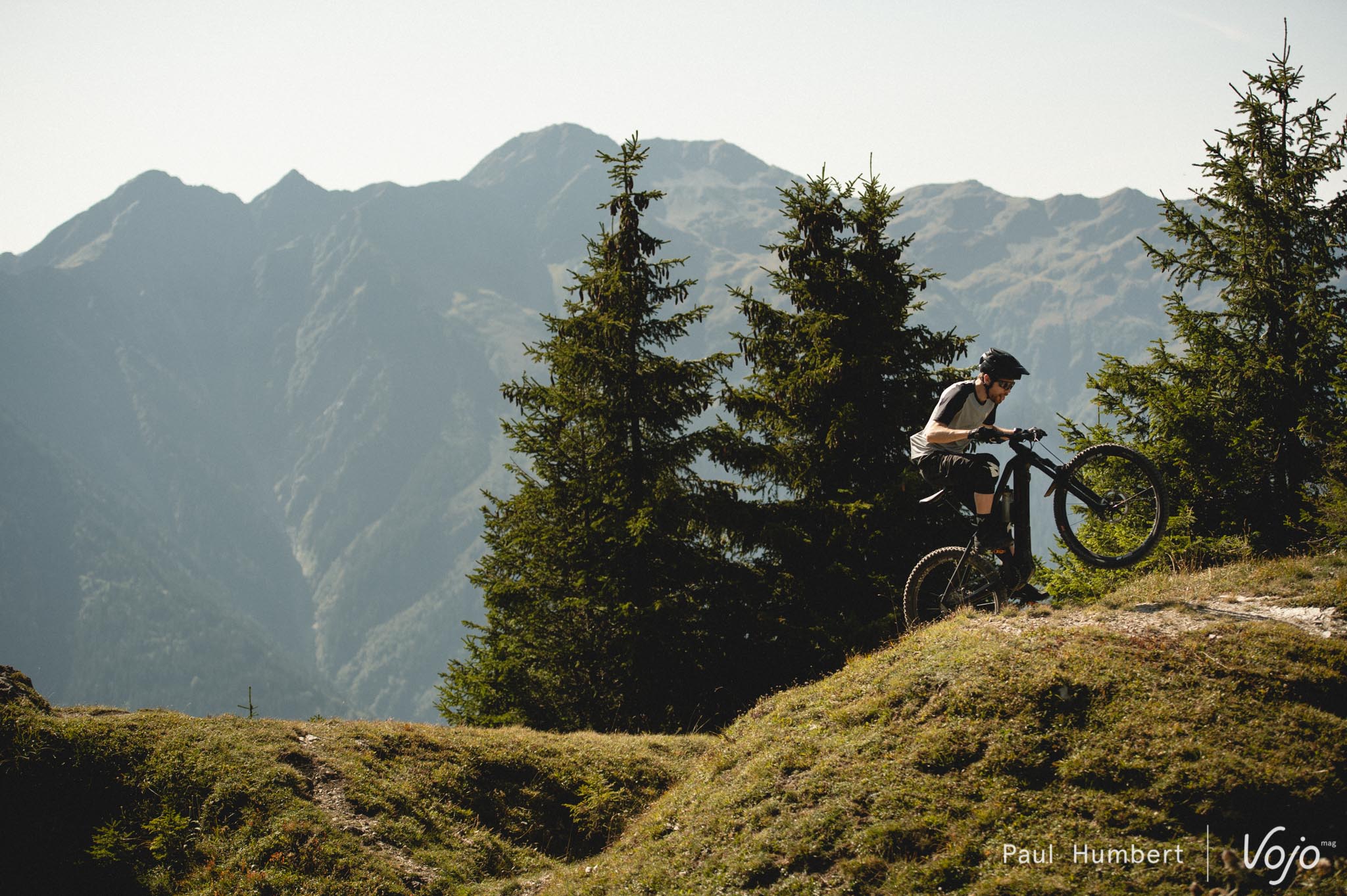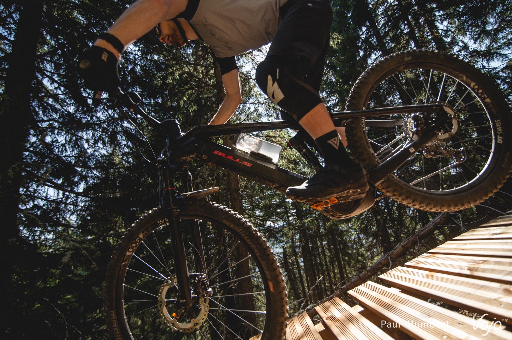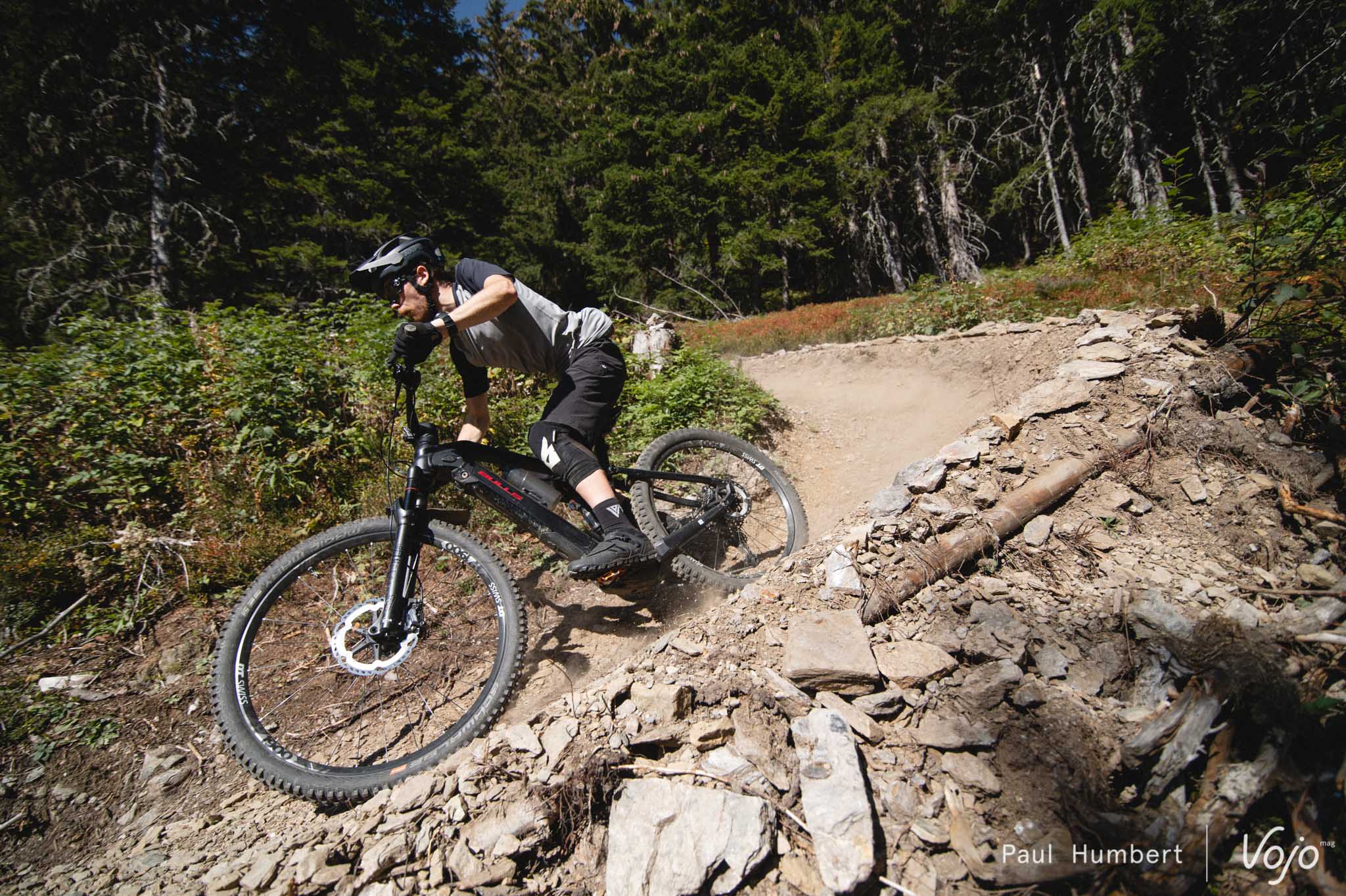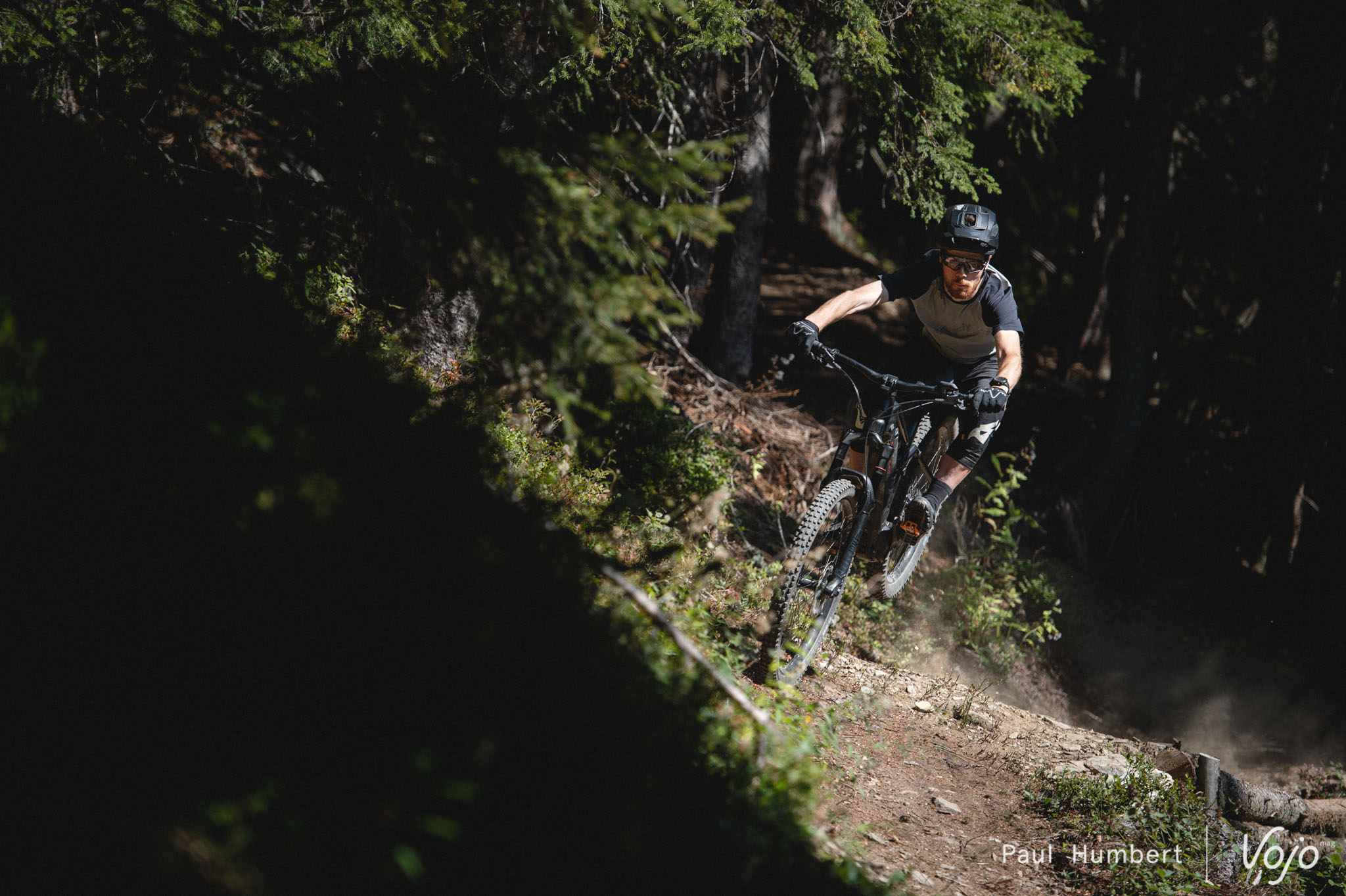Dans le même temps, la roue arrière en 27,5″ se place sans effort dans les virages et permet même, si le terrain s’y prête, de jouer un peu avec les appuis. Lorsque la pente se fait plus raide, elle facilite la gestion de sa position et le vélo reste encore une fois sain, sans réactions nerveuses ou sensation d’instabilité malgré l’angle de direction peu couché vu le débattement. C’est seulement dans le rapide et défoncé que la machine affiche des limites plus marquées, avec une roue avant qui tient sa ligne mais une roue arrière qui part vite en travers.