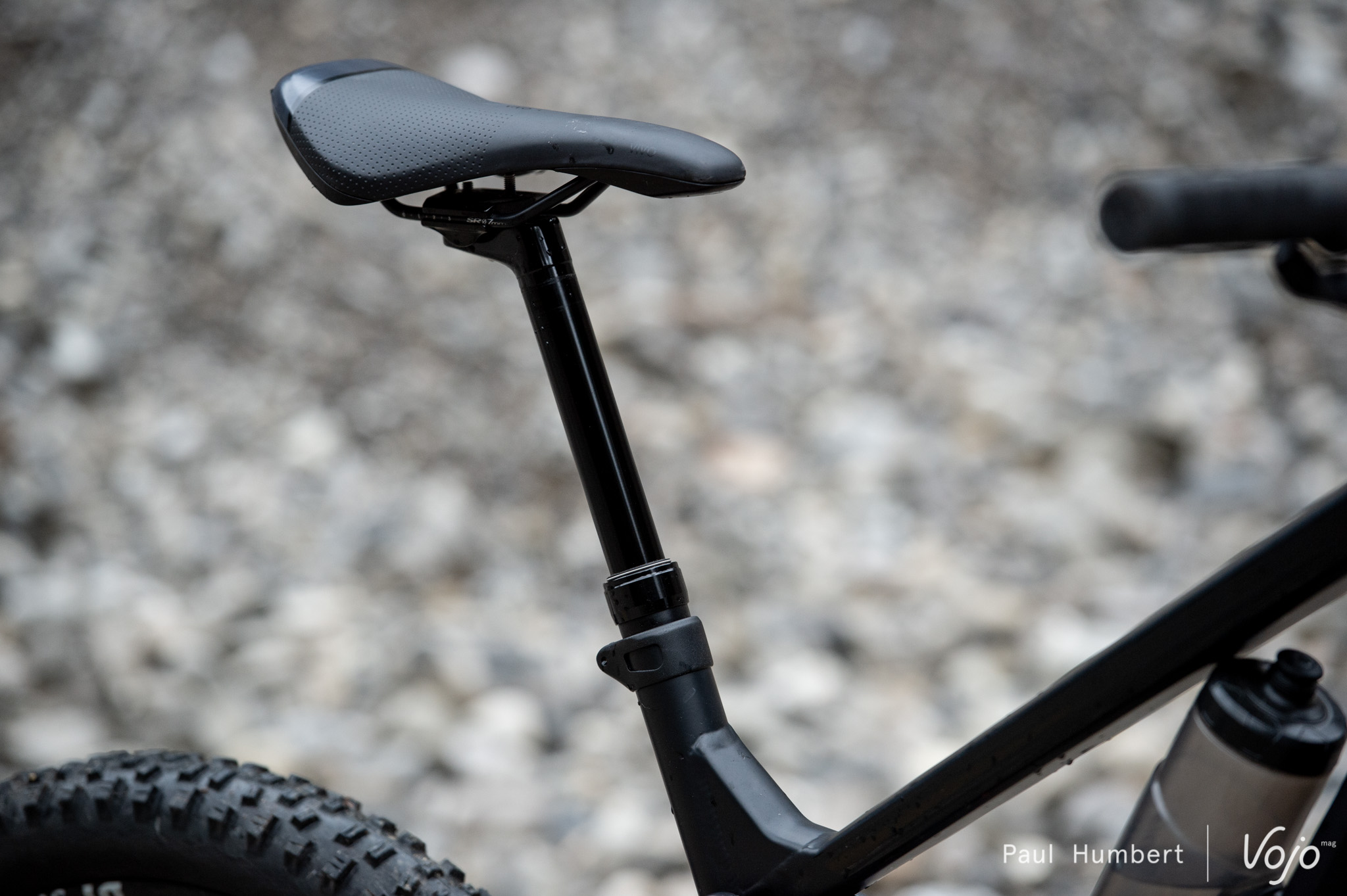 Enfin, la tige de selle est une Limotec DP07 d’après la fiche technique, un modèle inconnu qui offre sur notre vélo en taille L 150 mm de course (elle varie selon la taille du vélo) ainsi que 25 mm de déport. Attention, la longueur totale de cette tige de selle est particulièrement importante et il se peut que la selle soit trop haute pour vous, même avec le fourreau rentré au maximum dans le cadre si vous êtes vers la limite basse d’une taille.