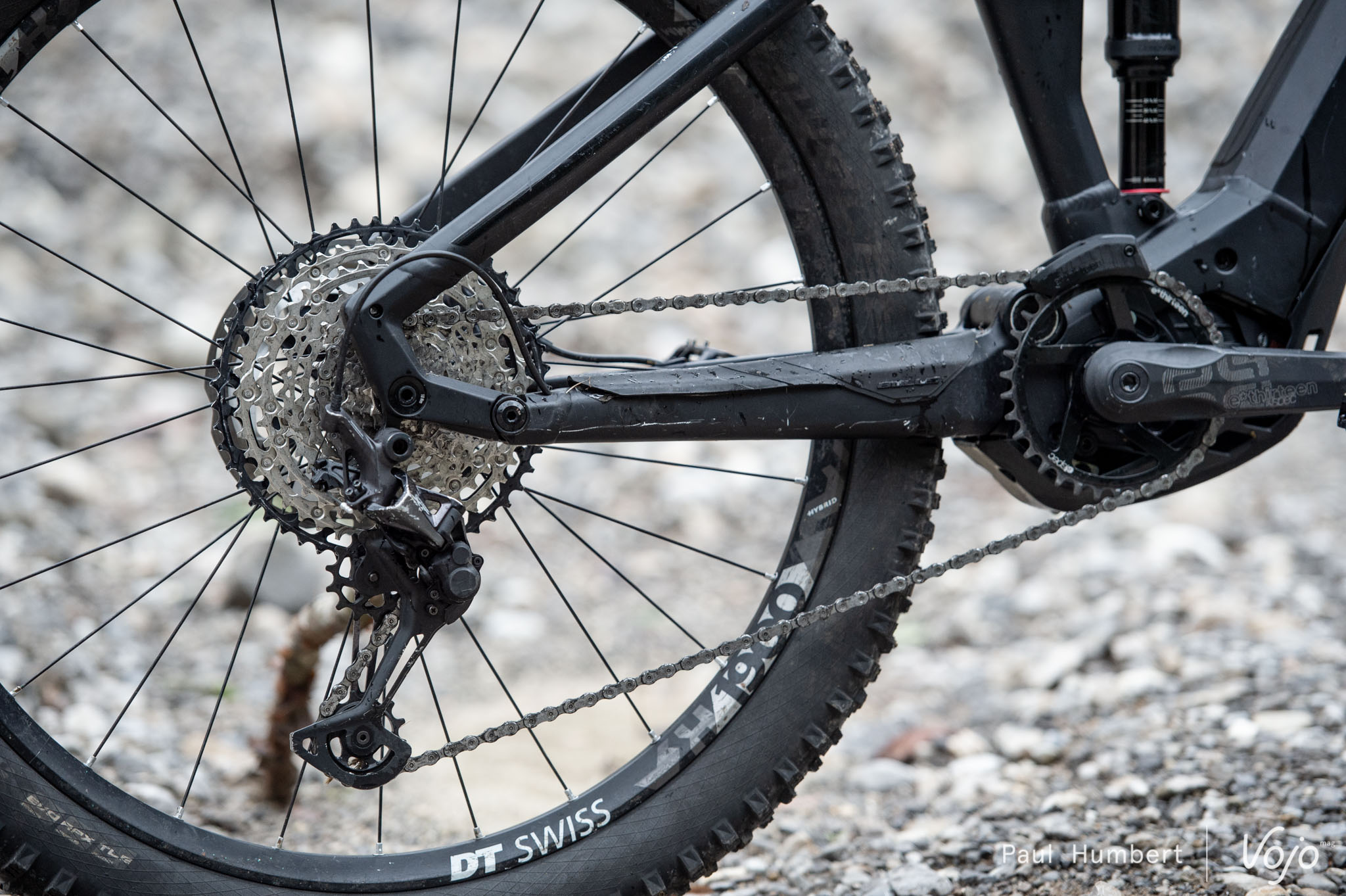Côté train roulant, les roues DT Swiss H1900 (un modèle dédié à l’e-bike ici en 30 mm de largeur interne) accueillent des Schwalbe Nobby Nic, en 29×2.35 à l’avant et 27,5×2.6 à l’arrière et sans renfort particulier dans les deux cas. Des pneus non renforcés sur un VTT AE, voilà qui incite à garder une certaine mesure au moment de rouler le vélo…