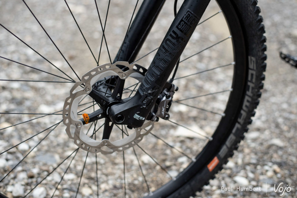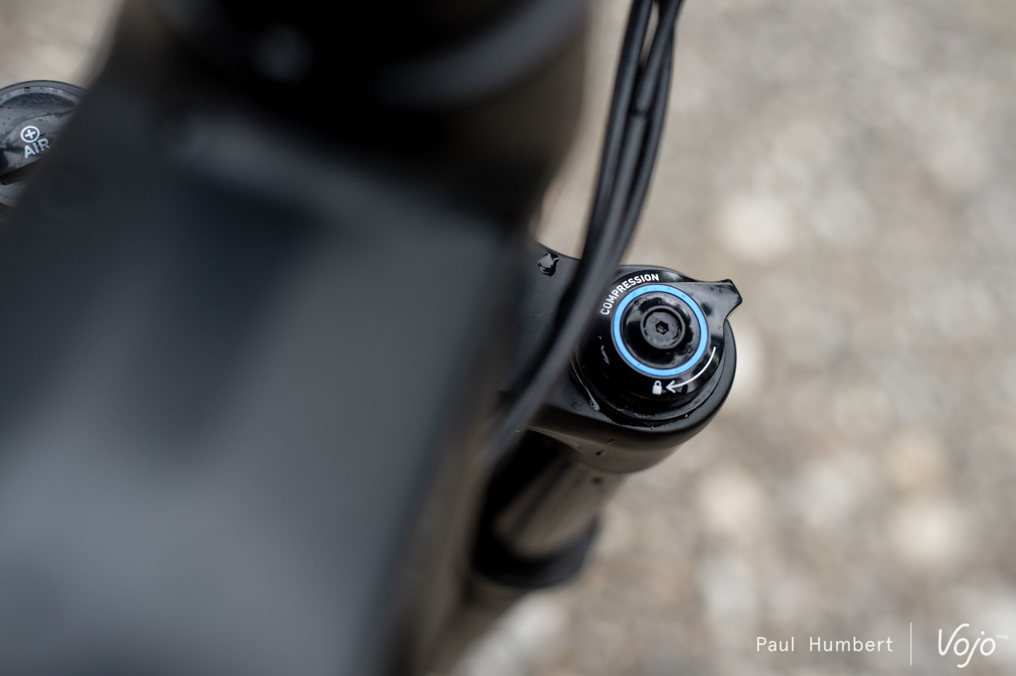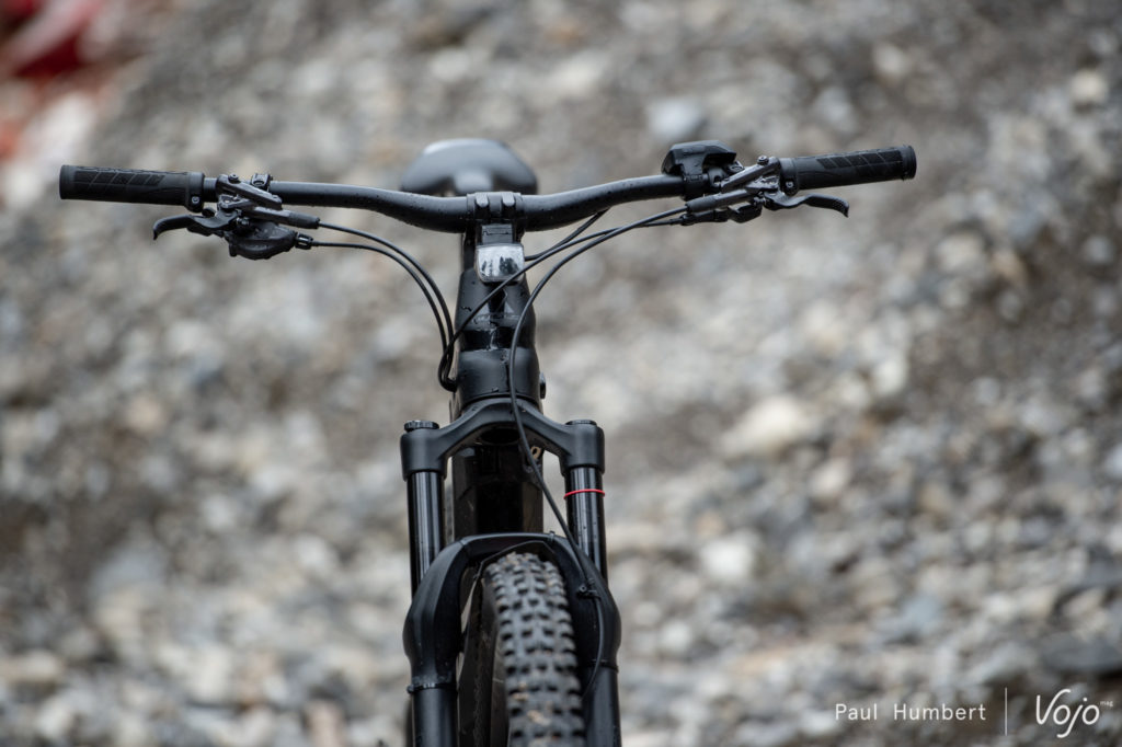 Nous avons été plus déçus par la fourche. La RockShox 35 ne nous avait pas laissé un grand souvenir sur les rares vélos où nous l’avions rencontrée avant cet essai plus poussé et rien n’a changé : d’une part, elle fonctionne de manière assez sèche, ce qui rend toute lecture du terrain difficile lorsque le sentier est technique, et d’autre part, elle ne permet pas de concilier support et sensibilité (comme la plupart des fourches de ce niveau de gamme). Sa simplicité de conception fait qu’on peut espérer une bonne fiabilité, mais il ne faudra pas attendre d’elle de grandes performances à la descente.