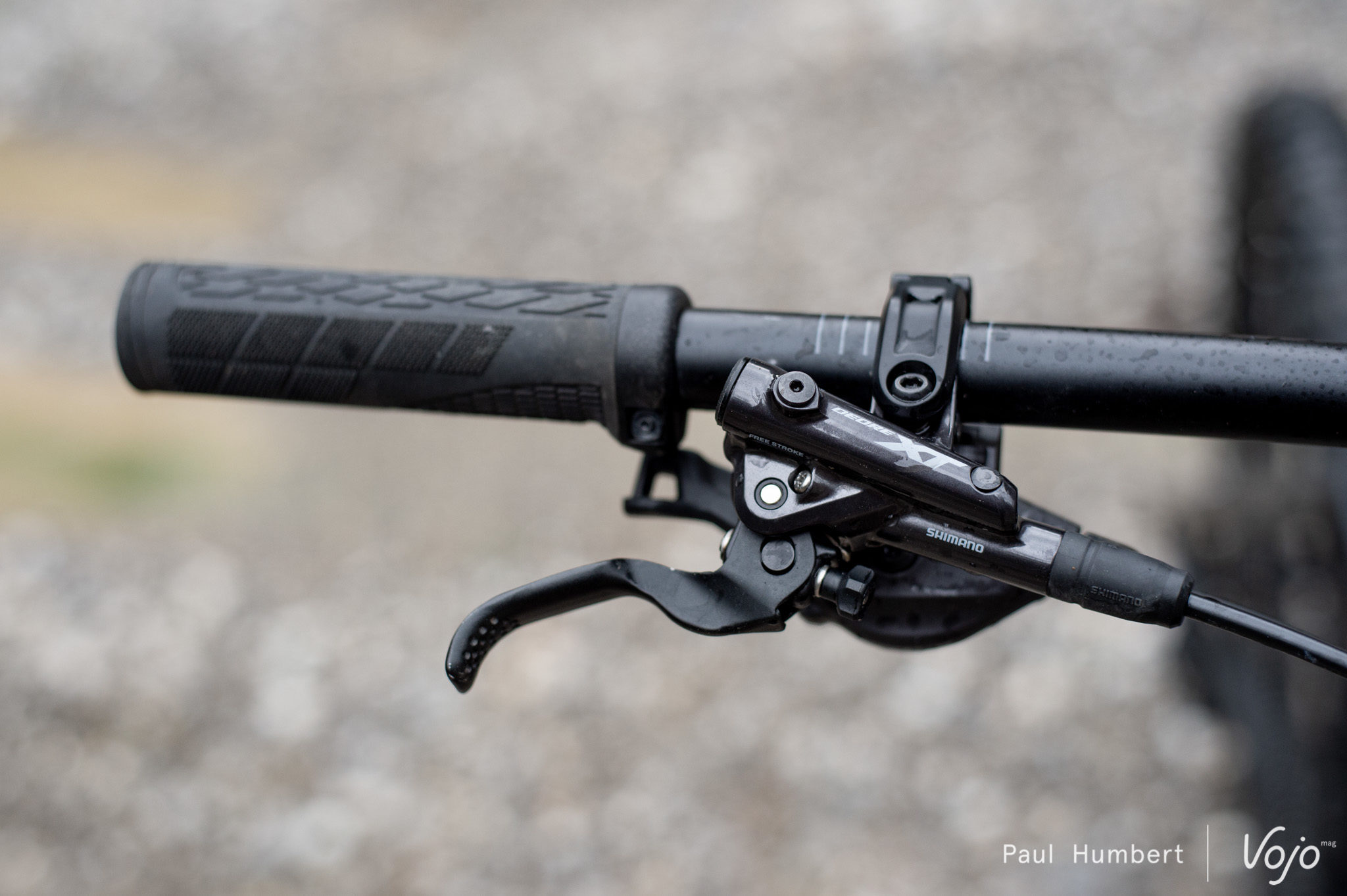 Si Bulls a fait quelques économies du côté des suspensions, ce n’est pas le cas au niveau de la transmission et des freins puisqu’on retrouve du Shimano Deore XT à presque tous les étages. Seules la cassette et la chaîne, comme souvent sur les e-bikes, sont de niveau de gamme SLX. Les freins sont ici en version 4 pistons, avec un disque de 203 mm à l’avant et 180 mm à l’arrière.