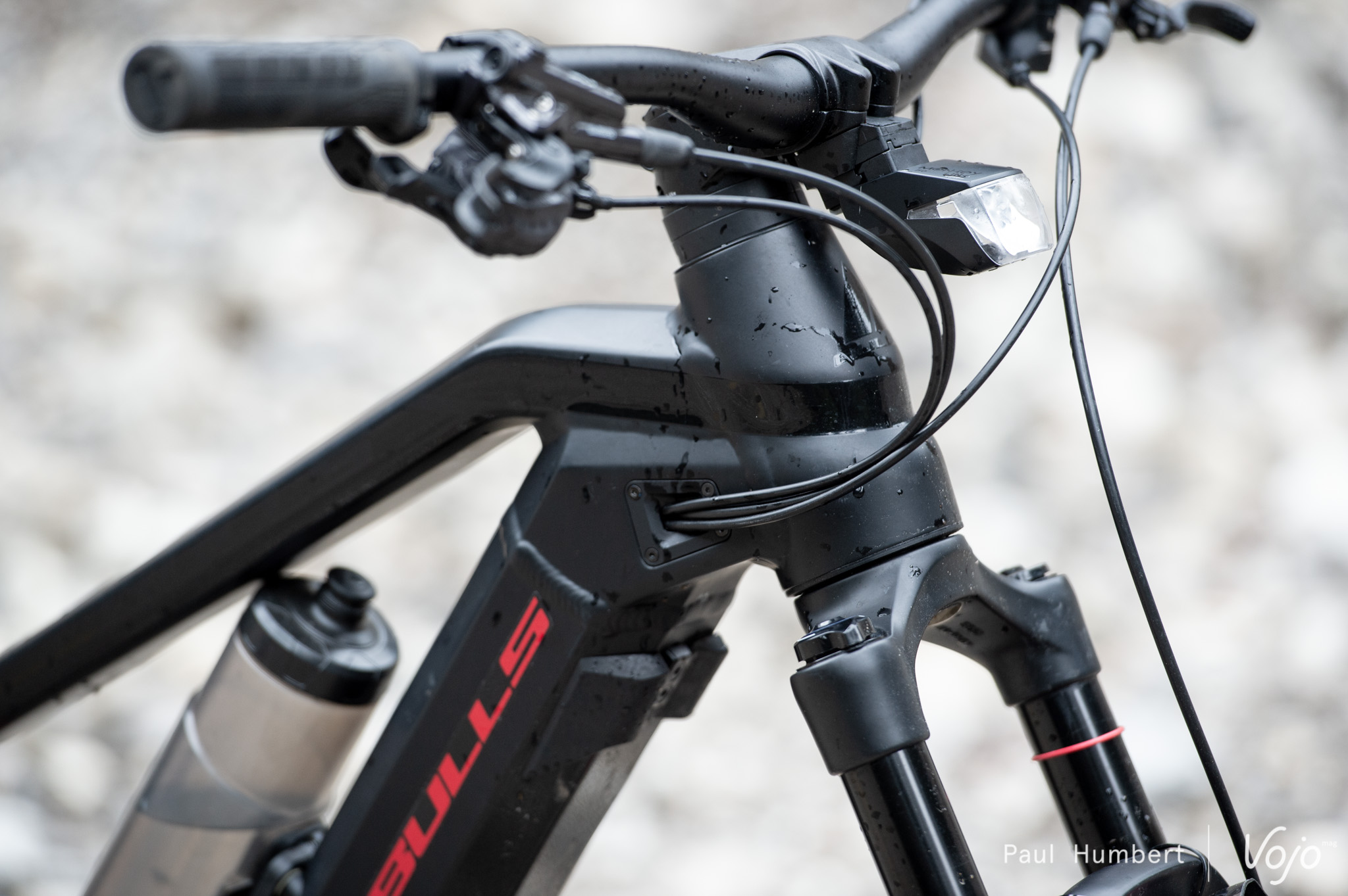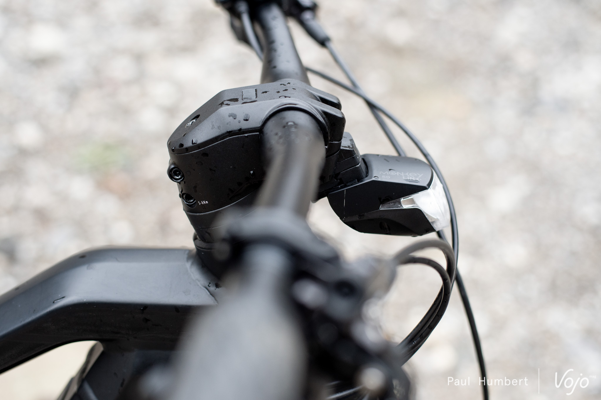 Le poste de pilotage vient directement de Bulls, avec une potence particulièrement imposante qui s’intègre bien dans la ligne du vélo et inclut un support de lampe (fournie avec le vélo, connectée à la batterie et suffisante pour se déplacer en ville ou sur des chemins larges et sécurisés) mais qui rend toute manœuvre d’entretien ou de réglage sur le jeu de direction ou le cintre particulièrement compliquée, comme nous l’avons découvert à nos dépens.