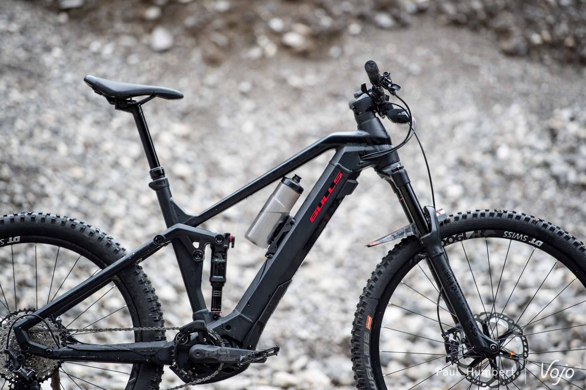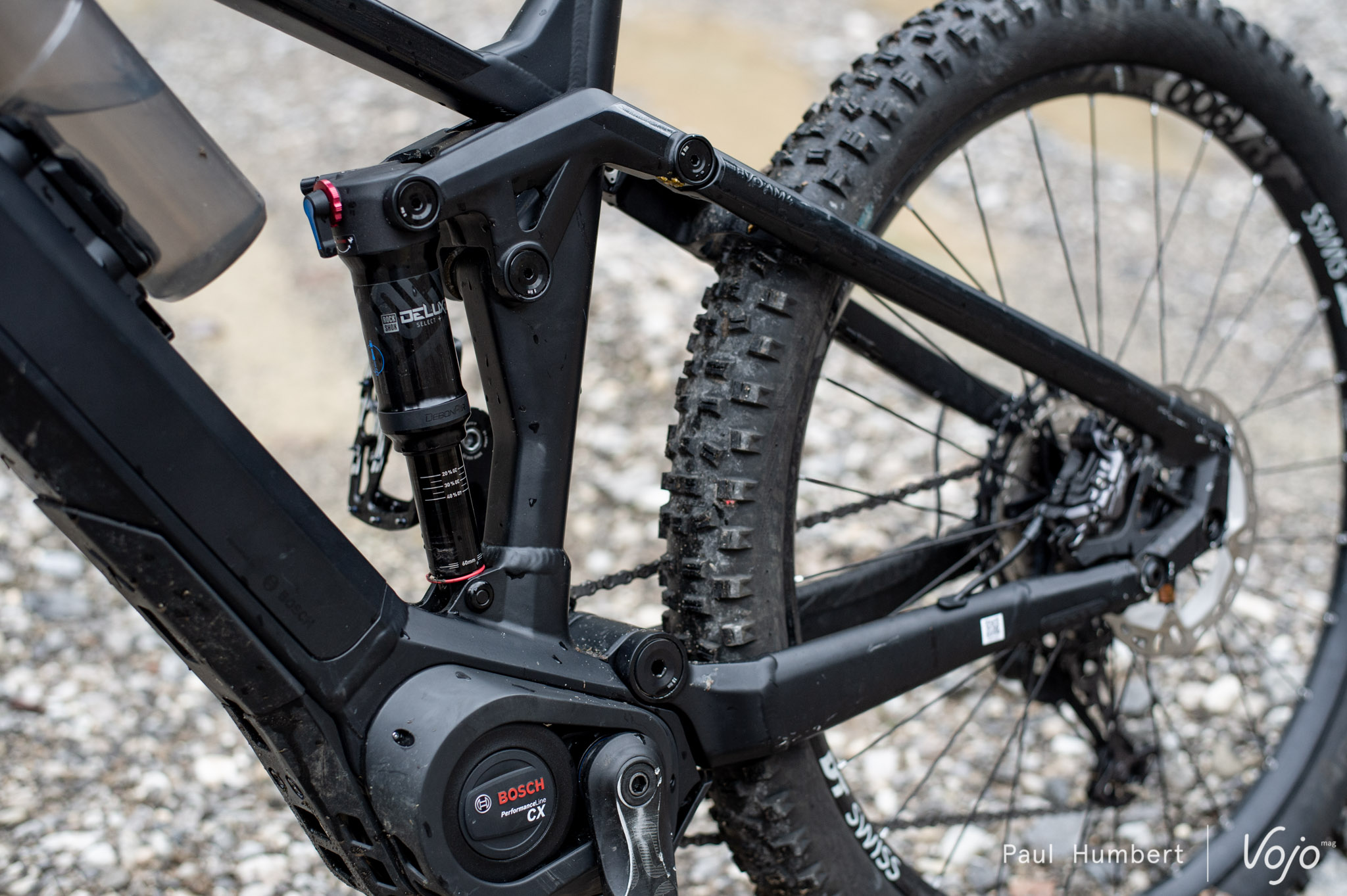 Comme beaucoup d’e-bikes, l’une des principales caractéristiques de cette plateforme est la taille de roues différenciée : du 27,5″ à l’arrière (en section de 2,6″) et du 29″ (section de 2,35″) à l’avant. L’objectif de ce choix est comme toujours d’apporter de la maniabilité et de la vivacité au vélo (grâce à la petite roue arrière), plus lourd et plus long qu’un vélo classique du fait de la présence du moteur et de la batterie, sans sacrifier la sécurité et les capacités en franchissement (préservées par la grande roue avant).