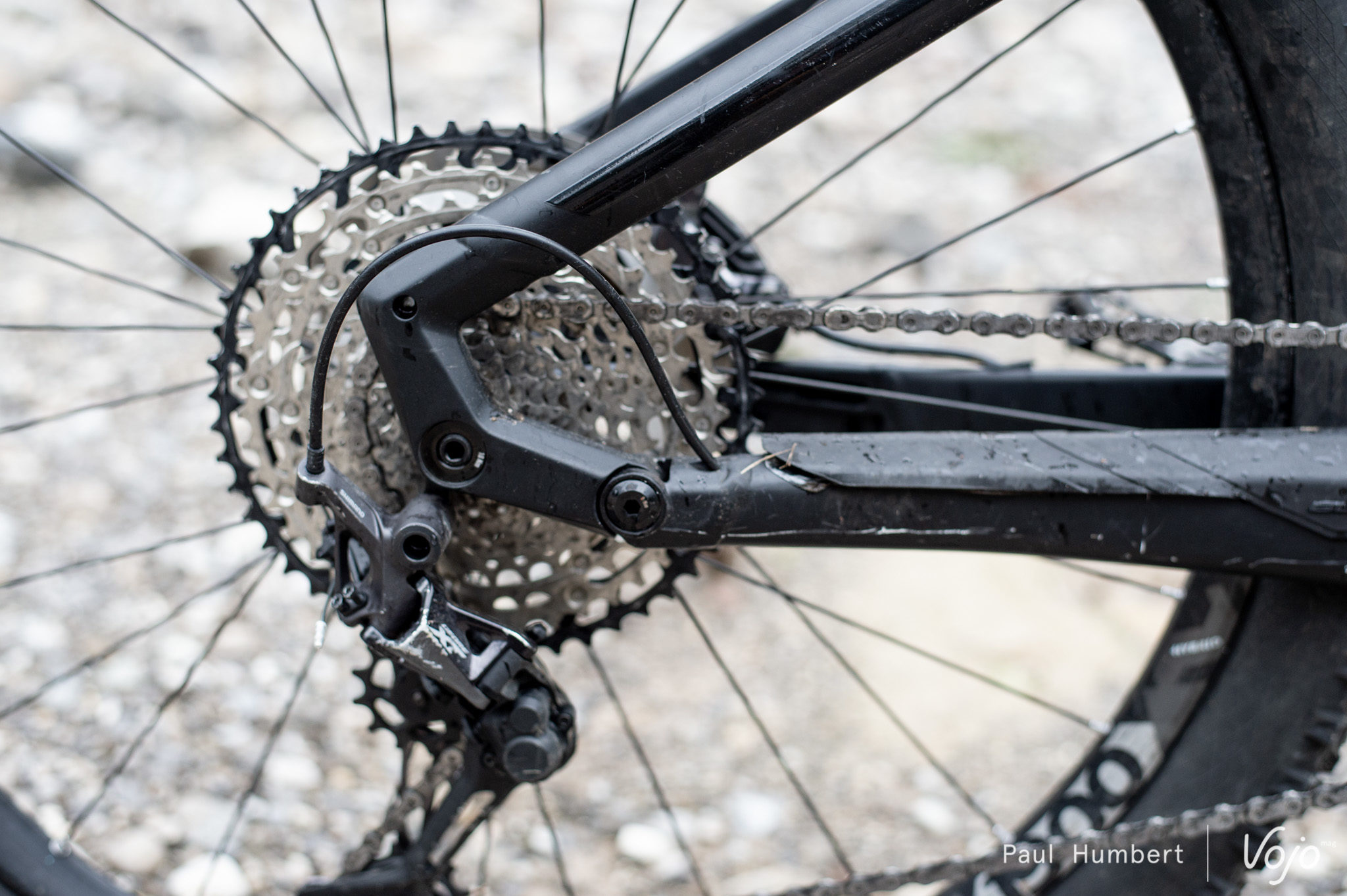 Dommage car à côté de cela, le vélo reste sain même dans les descente techniques, tant qu’on ne prend pas trop de vitesse. Le poids est présent et ne se fait pas aussi bien oublier que sur d’autres modèles mais couplé à la suspension souple et linéaire, il colle la machine au sol, ce qui rend l’ensemble sécurisant.