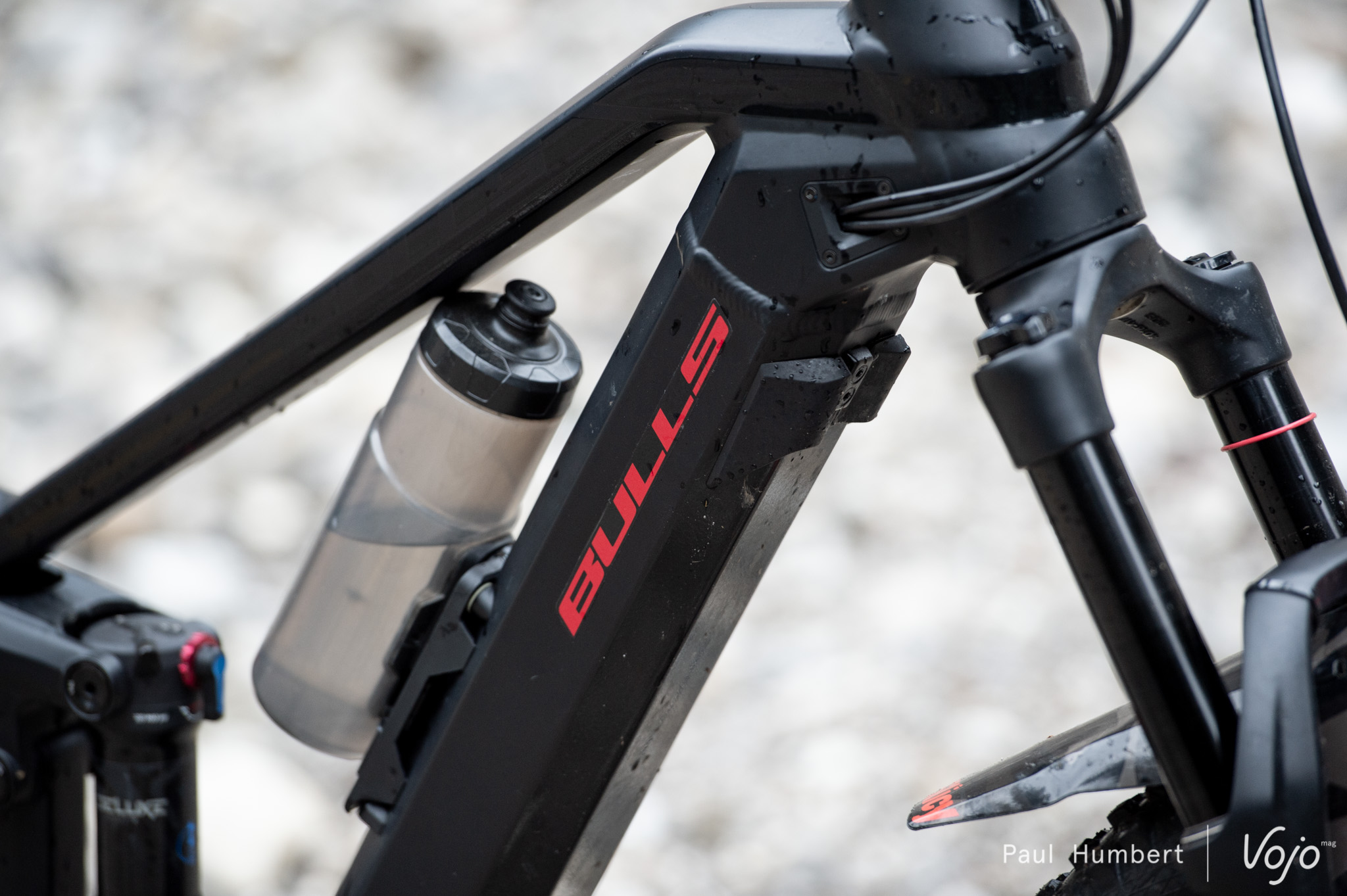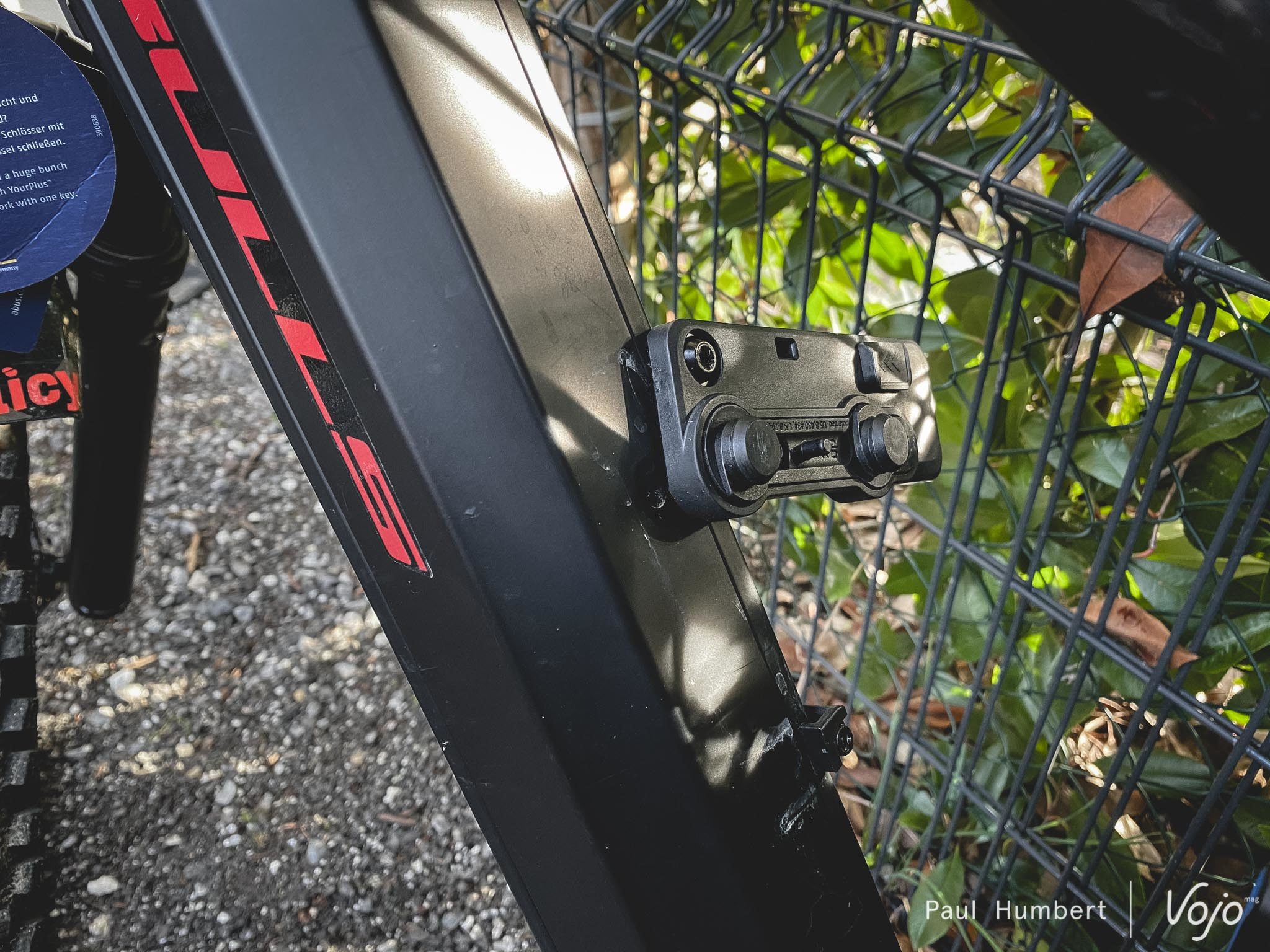 Point intéressant, la présence de série d’un porte-bidon aimanté Fidlock. Pratique et esthétique si on veut partir sans bidon sur le papier, le système s’est malheureusement révélé malcommode à l’usage car le support (qui accueille également le verrouillage du « couvercle » de la batterie) est placé trop haut. Il est difficile à trouver à l’aveugle et il faut donc ralentir afin de regarder ce que l’on fait pour remettre le bidon en place, d’autant plus avec le bidon de 600 mL fourni par la marque (une version en 450 mL existe également) qui est presque trop grand pour notre cadre en taille L.