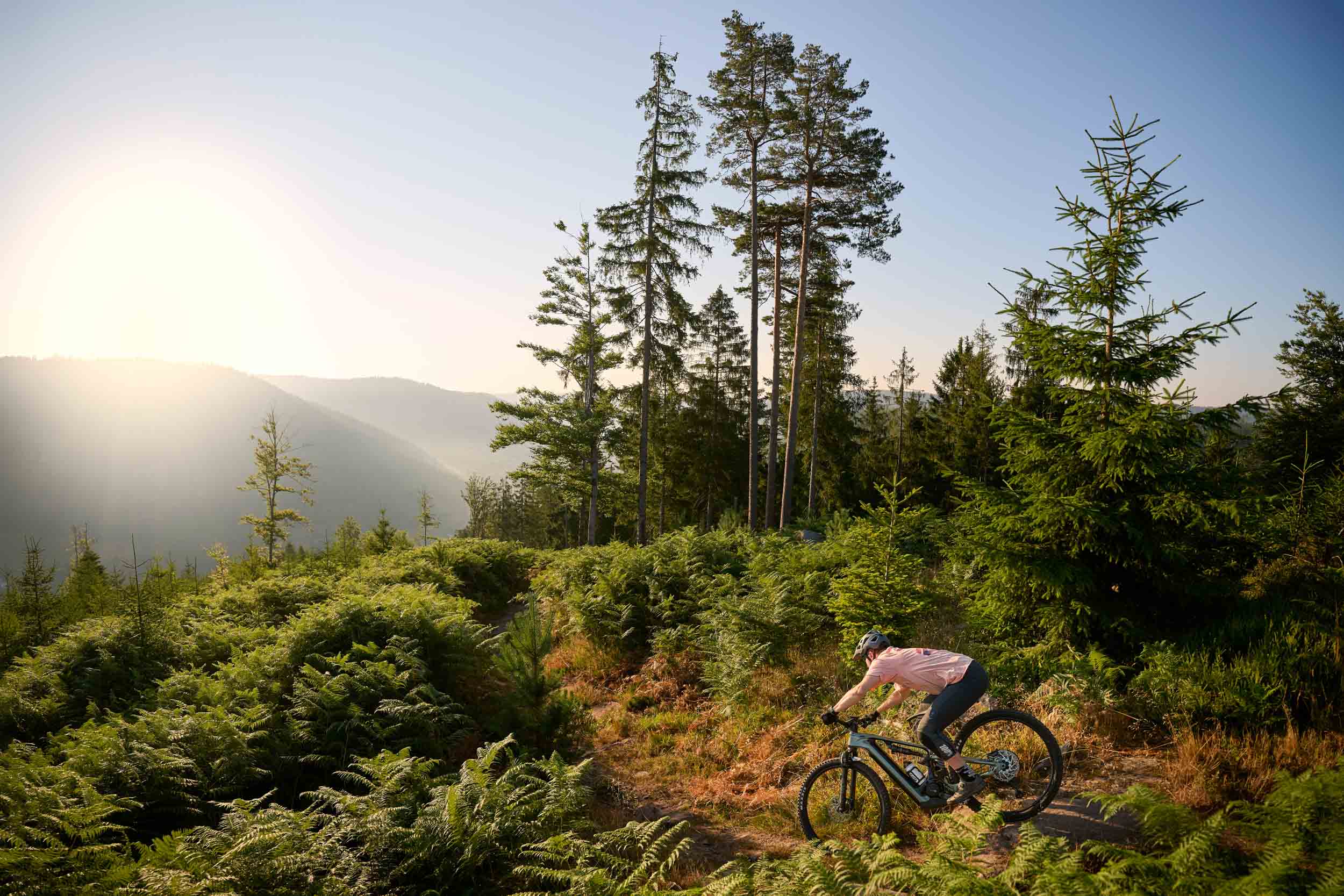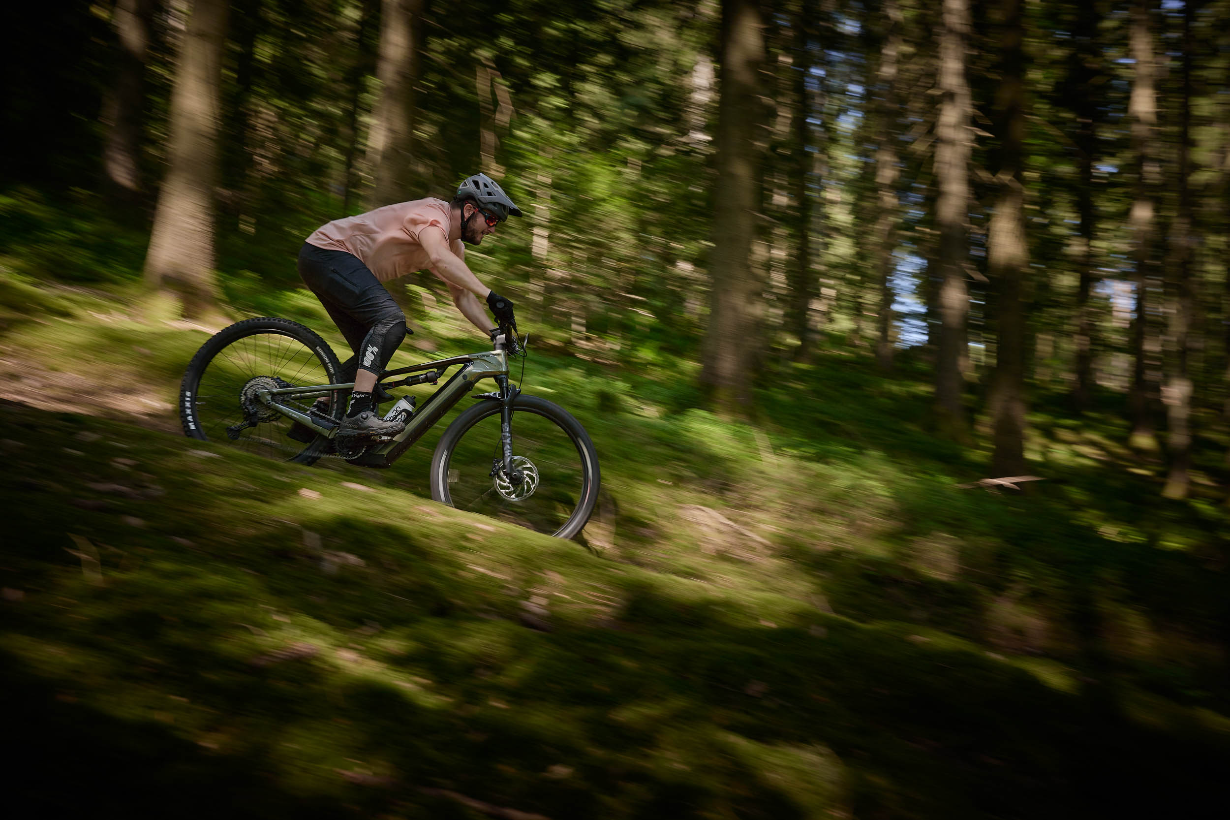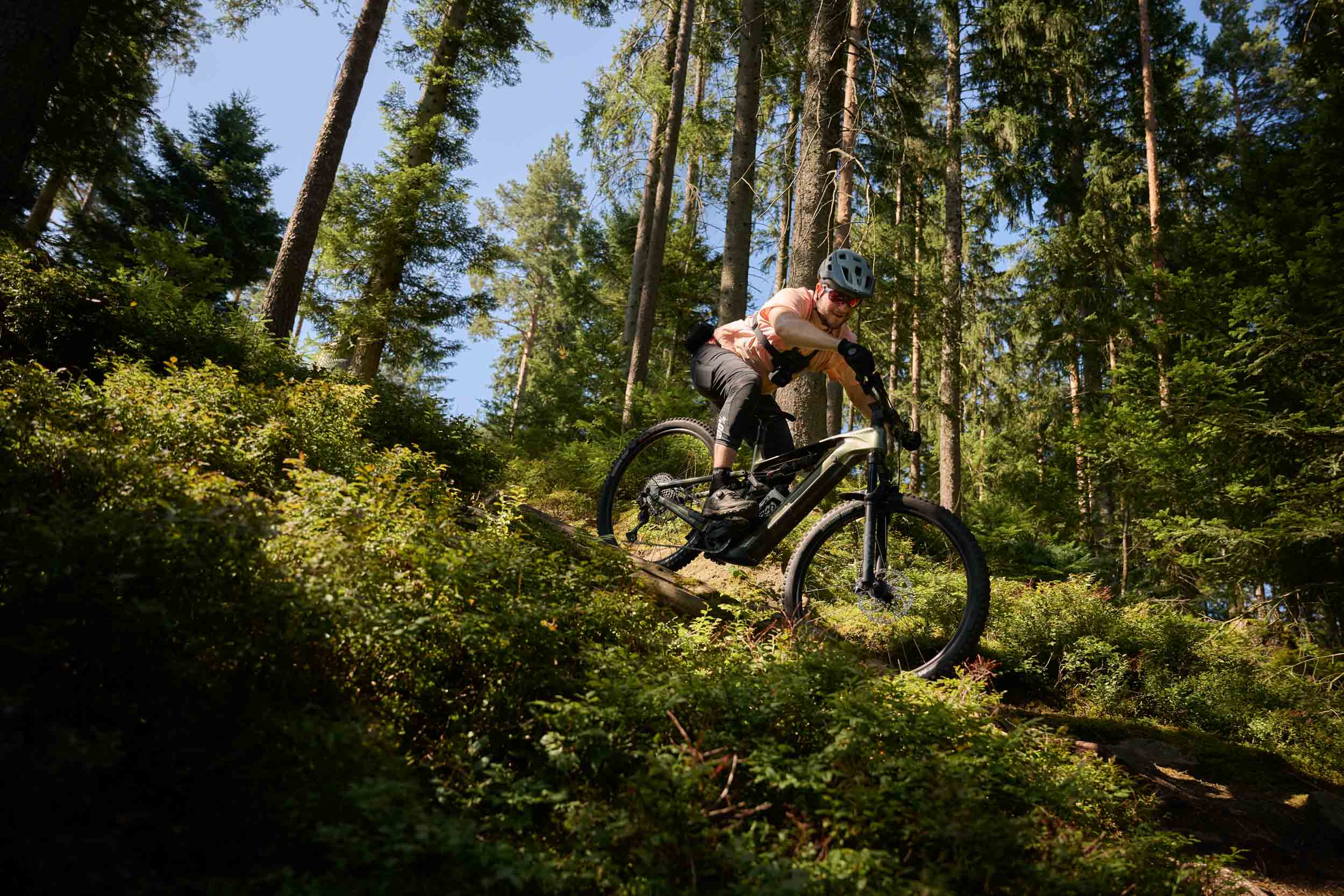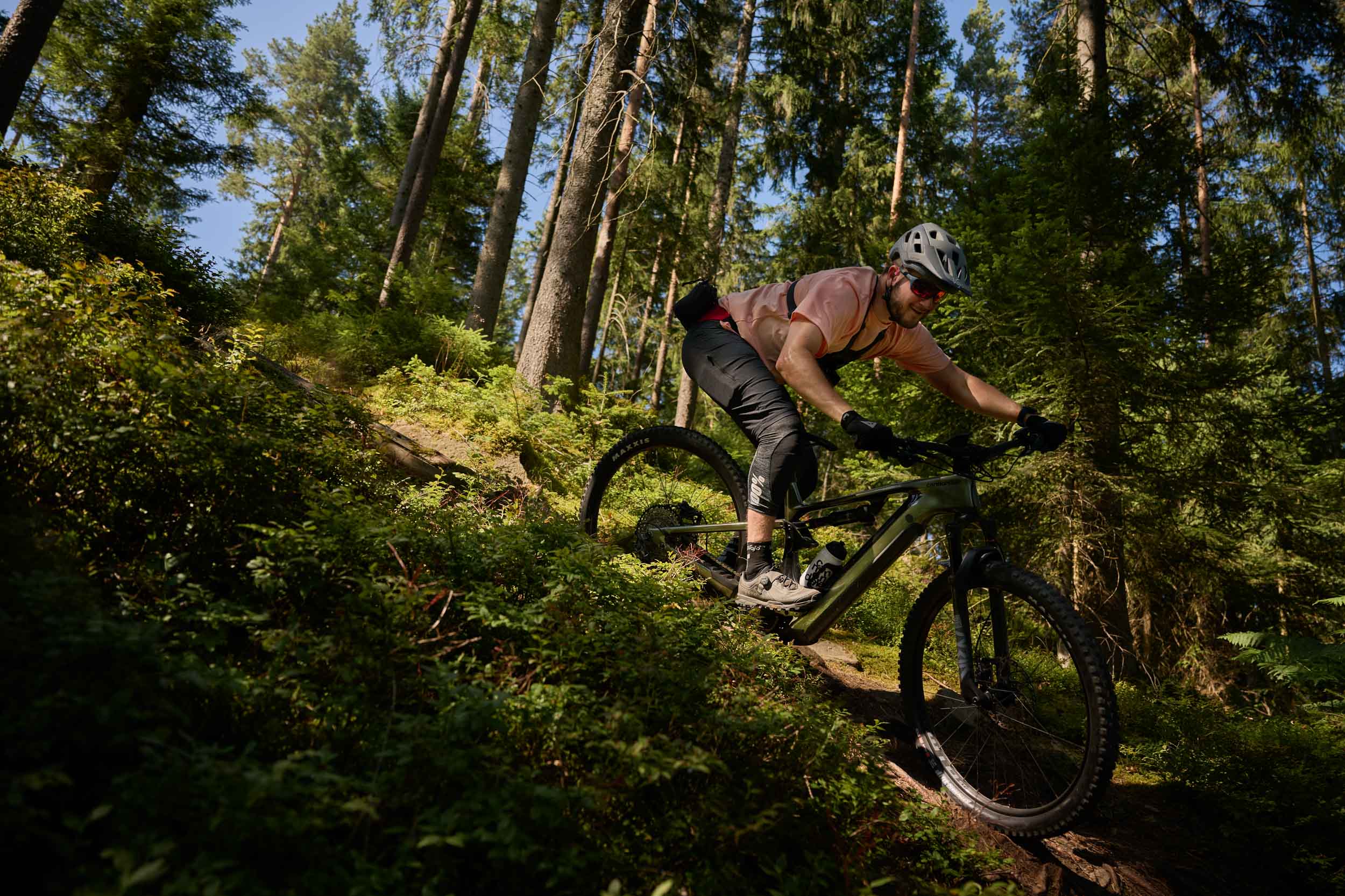 Nous avons commencé notre test en Allemagne, dans la Forêt-Noire, près de Baiersbronn qui se profile comme la capitale du VTT et du gravel dans la région. Il y a là de belles traces enduro officielles, variées, avec de la pente et de gros rochers en granit bien accrocheurs. Sur ce terrain, le Moterra Neo s’est montré très agréable, surtout, une fois encore, par la confiance qu’il inspire. Au moment de se lancer dans la pente ou dans les passages les plus engagés, on le fait sans aucune crainte. On sent le centre de gravité de la machine placé assez bas, l’angle de fourche rassure à l’avant, on sent qu’on reste bien centré sur la machine en toutes circonstances et on sait qu’on a les grandes roues et de bonnes suspensions pour assurer sur les obstacles.