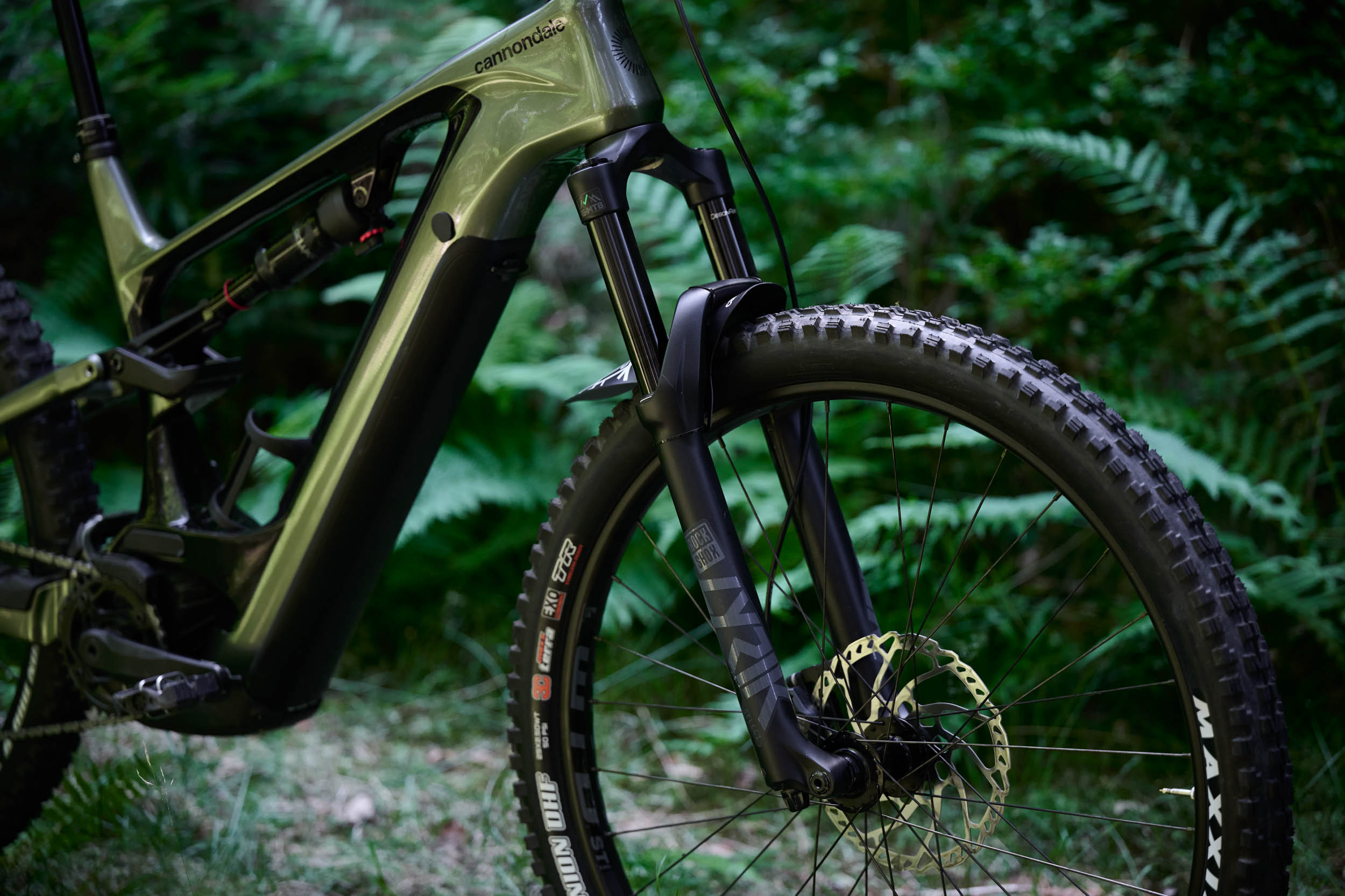 C’est RockShox qui a été choisi pour équiper ce Cannondale Moterra Neo 2 au niveau des suspensions. La fourche est une Lyrik Select en 150mm de débattement, et l’amortisseur est un Deluxe Select+, également en 150mm de débattement. Il s’agit de suspensions milieu de gamme, simples à régler et efficaces… jusqu’à un certain point. En effet, les pilotes plus pointus pourront regretter par exemple de ne pas disposer d’un réglage plus fin de la compression pour la fourche. Mais dans l’ensemble, on peut déjà aller assez loin dans l’usage du vélo sans se sentir limité, et RockShox propose les pièces pour upgrader sa fourche si on souhaite disposer de la même cartouche que sur les modèles Ultimate.