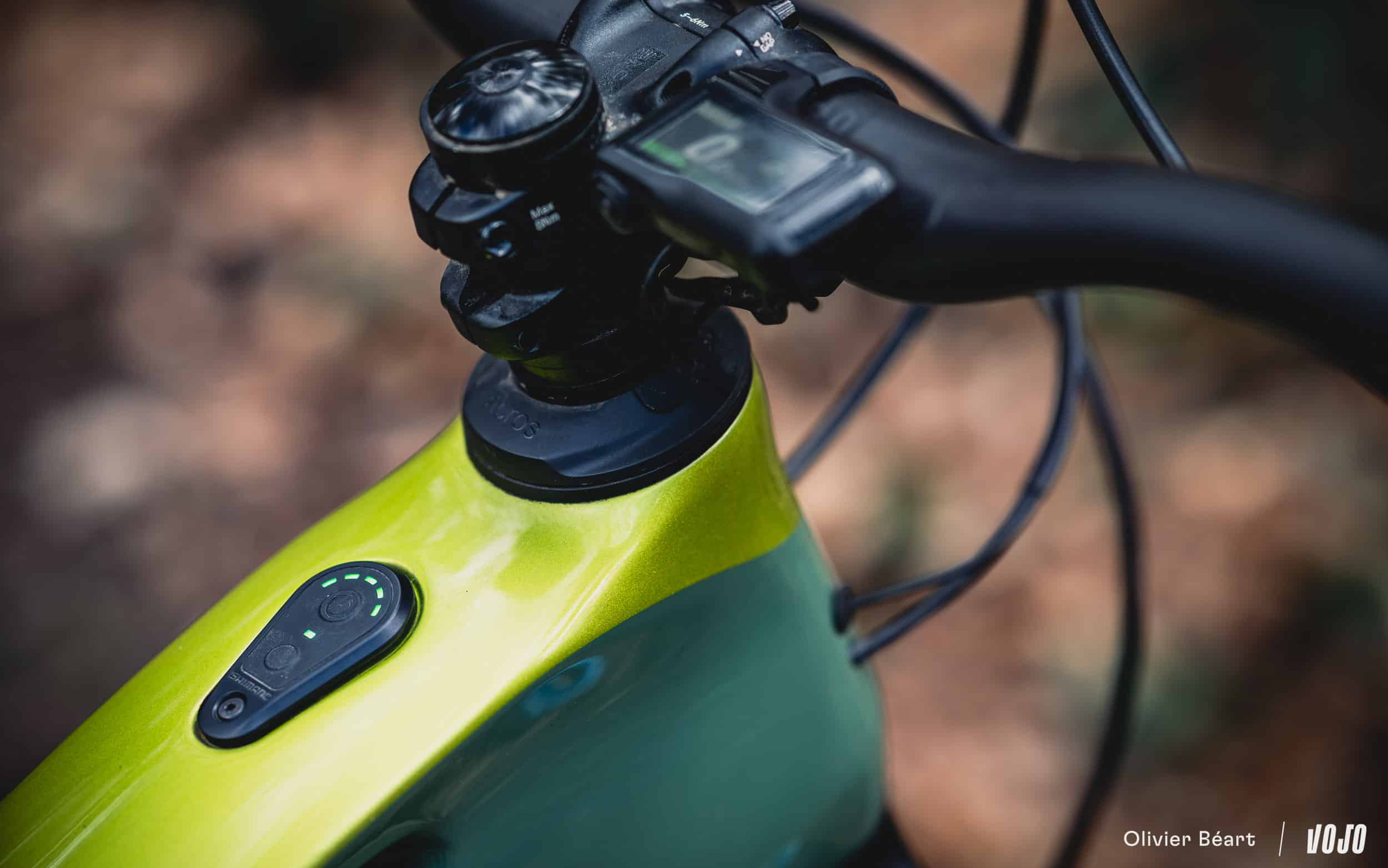 L’écran d’affichage et la commande au guidon sont les solutions habituellement offertes par Shimano. On notera toutefois qu’un bouton/commande minimaliste a été intégré sur le tube supérieur, et qu’il est donc envisageable de se passer d’écran et de commande au cintre si on désire obtenir un poste de pilotage visuellement propre et le plus simple possible.