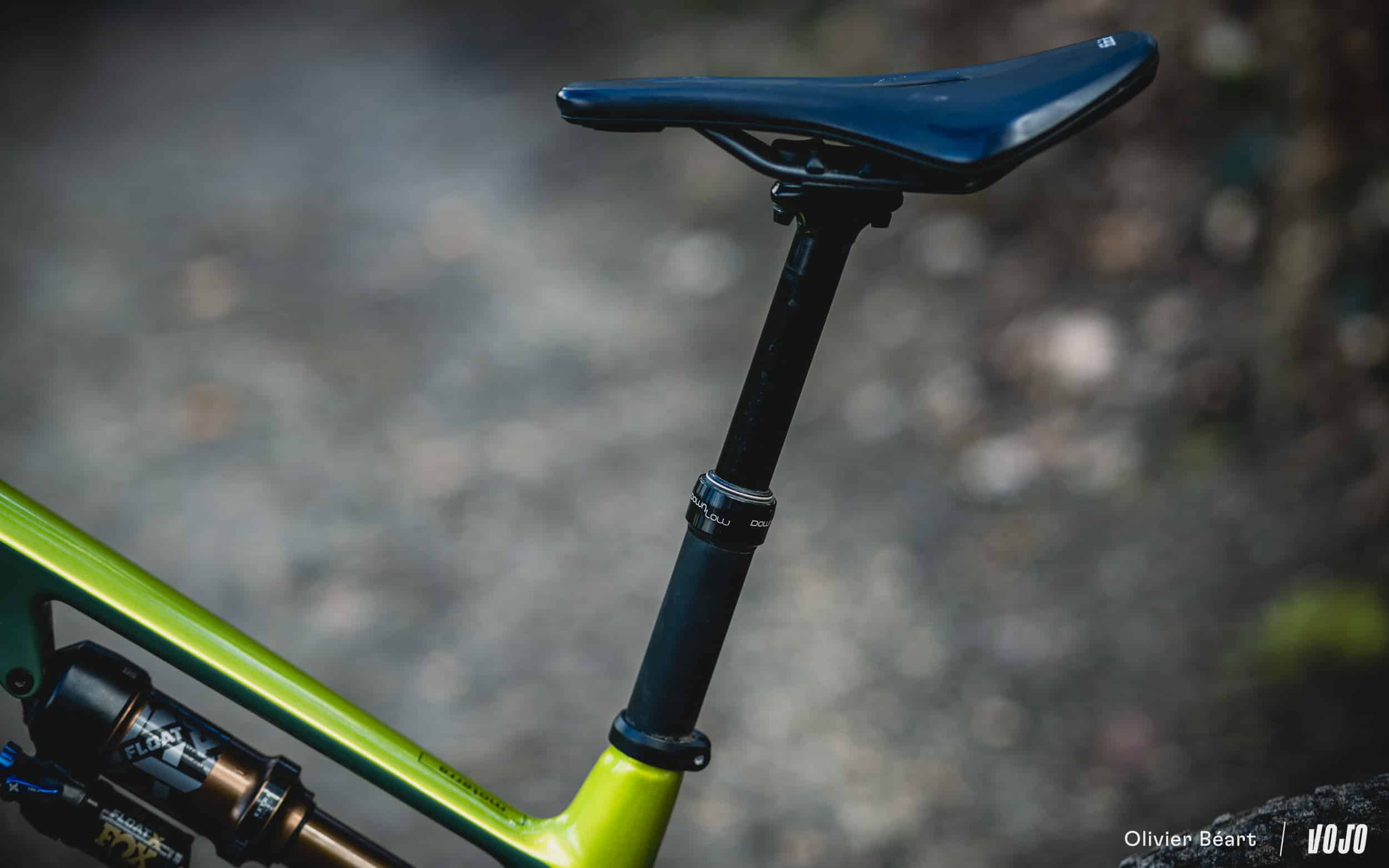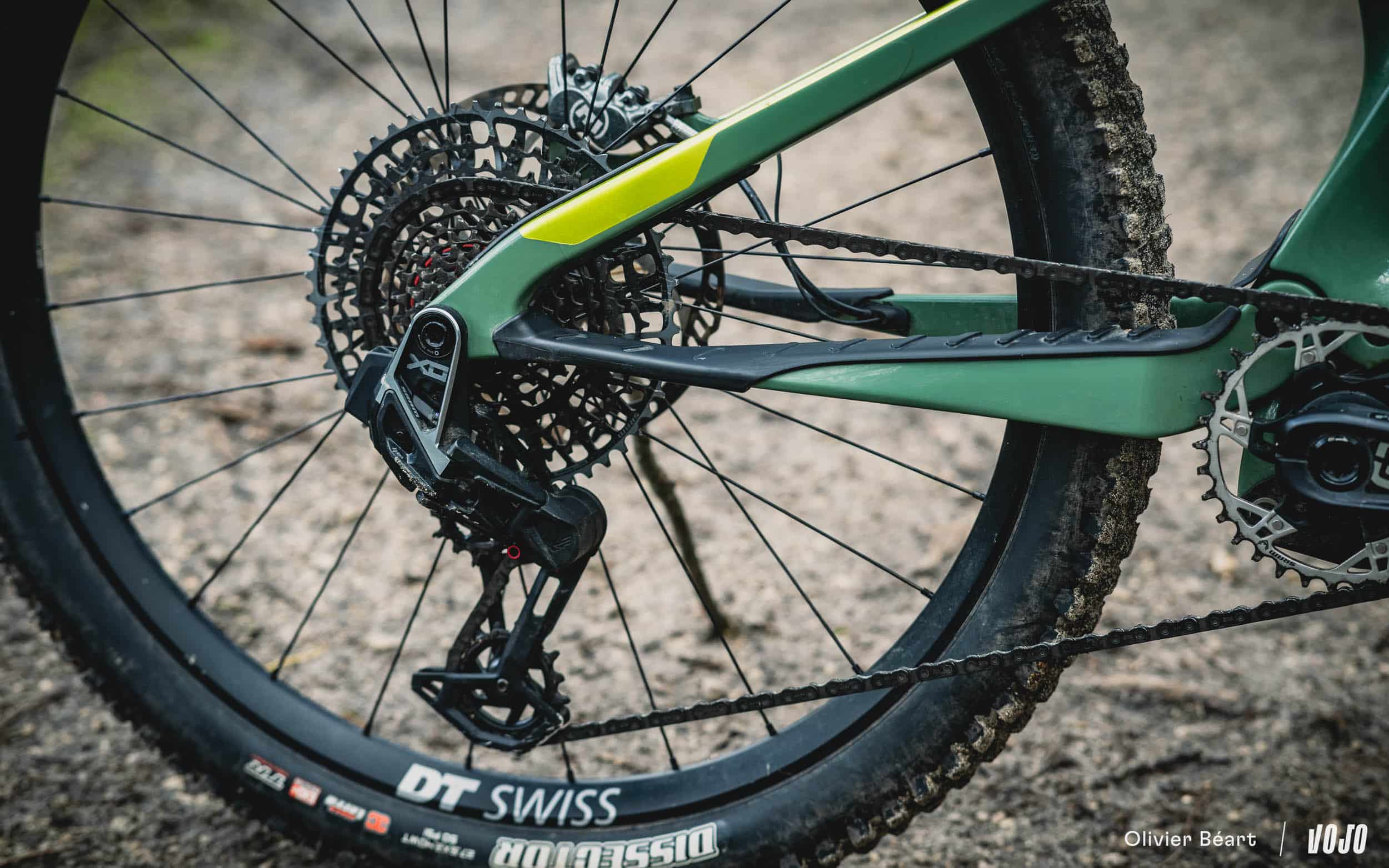 Le train roulant est composé de DT Swiss XM1700 de 30 mm de largeur interne, chaussées de pneumatiques Maxxis Minion DHF (2,5 de section, carcasse EXO+) à l’avant et Maxxis Dissector (2,4 de section, carcasse EXO+) à l’arrière. Des roues pas spécialement haut de gamme, mais qui font « bien le taf » et qui ont un comportement très homogène. On pourra facilement gratter du poids en les remplaçant par des carbone, mais attention à ne pas prendre des jantes trop rigides, cela risquerait de nuire à l’équilibre global du vélo, très bon avec ces roues en alu. Quant à la monte de pneus, c’est du connu et bien dans la cible pour le programme.