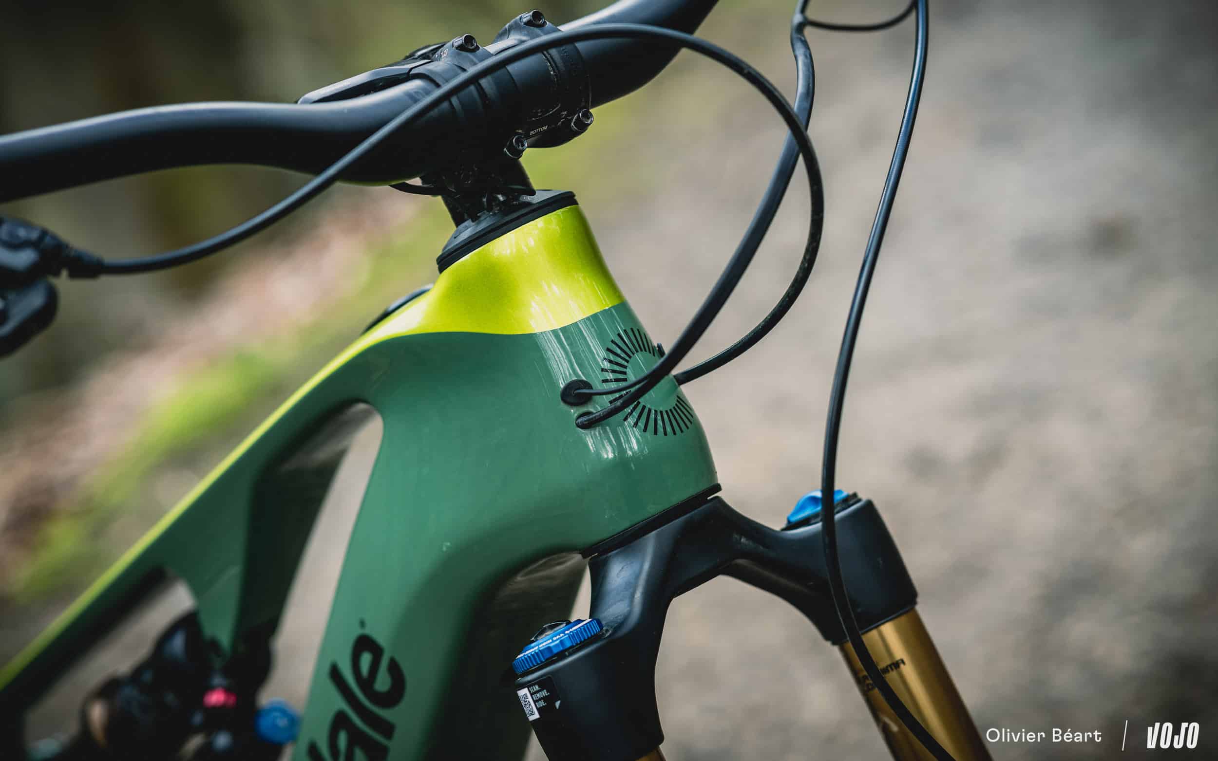 Le passage des câbles et gaines est un sujet qui continue à diviser… et Cannondale a préféré ne pas se prononcer ! Enfin, disons que la marque laisse le choix : d’origine, le Cannondale Moterra SL est équipé de passages internes avec une entrée par les côtés de la douille de direction, « à l’ancienne », mais il est aussi possible d’opter pour une entrée au niveau du jeu de direction car il y a tout ce qu’il faut à cet endroit là aussi.