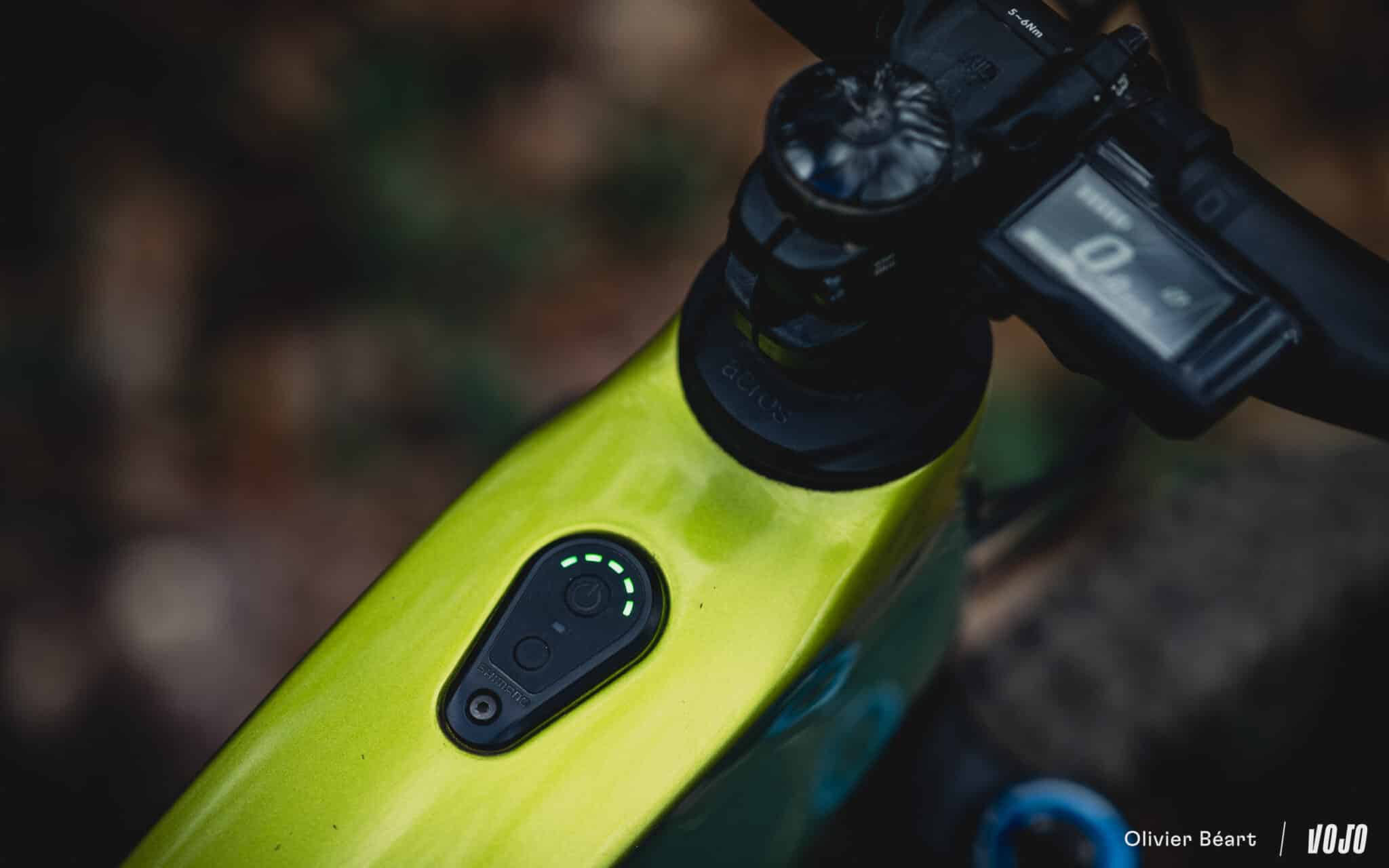 L’écran d’affichage et la commande au guidon sont les solutions habituellement offertes par Shimano. On notera toutefois qu’un bouton/commande minimaliste a été intégré sur le tube supérieur, et qu’il est donc envisageable de se passer d’écran et de commande au cintre si on désire obtenir un poste de pilotage visuellement propre et le plus simple possible.