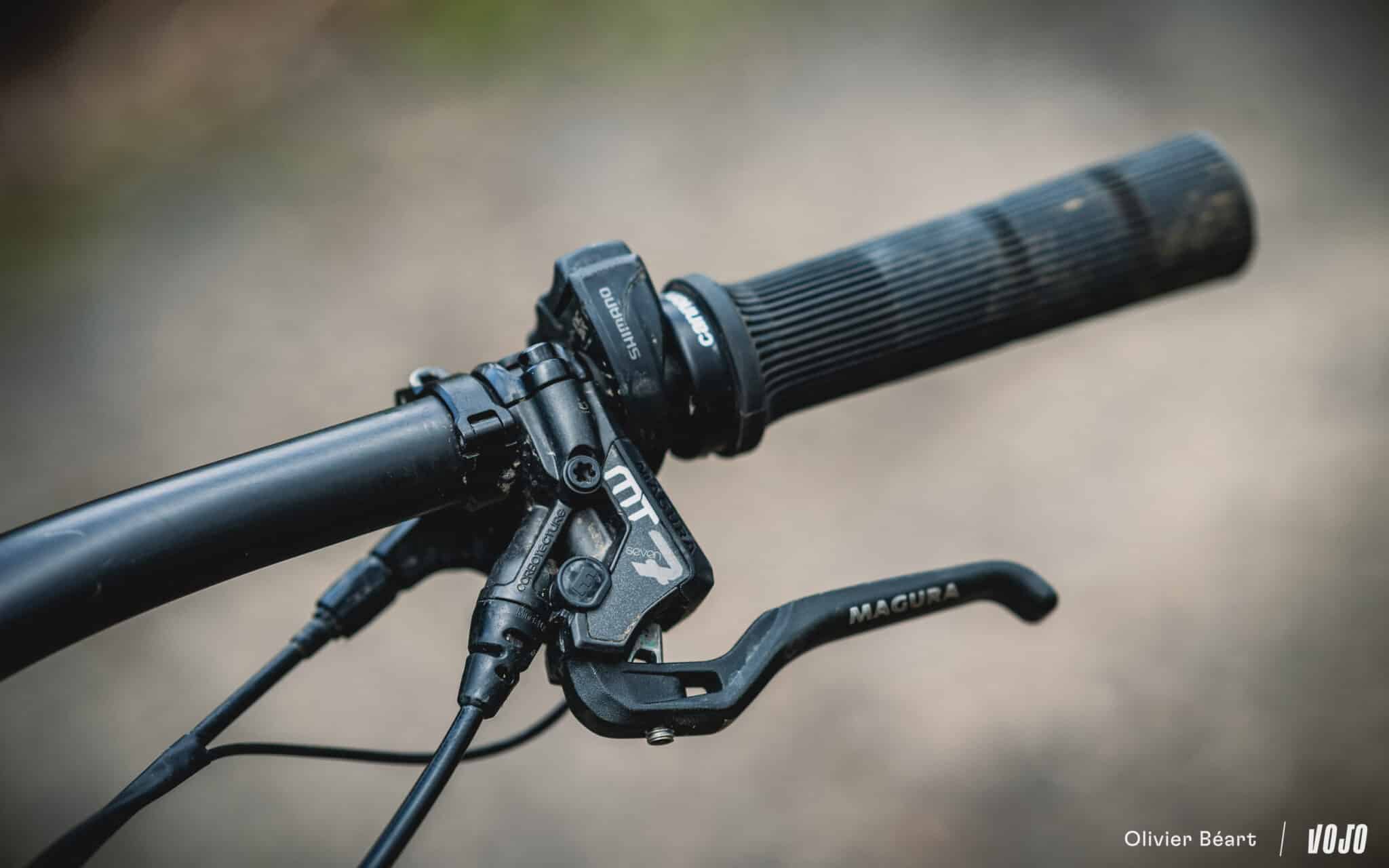 Le freinage est assuré par Magura avec une paire de MT7 équipés de leviers HCW et disques de 203 mm avant/arrière. Nous avons aimé, comme toujours, la puissance des MT7, mais nous avons particulièrement apprécié la monte de leviers optionnels HCW. Leur forme et le fait qu’ils soient en aluminium améliore grandement le toucher par rapport aux modèles standard. Un vrai plus et bravo Cannondale pour avoir poussé jusque-là le souci du détail.