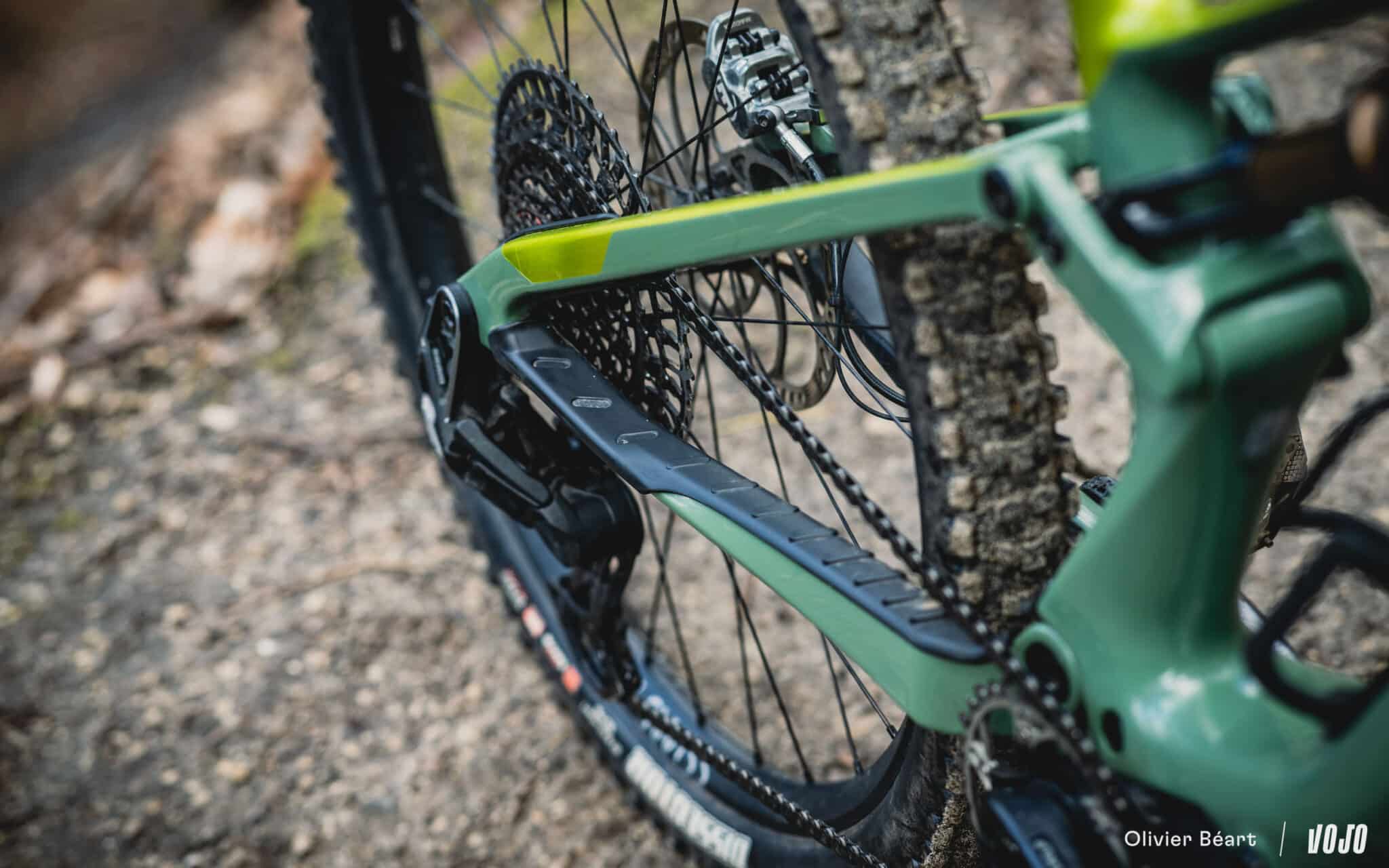 Ce point de pivot sous forme de fines lames de carbone prend place tout à l’arrière des bases pour former un vrai pivot Horst Link, de sorte qu’on peut dire que cette cinématique est un authentique 4 Bar Linkage (cf. Petit lexique illustré du VTT : toutes les clés pour comprendre). Le « FlexPivot » permet juste de se passer de roulements du côté des bases, et limite ainsi la maintenance.