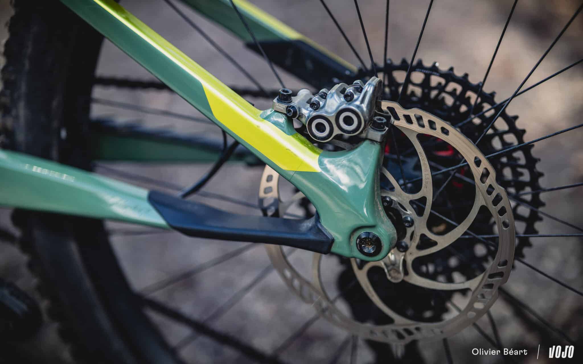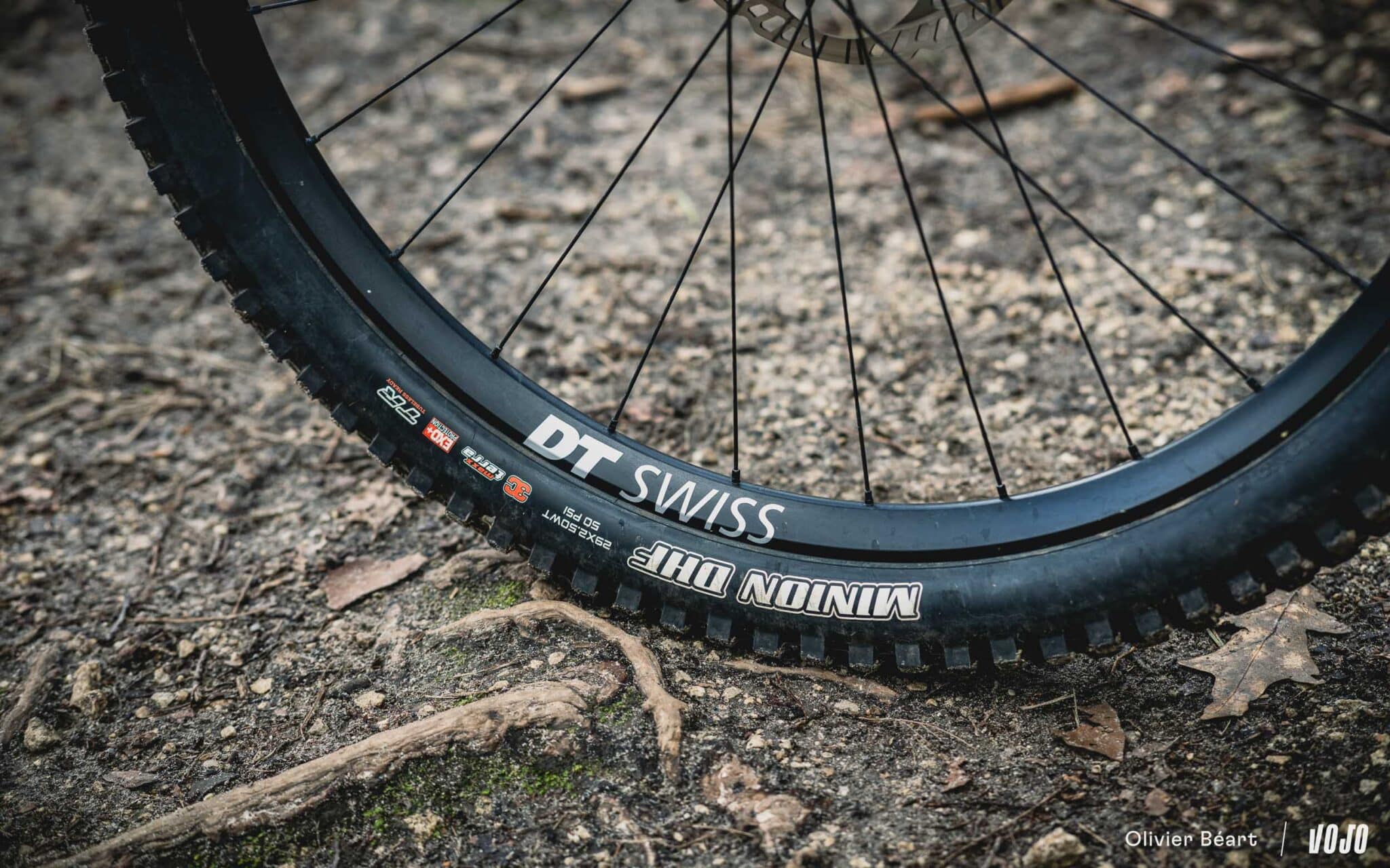 Le train roulant est composé de DT Swiss XM1700 de 30 mm de largeur interne, chaussées de pneumatiques Maxxis Minion DHF (2,5 de section, carcasse EXO+) à l’avant et Maxxis Dissector (2,4 de section, carcasse EXO+) à l’arrière. Des roues pas spécialement haut de gamme, mais qui font « bien le taf » et qui ont un comportement très homogène. On pourra facilement gratter du poids en les remplaçant par des carbone, mais attention à ne pas prendre des jantes trop rigides, cela risquerait de nuire à l’équilibre global du vélo, très bon avec ces roues en alu. Quant à la monte de pneus, c’est du connu et bien dans la cible pour le programme.