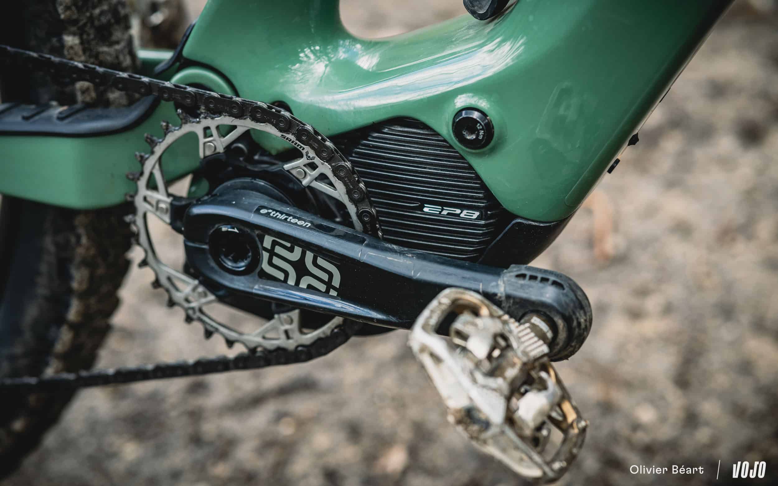 La transmission est une Sram XO T-Type, avec un plateau de 34 dents et des manivelles de 165 mm de longueur, dont on vous a déjà dit tout le bien qu’on pensait : Test | Sram Eagle AXS 2023 : sans égal. Ce type de transmission est encore plus appréciable en e-bike, où on peut vraiment changer les rapports sans arrière-pensée et sans avoir l’impression qu’on torture ses pignons, même à pleine puissance.