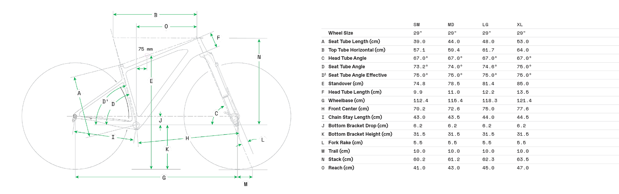 La géométrie est sans aucun doute un des points sur lesquels le Cannondale Scalpel HT se démarque de son prédécesseur. Encore relativement classique sur les dernières évolutions du F-Si (angle de direction à 69°, bases courtes, reach à 420 mm en taille M), elle plonge dans la tendance du long et couché sur ce nouveau Scalpel HT. L’angle de direction passe à 67° (66,5° avec fourche en 110 mm et 66° en 120 mm, puisque le montage d’une fourche à plus grand débattement a été pris en compte par Cannondale), l’angle du tube de selle se redresse pour atteindre 75°, le reach s’allonge de 10 mm sur chaque taille et les bases grandissent elles aussi.