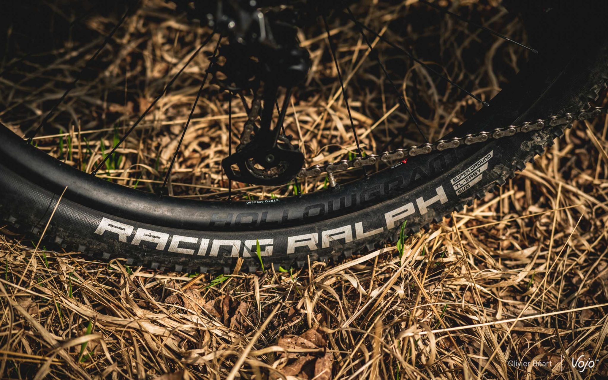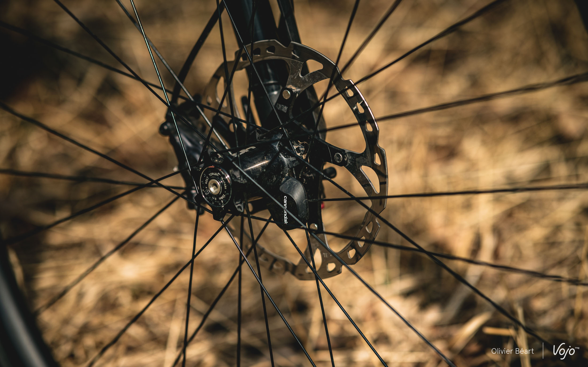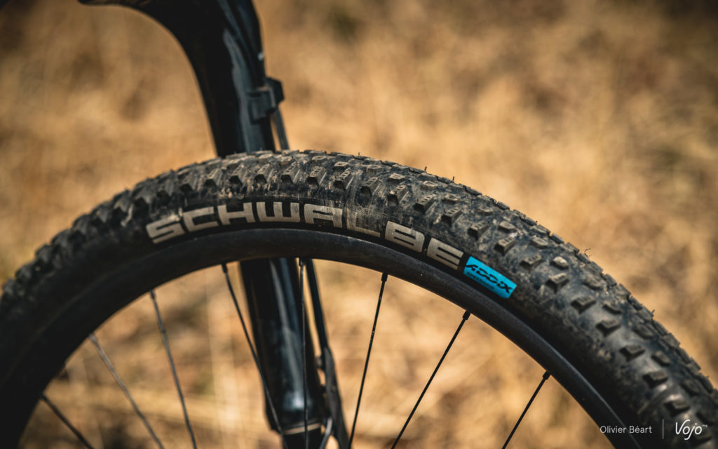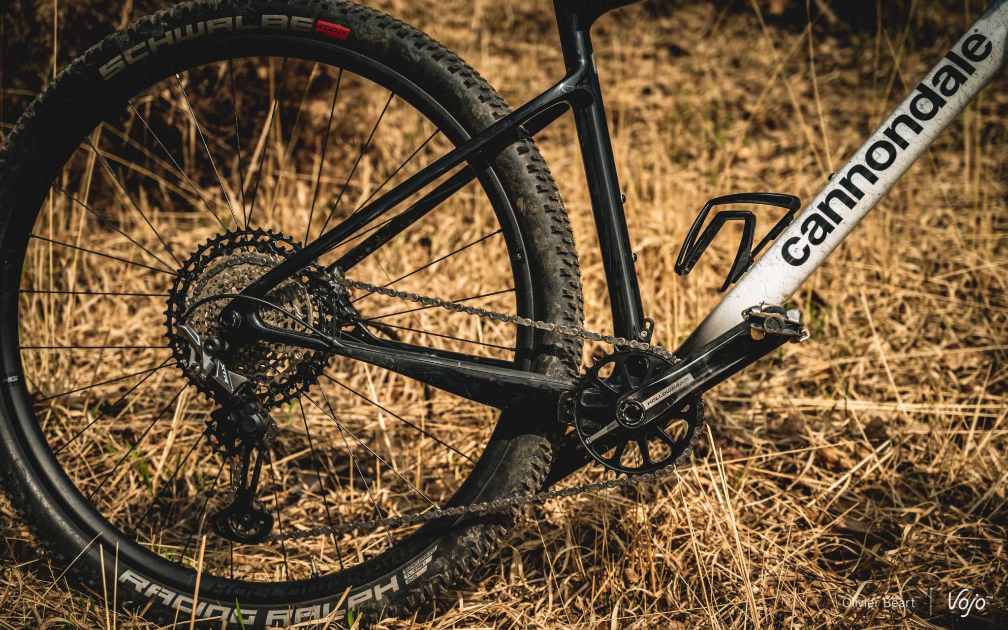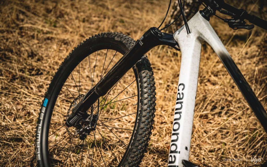 Les roues sont également signées Hollowgram, la marque d’accessoires haut de gamme maison. Il s’agit de jantes en carbone en 25mm de large, montées sur des moyeux maison et avec d’excellents pneus Schwalbe Racing Ralph/Ray en 2.25mm. On apprécie que Cannondale ne cède pas aveuglément aux sirènes des jantes de 30mm et des pneus en 2.4, utiles sur certains circuits de compétition, mais contre-productives pour une pratique plus éclectique et des cyclistes amateurs car les pneus XC larges ont tendance à « flotter » dès que le sol est un peu meuble ou recouvert de feuilles/boue/humus.