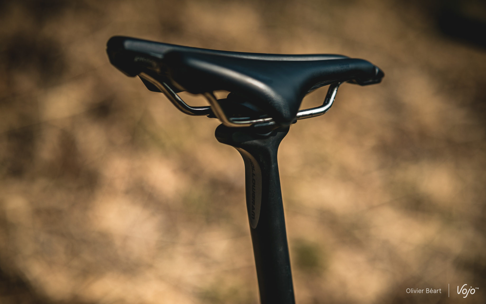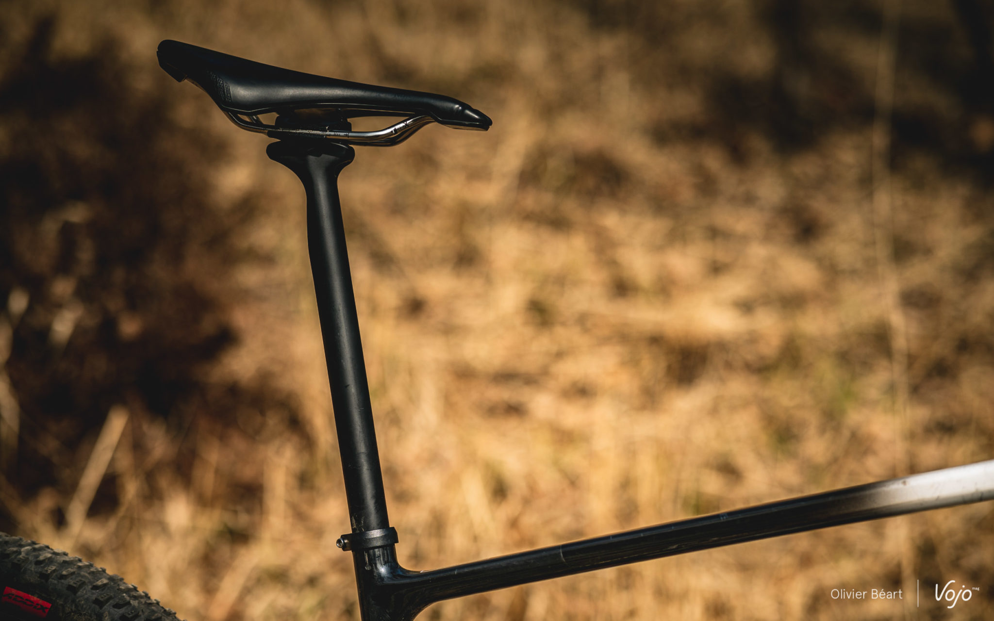 La tige de selle est rigide, mais tout est prévu au niveau du passage de câble pour recevoir une tige de selle télescopique. Nous verrons dans la partie test terrain que c’est un accessoire bien utile. La tige de selle d’origine a tout de même une utilité et une particularité, puisqu’elle est aplatie à son sommet afin de pouvoir se déformer davantage qu’un simple modèle classique rond afin d’offrir plus de confort. Ce n’est pas une première chez Cannondale, mais cela mérite d’être signalé.