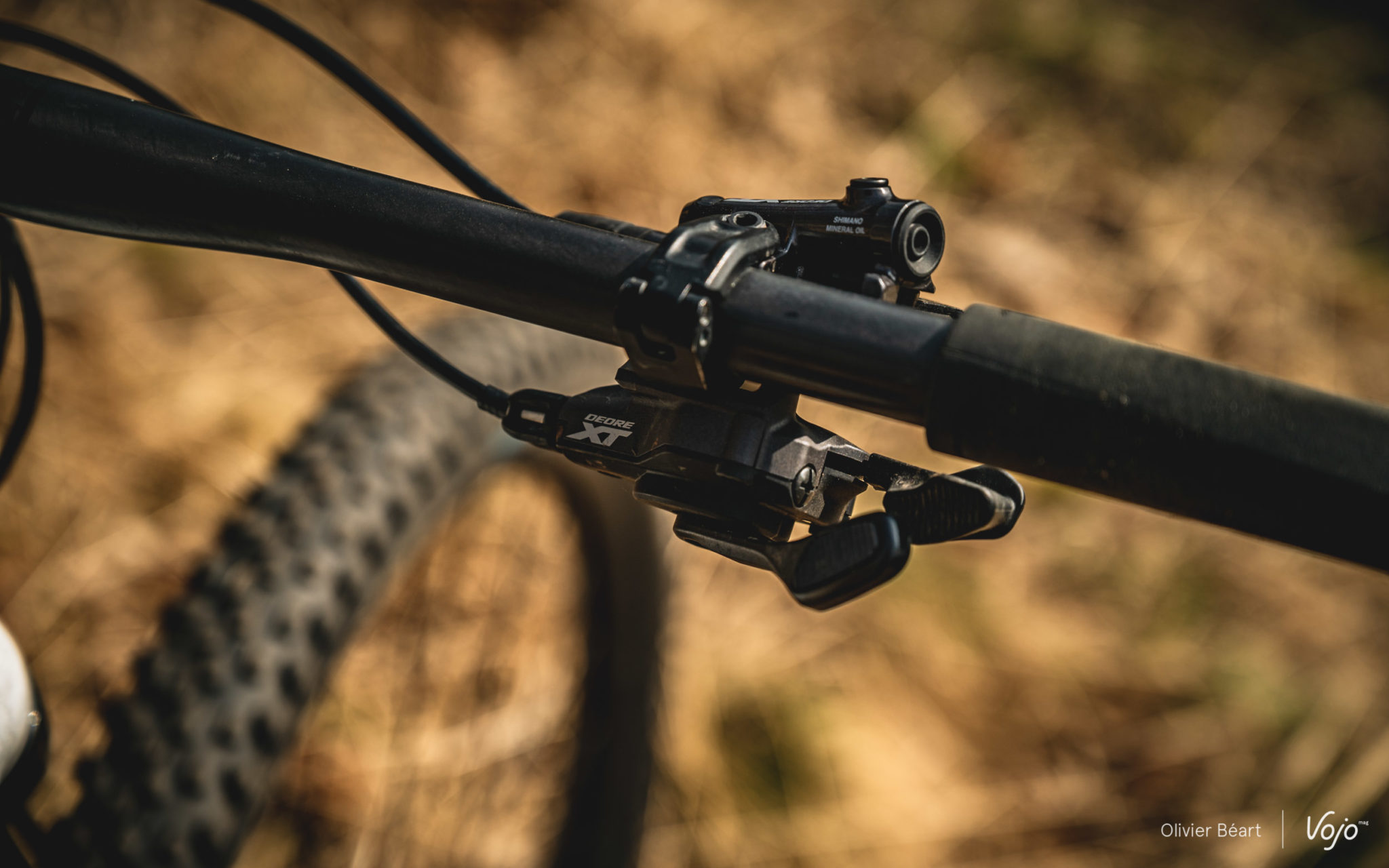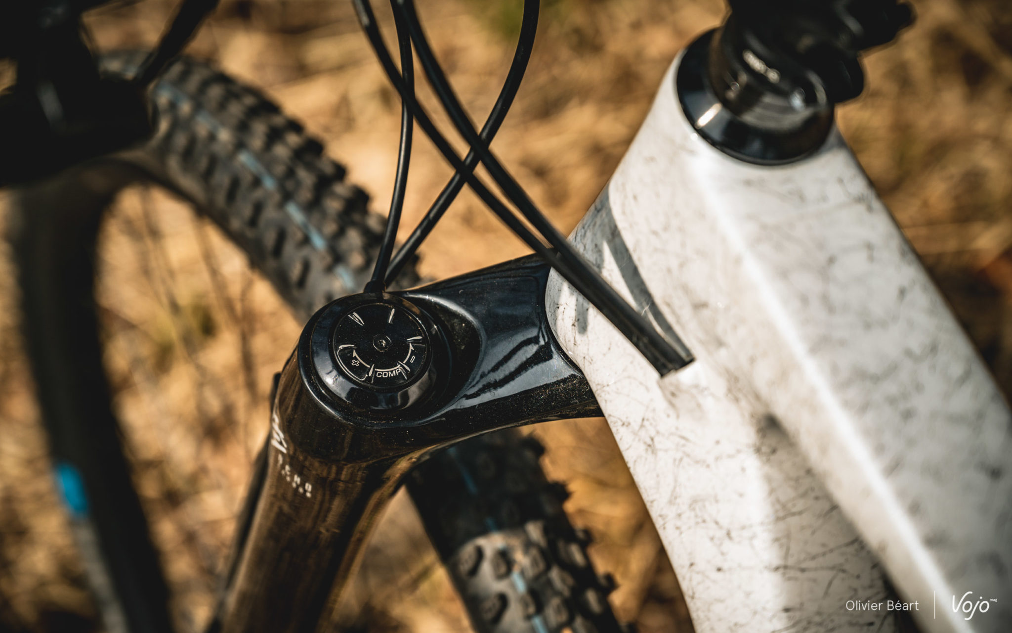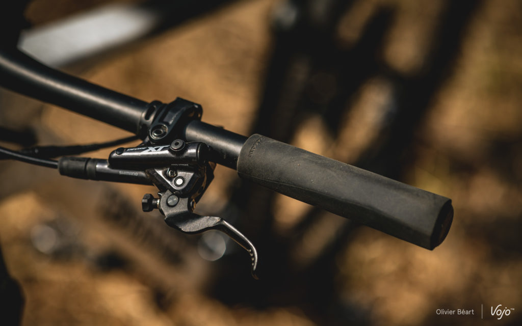 Le poste de pilotage adopte les standards contemporains avec une potence de 70mm de long et un cintre maison, en carbone, en 760mm de large. De quoi bien ouvrir le torse sans non plus tirer sur des largeurs excessives. Les grips en silicone de forme anguleuse ne sont pas désagréables mais leur surface est un peu trop lisse et leur toucher trop dur pour vraiment rivaliser avec des modèles phares comme les ESI. Cela dit, ce n’est pas grand chose à changer. On dispose d’un blocage au guidon pour la fourche (un classique Fox), ce qui est cohérent sur ce type de machine.