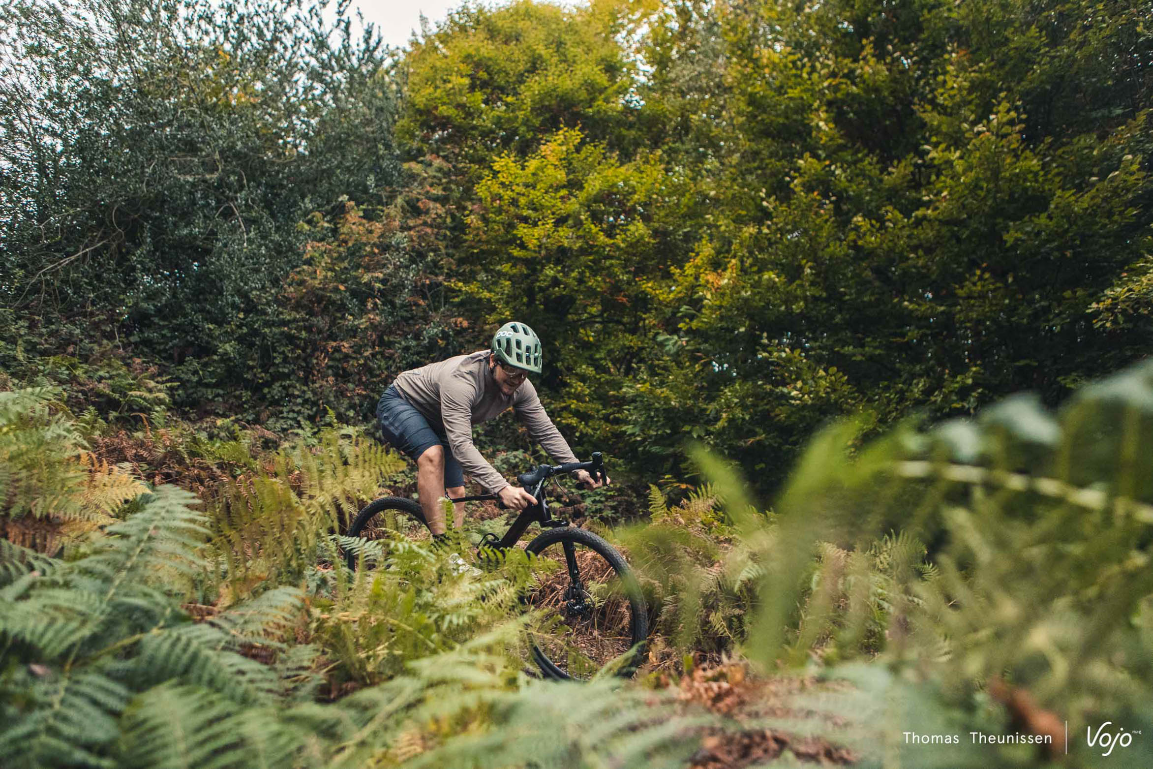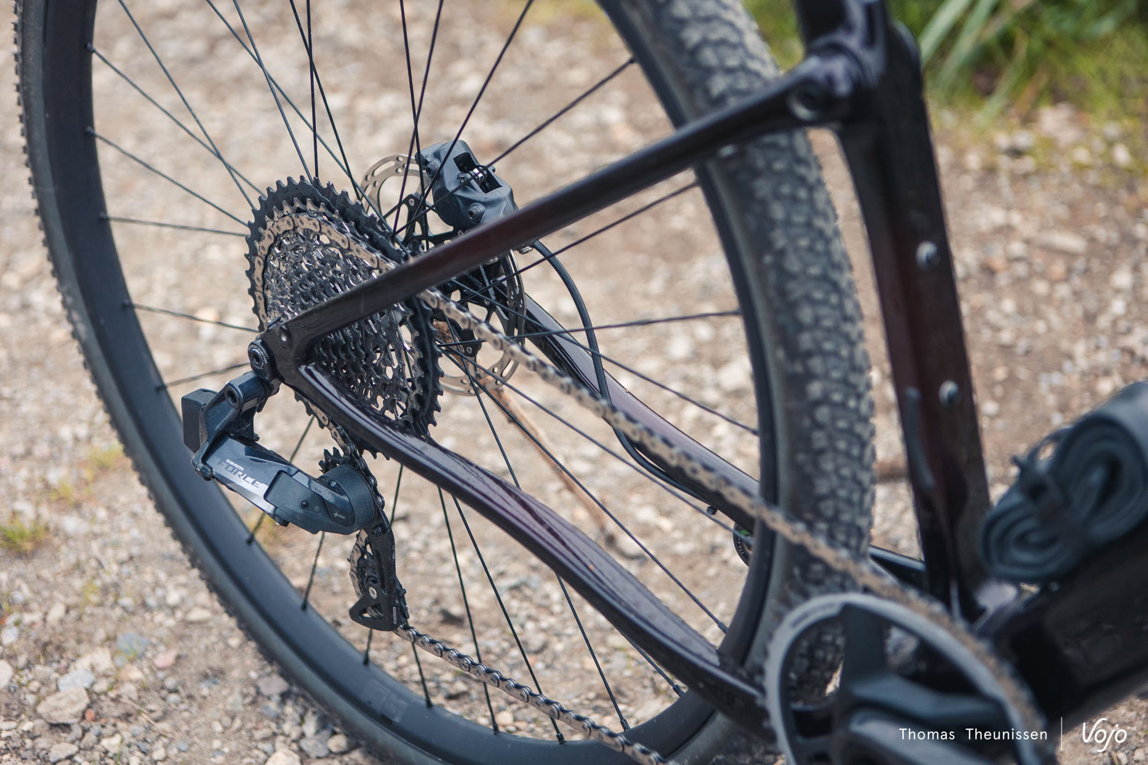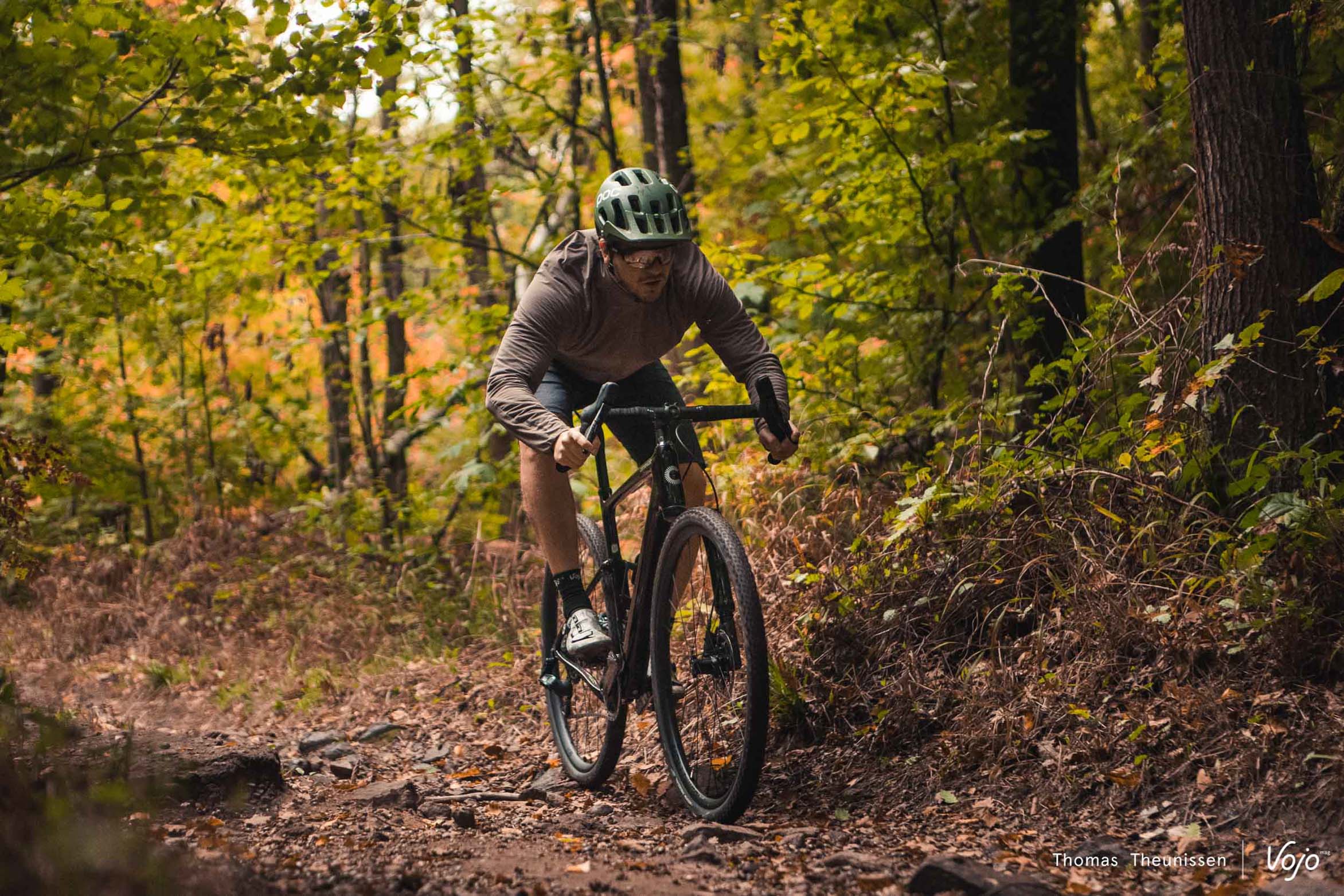 Du côté des équipements, rien à redire, le groupe Sram Force AXS XPLR fonctionne parfaitement et les changements de rapports du dérailleur électronique sont toujours aussi agréables de douceur et de précision. Avec la cassette 10-44 et le pédalier 40 dents, nous ne nous sommes pas sentis limités dans le programme du vélo. Le freinage Sram est bon, même s’il n’est pas le plus puissant. Nous avons déjà dit tout le bien que nous pensons des roues, mais au niveau du train roulant, il faut aussi souligner les excellents pneus Vittoria Mezcal qui sont solides, accrocheurs et sécurisants tout en restant vraiment roulants.