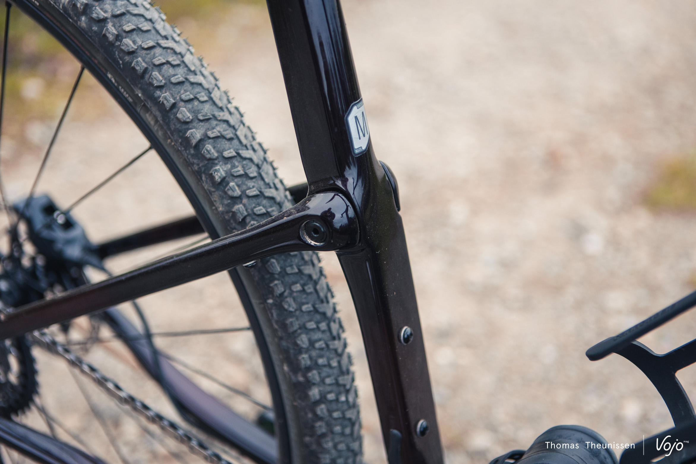 Le cadre offre quant à lui un dégagement suffisant pour le montage de pneus jusqu’à 700×45, tout en conservant 6 mm de chaque côté selon la marque. Le montage de roues de 650b est aussi possible. Un passage de gaine interne est également de la partie, tout comme le support pour accueillir un garde-boue arrière.