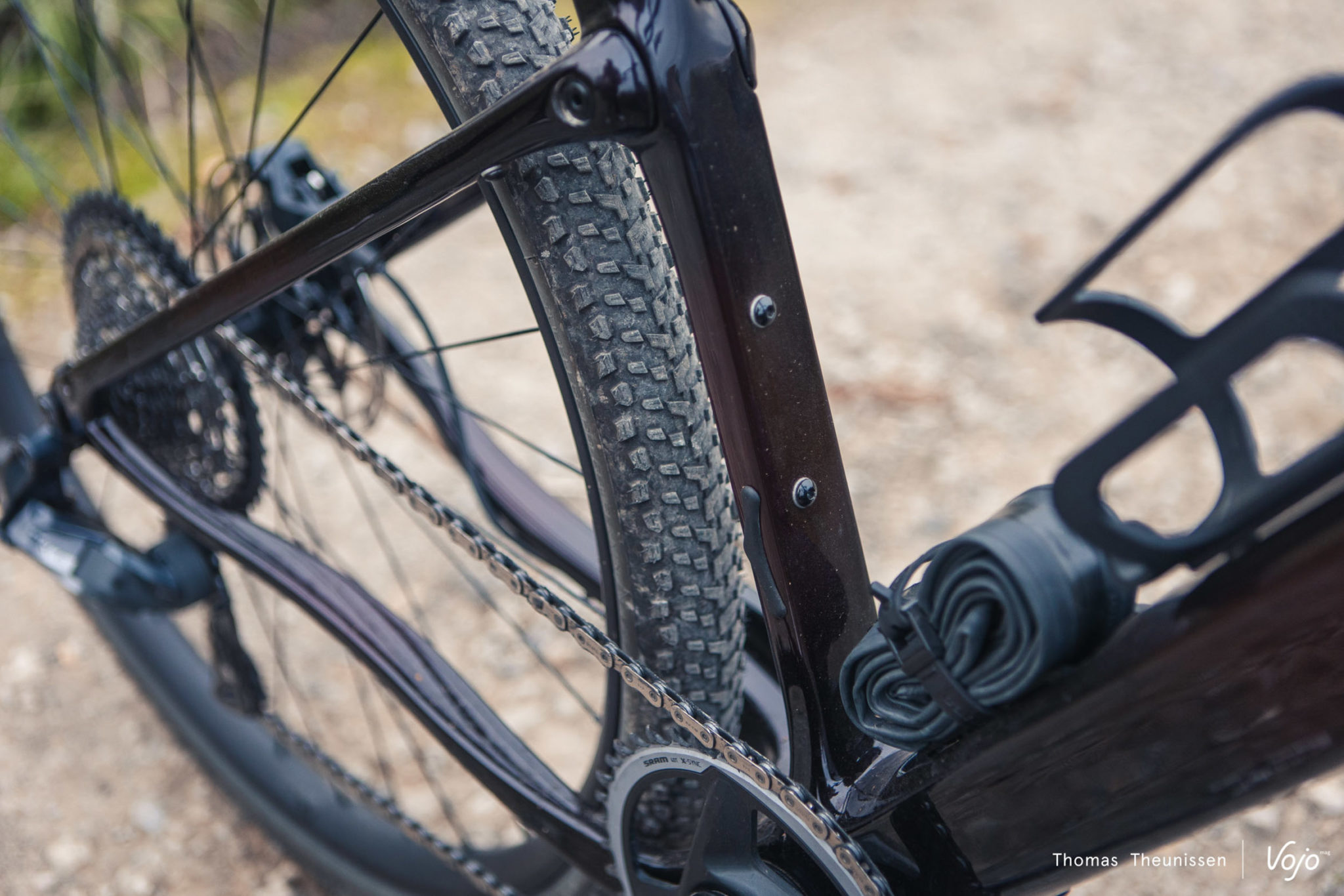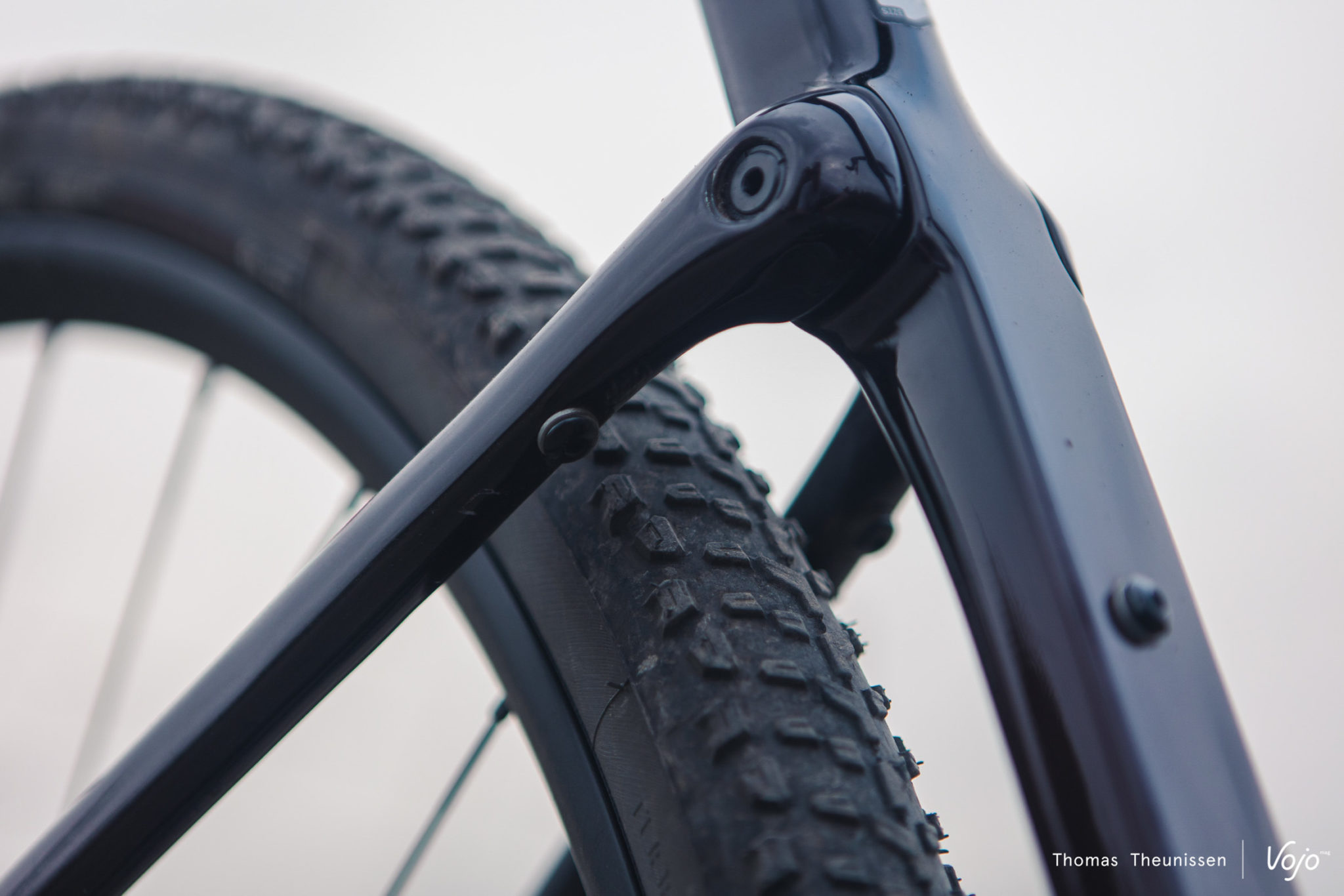Le cadre offre quant à lui un dégagement suffisant pour le montage de pneus jusqu’à 700×45, tout en conservant 6 mm de chaque côté selon la marque. Le montage de roues de 650b est aussi possible. Un passage de gaine interne est également de la partie, tout comme le support pour accueillir un garde-boue arrière.