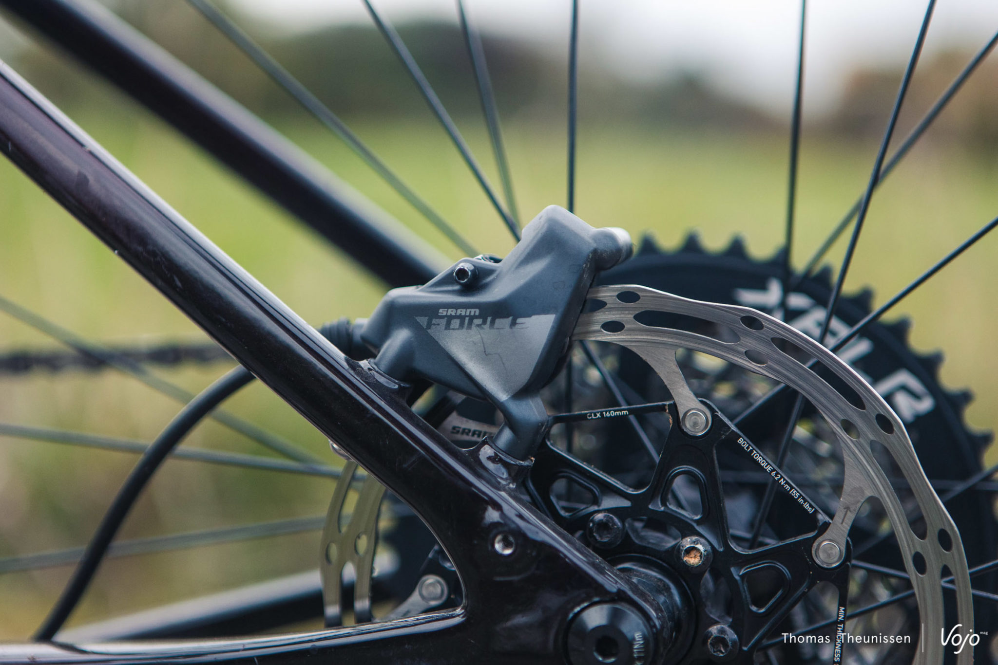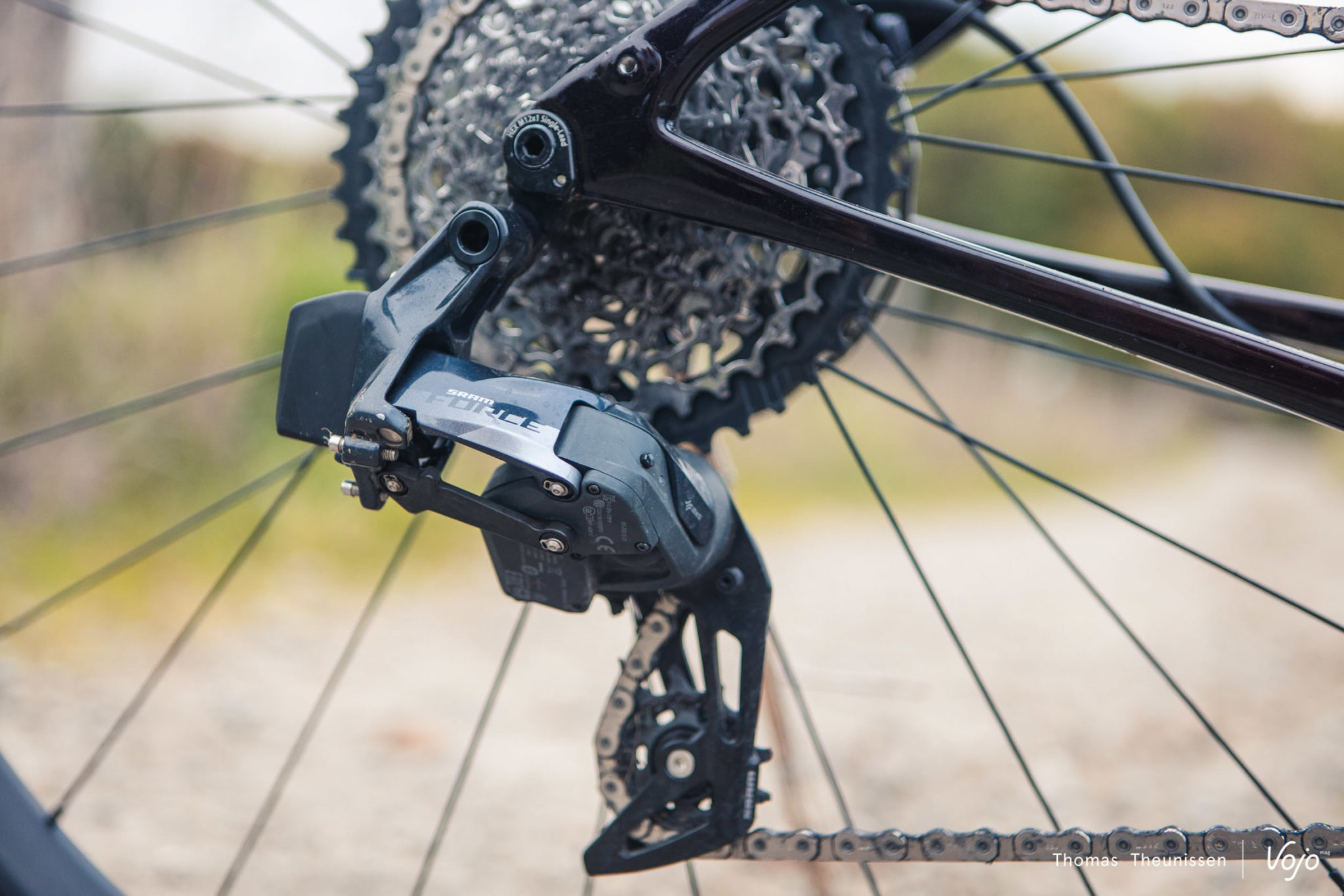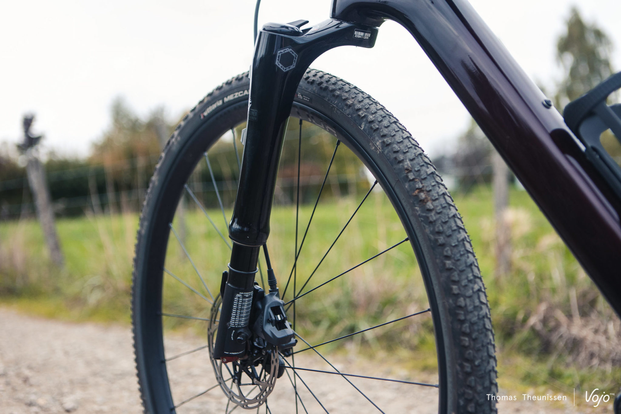 Du côté des équipements, rien à redire, le groupe Sram Force AXS XPLR fonctionne parfaitement et les changements de rapports du dérailleur électronique sont toujours aussi agréables de douceur et de précision. Avec la cassette 10-44 et le pédalier 40 dents, nous ne nous sommes pas sentis limités dans le programme du vélo. Le freinage Sram est bon, même s’il n’est pas le plus puissant. Nous avons déjà dit tout le bien que nous pensons des roues, mais au niveau du train roulant, il faut aussi souligner les excellents pneus Vittoria Mezcal qui sont solides, accrocheurs et sécurisants tout en restant vraiment roulants.