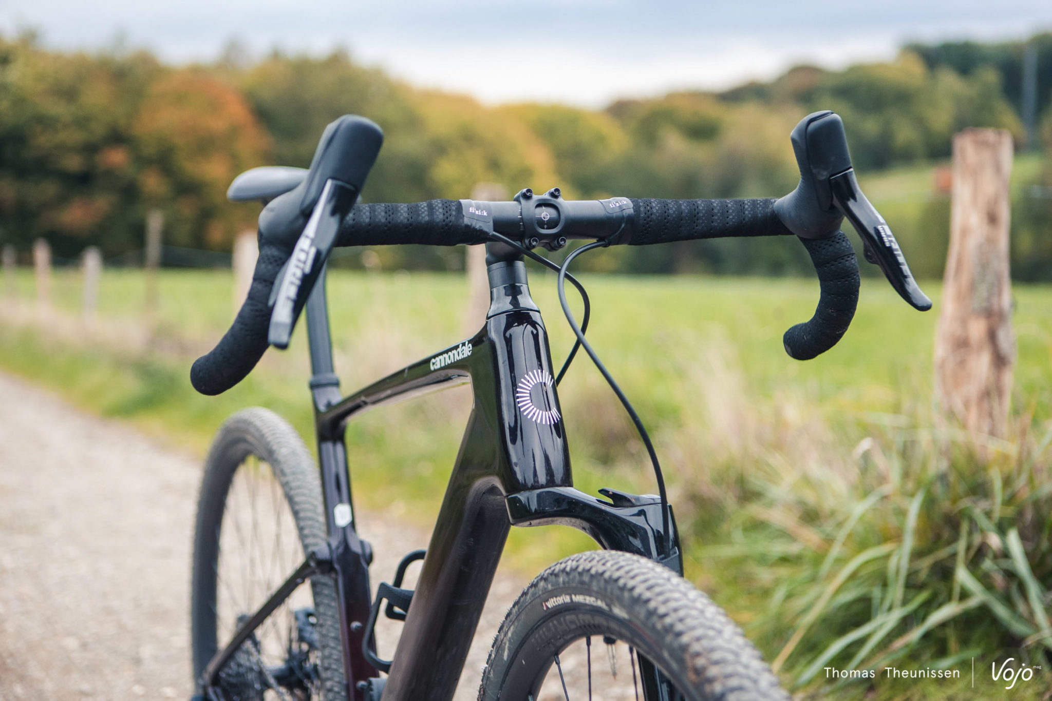 Côté poste de pilotage, la potence et le cintre sont en aluminium et en provenance de chez Cannondale. Si l’on retrouve sur certains gravels des cintres dont le flare (comprenez l’angle vers l’extérieur de la partie basse) est plutôt extrême (plus de 30°), on est ici face à un angle bien plus mesuré et passe-partout puisqu’il affiche 12° seulement. A titre de comparaison, un cintre route sera entre 0 et 4° tandis qu’un cintre de gravel commence à être réellement “typé” à partir de 20°.
