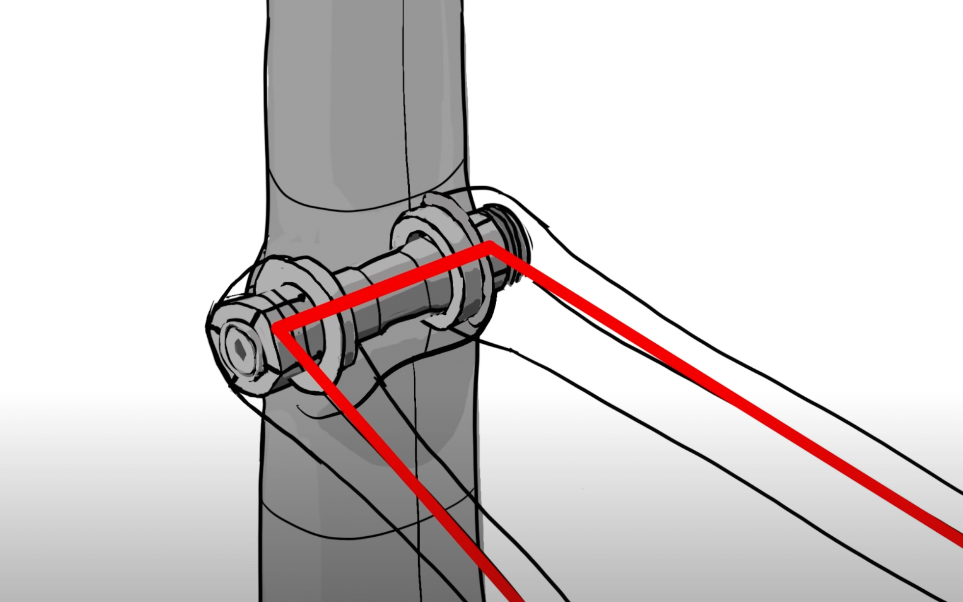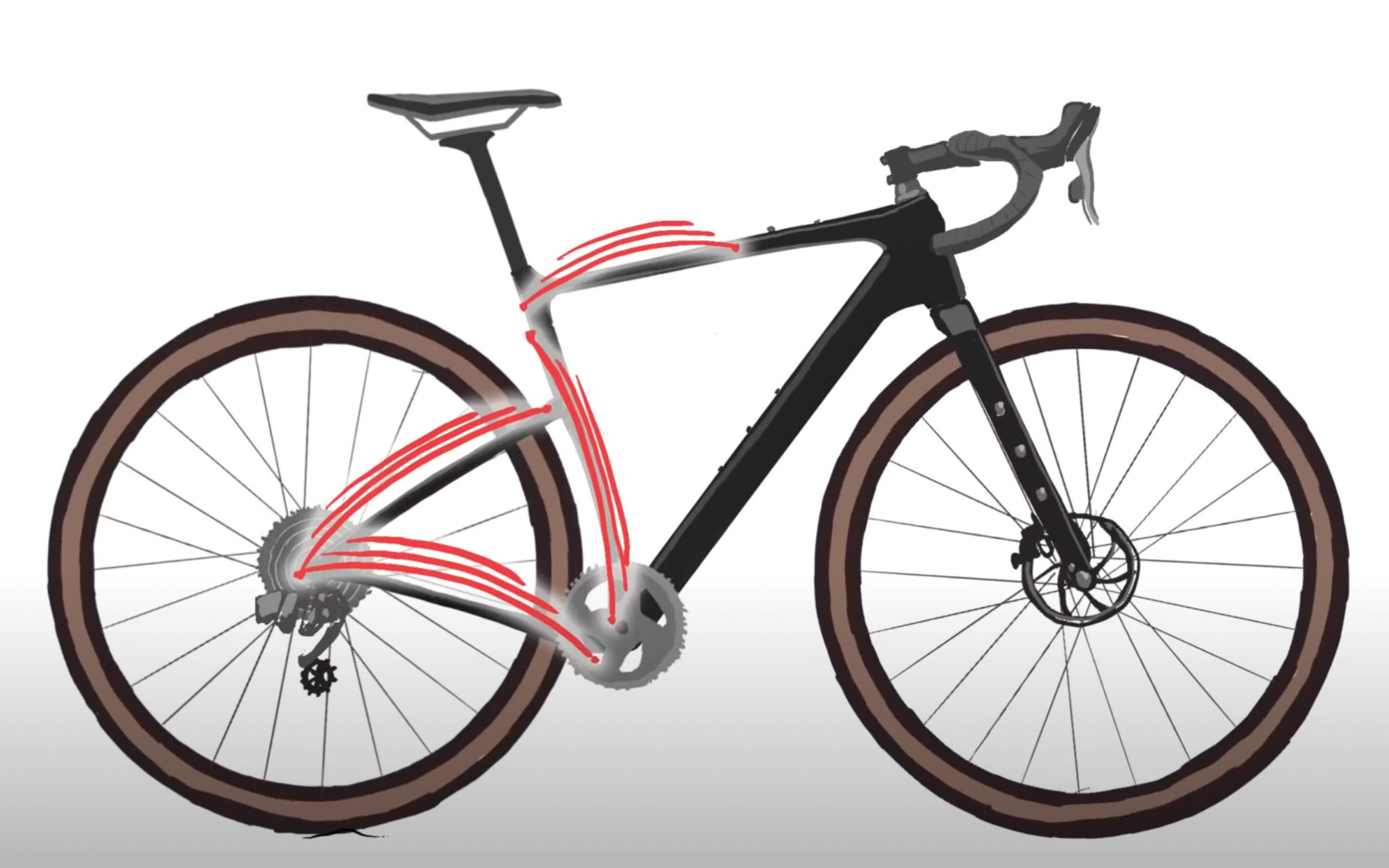 Concrètement, c’est plus un système « softail » qu’une réelle suspension. Il n’y a pas de point de pivot au niveau des bases, près du boîtier de pédalier et l’ensemble joue fortement sur la déformation du carbone. Par contre, les haubans ne sont pas solidaires du tube de selle, mais attachés au moyen d’un axe, le fameux KingSpin. Cet axe permet aux haubans d’avoir une certaine mobilité par rapport au tube de selle et au tube supérieur dont les formes complexes agissent comme un « ressort » à lames ; l’ensemble pouvant se déformer bien plus que sur un cadre au design classique.