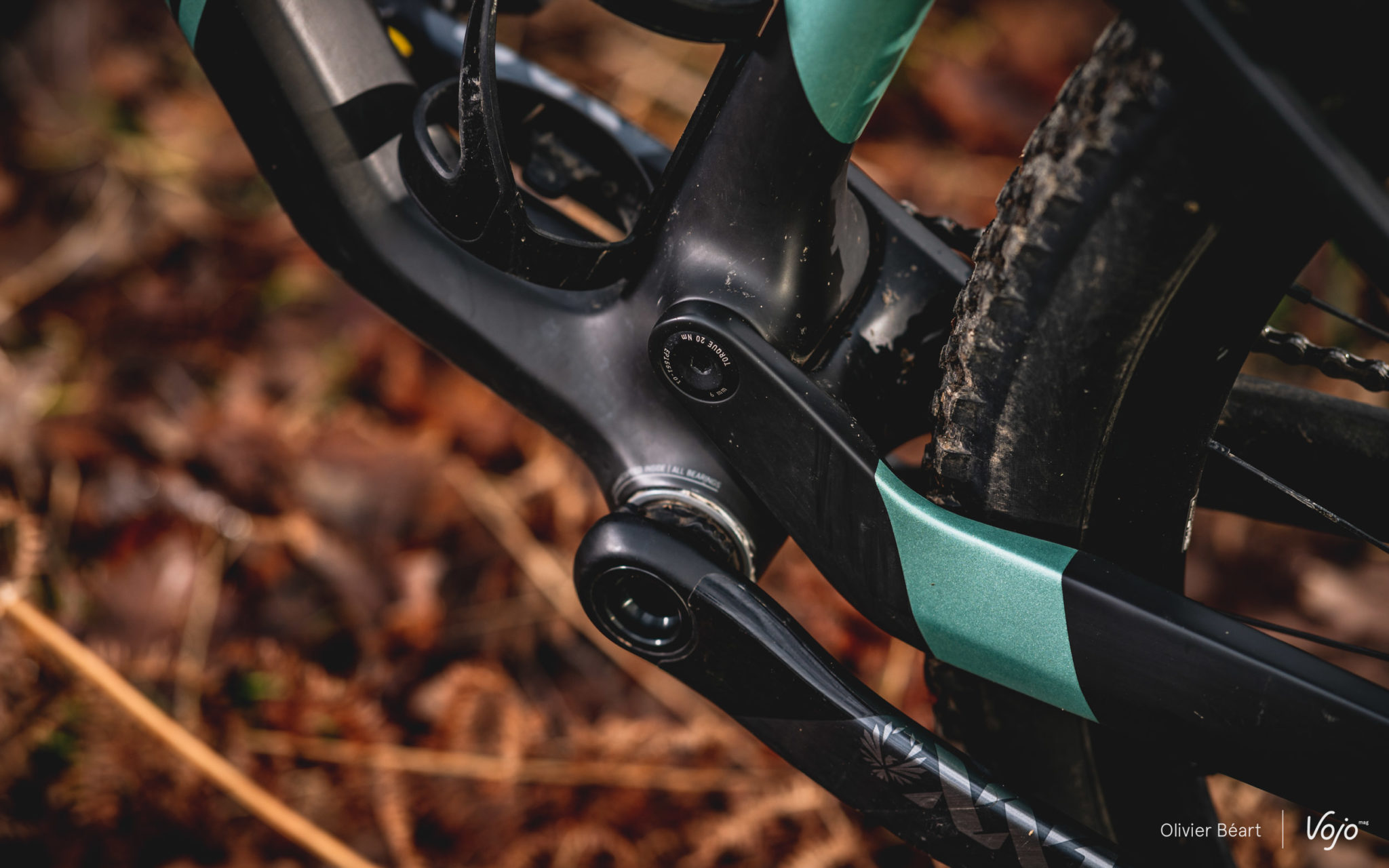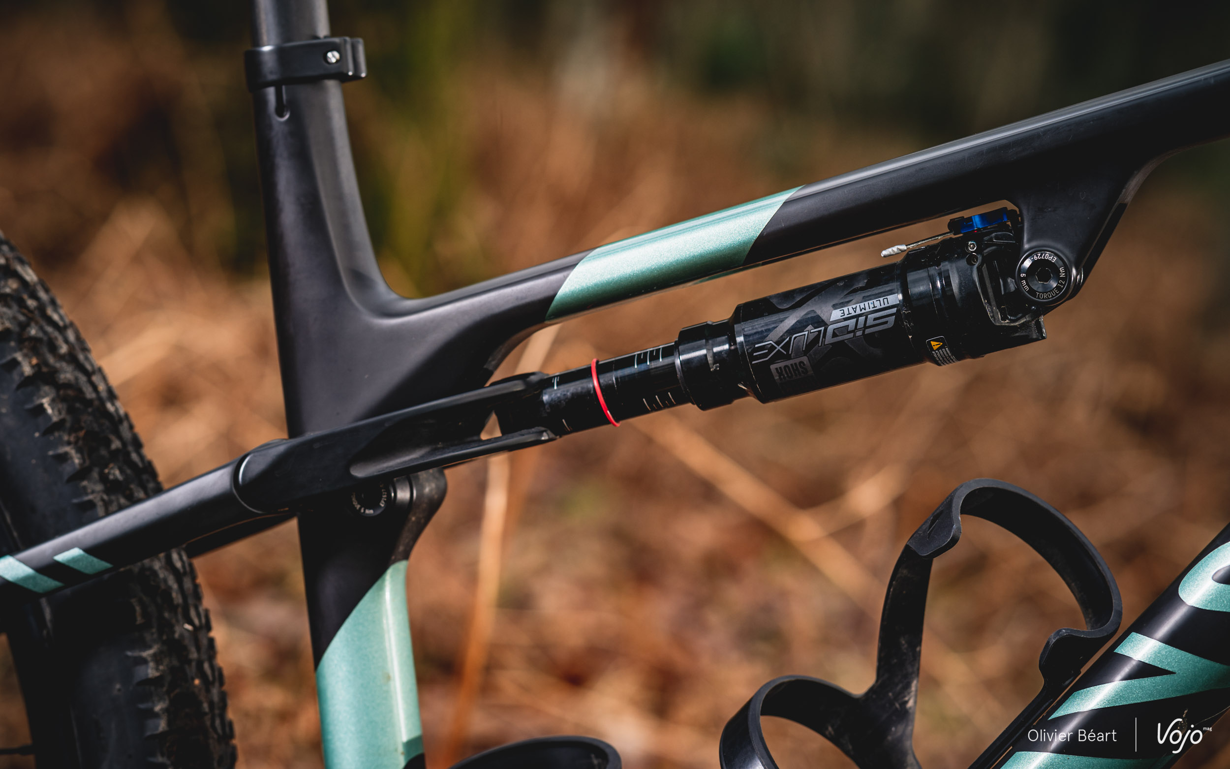 Héritage du Lux ancienne génération, la cinématique de suspension est un système de type monopivot avec biellette, associé à un triangle arrière en carbone d’une seule pièce (bases + haubans). C’est quasi devenu la norme en XC, Canyon se passe ici de point de pivot sur les haubans en jouant sur la déformation du matériau, qualifié aussi de « flex-stay ».